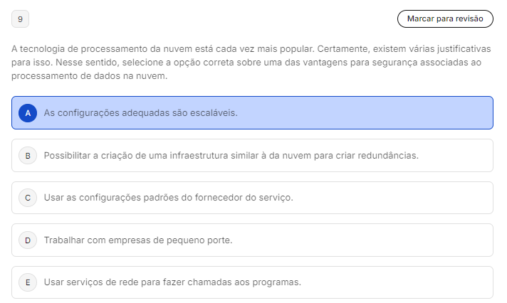 <p>9 Marcar para revisão A tecnologia de processamento da nuvem está cada vez mais popular. Certamente, existem várias justificativas para isso. Nesse sentido, selecione a opção correta sobre uma das vantagens para segurança associadas ao processamento de dados na A As configurações adequadas são B Possibilitar a criação de uma infraestrutura similar à da nuvem para criar C Usar as configurações padrões do fornecedor do serviço. D Trabalhar com empresas de pequeno porte. E Usar serviços de rede para fazer chamadas aos programas.</p>