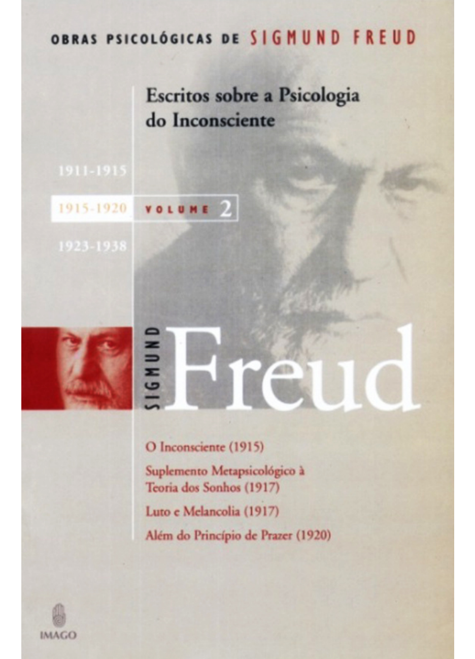 <p>OBRAS PSICOLÓGICAS DE</p><p>SIGMUND FREUD</p><p>Escritos sobre a Psicologia do Inconsciente</p><p>COORDENAÇÃO GERAL DA TRADUÇÃO:</p><p>Luiz Alberto Hanns</p><p>1915-1920 VOLUME II</p><p>OBRAS PSICOLÓGICAS DE</p><p>SIGMUND FREUD</p><p>Escritos sobre a Psicologia do Inconsciente</p><p>O Inconsciente (1915)</p><p>Suplemento Metapsicológico à Teoria dos Sonhos (1917)</p><p>Luto e Melancolia (1917)</p><p>Além do Princípio de Prazer (1920)</p><p>(Obras psicológicas de Sigmund Freud; v. 2)</p><p>Os títulos originais dos diversos trabalhos do presente volume estão</p><p>referidos nas Notas do Editor Inglês (James Strachey), que os</p><p>precedem.</p><p>Copyright under the International and Pan American Conventions.</p><p>© Portuguese Translation by IMAGO EDITORA 1969 — All rights</p><p>reserved.</p><p>© James Strachey — Annotations, editorial matter and</p><p>arrangements 1969.</p><p>Projeto Gráfico:</p><p>LUCIANA MELLO E MONIKA MAYER</p><p>CIP-Brasil. Catalogação-na-fonte</p><p>Sindicato Nacional dos Editores de Livros, RJ.</p><p>F942e Freud, Sigmund, 1856-1939</p><p>v. 2 Escritos sobre a psicologia do inconsciente, volume II:</p><p>1915-1920 / Sigmund Freud; [coordenação geral da tradução Luiz</p><p>Alberto Hanns; tradutores Claudia Dornbusch… [et al.];</p><p>colaboradores das notas Binet, Bion, Griesinger e Lacan, Luiz</p><p>Carlos Junqueira, Chaim Katz e Sonia Alberti; consultores da teoria</p><p>da tradução João Azenha Jr. E Susana Kampff Lages]. — Rio de</p><p>Janeiro: Imago Ed., 2006.</p><p>232 pp.</p><p>Conteúdo: O inconsciente (1915) — Suplemento metapsicológico à</p><p>teoria dos sonhos (1917) — Luto e melancolia (1917) — Além do</p><p>princípio de prazer (1920)</p><p>Inclui bibliografia</p><p>ISBN 978-85-312-1107-2</p><p>ISBN da Coleção 978-85-312-1105-8</p><p>1. Psicanálise. 2. Inconsciente (Psicologia).</p><p>I. Hanns, Luiz Alberto. II. Título. III. Série.</p><p>05-2833. CDD — 150.1952</p><p>CDU — 159.964.2</p><p>Reservados todos os direitos. Nenhuma parte desta obra poderá ser</p><p>reproduzida por fotocópia, microfilme, processo foto-mecânico ou</p><p>eletrônico sem permissão expressa da Editora.</p><p>2006</p><p>IMAGO EDITORA</p><p>Rua da Quitanda, 52/8º andar — Centro</p><p>20011-030 — Rio de Janeiro-RJ</p><p>Tel.: (21) 2242-0627 — Fax: (21) 2224-8359</p><p>E-mail: imago@imagoeditora.com.br</p><p>www.imagoeditora.com.br</p><p>Impresso no Brasil</p><p>Printed in Brazil</p><p>mailto:imago@imagoeditora.com.br</p><p>http://www.imagoeditora.com.br/</p><p>Coordenação geral da tradução:</p><p>Luiz Alberto Hanns</p><p>Tradutores:</p><p>Claudia Dornbusch, Helga Araujo,</p><p>Maria Rita Salzano e Luiz Alberto Hanns</p><p>Consultores para teoria da tradução:</p><p>João Azenha Jr. e Susana Kampff Lages</p><p>Sumário</p><p>Observações Preliminares</p><p>Abreviações Bibliográficas</p><p>Abreviações identificadoras das notas de fim de capítulo</p><p>Abreviações utilizadas nas notas de fim de capítulo</p><p>■ O Inconsciente 1915</p><p>Comentários editoriais da Standard Edition of the Complete</p><p>Psychological Works of Sigmund Freud</p><p>■ Suplemento Metapsicológico à Teoria dos Sonhos 1917</p><p>Comentários editoriais da Standard Edition of the Complete</p><p>Psychological Works of Sigmund Freud</p><p>■ Luto e Melancolia 1917</p><p>Comentários editoriais da Standard Edition of the Complete</p><p>Psychological Works of Sigmund Freud</p><p>■ Além do Princípio de Prazer 1920</p><p>Comentários editoriais da Standard Edition of the Complete</p><p>Psychological Works of Sigmund Freud</p><p>“Suplementos à Teoria dos Sonhos”</p><p>Comentários do Editor Brasileiro</p><p>Bibliografia</p><p>Índice de Autores e Assuntos</p><p>Observações Preliminares</p><p>A polêmica em torno da tradução de Freud há muito deixou de ser</p><p>tema exclusivo de especialistas. A maioria dos atuais leitores de</p><p>Freud está ciente de que há concepções de tradução diversas, cada</p><p>uma produzindo importantes diferenças de leitura. Assim, espera-se</p><p>que o tradutor contemporâneo apresente sua concepção de</p><p>tradução e justifique as opções terminológicas, e para tal remetemos</p><p>os interessados ao volume I (“Os Critérios de Tradução Adotados”,</p><p>pp. 15-60).</p><p>Alguns dos termos fundamentais da psicanálise que poderão ser</p><p>encontrados neste volume não foram traduzidos por uma única</p><p>palavra, mas por diversas palavras empregadas alternadamente.</p><p>Assim, por exemplo, dependendo do contexto, Vorstellung foi</p><p>traduzida por “representação”, “idéia”, “noção”, “concepção” e</p><p>“imagem”, entre outras alternativas — todas, sempre que</p><p>necessário, seguidas do termo alemão entre colchetes. No caso</p><p>específico de Vorstellung, constata-se que, por vezes, a acepção de</p><p>“representação” se refere a uma única representação simples, por</p><p>outras, a um complexo de representações simples que compõem</p><p>uma frase ou idéia.</p><p>Consideramos importante manter a riqueza e as variações de</p><p>sentido da palavra e evitar que se falseie sua leitura como se se</p><p>tratasse de um conceito psicanalítico bem-acabado e definido. No</p><p>texto de Freud, uma mesma palavra é com freqüência empregada</p><p>no sentido corrente (sem carga conceitual) e, em outros contextos,</p><p>numa acepção mais rigorosa e conceitual (ver nossas observações</p><p>sobre “trama semântico-conceitual” no vol. I, pp. 15-24).</p><p>Também outros termos que nas últimas décadas têm sido</p><p>traduzidos sempre por uma mesma palavra em português, por</p><p>exemplo, Genuss (“gozo”), Abfuhr (“descarga”), Bedürfnis</p><p>(“necessidade”), na presente tradução poderão aparecer,</p><p>respectivamente, como “fruição” ou “deleite” [Genuss],</p><p>“esvaziamento” ou “remoção” [Abfuh