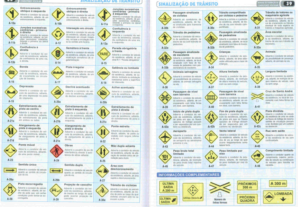 <p>CONDUTORES VEICULAR SINALIZAÇÃO DE TRÂNSITO MANUAL 39 CONDUTORES VEICULAR Entroncamento Entroncamento sucessivas obliquo à esquerda obliquo à direita contrárias primeira Adverte condutor do à esquerda Passagem sinalizada Trânsito compartilhado de tratores ou Adverte condutor do Adverte condutor do de ciclistas por ciclistas e pedestres agrícola da de um da de um esquerda direita da existência de jun- Adverte condutores da Adverte ciclista Adverte condutor do sucessivas A-10a estando primeira via lateral de fai- da de tre- da existência adiante. de A-10b A-11a cal de cruzamento esquerda xa sinalizada para travessia cho de via com tränsito com- eventual de toda espécie de Junções sucessivas Interseção em circulo A-30b de A-30c partilhado Confluência à A-31 tratores máquinas contrárias primeira à direita Adverte condutor do esquerda Trânsito de pedestres Passagem sinalizada escolar Adverte condutor do da de uma Adverte condutor do vei- da de jun- Adverte condutor do de pedestres interseção em circulo Adverte condutor do veícu- da coes sucessivas na qual fei- da confluência de uma via da de Adverte conduto do da de A-11b estando primeira via lateral A-12 ta no sentido A-13a esquerda trecho de via com de da de local trecho de via com de pedestres sinalizado com faixa de Confluência à à frente A-32a A-32b sia de pedestres direita Parada obrigatória A-33a Adverte condutor do à frente Passagem sinalizada Crianças Animais Adverte condutor do da de uma PARE Adverte condutor do de escolares culo da adiante Adverte condutor da exis- Adverte condutor do da confluência de uma sinalização semafórica de re- da de um Adverte condutor do de adja- gulamentação sinal R-1 da possibilidade de da existência de local A-13b cente utilizada para lazer de de animais na via A-14 A-15 sinalizado com de tra- crianças vessia de pedestres com pre- Bonde Pista irregular Saliência ou lombada A-33b de escolares A-34 A-35 Adverte condutor do Adverte condutor do Adverte condutor do Animais selvagens Altura limitada Largura limitada culo da da de um da de sa de cruzamento ou circula- trecho de pista irregular lombada ou ondulação Adverte condutor do veículo Adverte condutor da Adverte condutor da de 4,0 transversal a superficie da possibilidade de presença de restrição de restrição de A-16 A-17 A-18 de de selvagens de altura do gura do com com ou sem carga ou Depressão Declive acentuado acentuado A-36 A-37 A-38 Adverte condutor do vei- Adverte condutor do Adverte condutor do vei- Passagem de nível Passagem de nível Cruz de Santo Andre culo da culo da culo da sem barreira com barreira de uma depressão na pista de declive acentuado Adverte condutor do de aclive acentuado de rolamento Adverte condutor do veículo Adverte condutor do veículo da existência no local de cru- A-19 da de um da de um zamento com linha férrea em A-20a A-20b cruzamento com linha cruzamento com linha Estreitamento de Estreitamento de Estreitamento de A-39 em sem A-40 em com A-41 pista ao centro pista à esquerda pista à direita Adverte condutor do vei- de pista dupla Fim de pista dupla Pista dividida Adverte condutor do Adverte condutor do culo da Adverte condutor do Adverte condutor do condutor do veículo da culo da de estreitamento da pista culo da culo da da existência de uma via onde de estreitamento de pista A-21a em ambos os de estreitamento de pista de pista em que os fluxos de pista em que os fluxos fluxos de de mesmo A-21b esquerda A-21c direita opostos de passam opostos de deixam sentido de circulação passam Alargamento de separados por um can- de ser separados por um ser divididos por um canteiro Alargamento de Ponte estreita A-42a ou A-42b canteiro ou A-42c pista à esquerda pista à direita Adverte condutor do Adverte 0 condutor do Adverte ao condutor da exis Aeroporto Vento lateral Rua sem culo da culo da de ponte ou Adverte condutor do Adverte do veículo RUA viaduto com largura inferior Adverte condutor do veicu- de alargamento de pista de alargamento de pista da de SEM culo da da existência de via sem A-21d direita A-22 cho de via ao longo do qual SAÍDA A-21e de aeroporto ou continuidade próximo via ocorre vento Ponte móvel Obras Mão dupla adiante lateral forte A-43 A-44 Adverte condutor do Adverte da via de culo da interferência devido Adverte condutor do Peso bruto total Peso limitado por Comprimento limitado da de de uma ponte limitado eixo de obras ração do sentido de Adverte 0 condutor quanto ao culação para 10t Adverte condutor da Adverte condutor da exis- comprimento permi- A-23 A-24 A-25 de restrição de restrição tido do ou combinação de peso bruto total de peso limitado por eixo do de veículos para transitar na Sentido único Sentido duplo Area com A-46 A-47 A-48 Adverte condutor do veículo Adverte conduto do desmoronamento quanto an sentido de circula- quanto ao sentido de Adverte condutor do da de INFORMAÇÕES COMPLEMENTARES A-26a sujeita desmonoramento A-26b A-27 Pista escorregadia Projeção de cascalho PRÓXIMOS A 300 m Transito de ciclistas Adverte condutor do veículo SAÍDA Adverte condutor do 300 m Adverte condutor do da de tre culo da adiante cho da pista em certas da existência de de trecho ao longo do qual cho de pista longo do LOMBADA condições pode es- pode ocorrer de ciclistas circulam pela A-28 corregadia A-29 cascalho A-30a Utilize Desvio PRÓXIMA cruzam Numero de SAÍDA QUADRA linhas férreas</p>