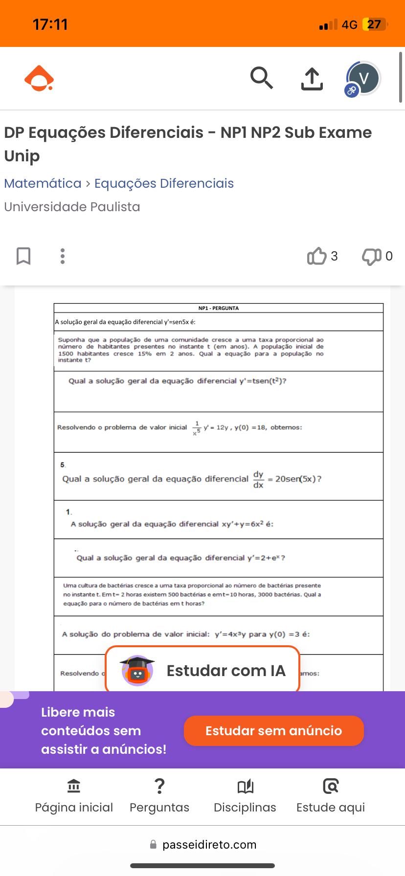 <p>17:11 4G 27 V DP Equações Diferenciais - NP1 NP2 Sub Exame Unip Matemática > Equações Diferenciais Universidade Paulista 3 0 PERGUNTA A solução geral da equação diferencial y'=sen5x é: Suponha que a população de uma comunidade cresce a uma taxa proporcional ao de habitantes presentes no instante t (em anos). A população inicial de 1500 habitantes cresce 15% em 2 anos. Qual a equação para a população no instante t? Qual a solução geral da equação diferencial y'=tsen(t2)? Resolvendo problema de valor inicial 18, obtemos: 5 dy Qual a solução geral da equação diferencial = 20sen(5x)? dx 1. A solução geral da equação diferencial é: Qual a solução geral da equação diferencial y'=2+e*? Uma cultura de bactérias cresce a uma taxa proporcional ao número de bactérias presente no instante t. 2 horas existem 500 bactérias e horas, 3000 Qual a equação para de bactérias em t horas? A solução do problema de valor inicial: y'=4x3y para y(0) =3 é: Resolvendo Estudar com IA amos: Libere mais conteúdos sem Estudar sem anúncio assistir a anúncios! ? Q Página inicial Perguntas Disciplinas Estude aqui passeidireto.com</p>