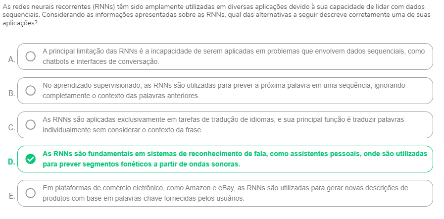 <p>As redes neurais recorrentes (RNNs) têm sido amplamente utilizadas em diversas aplicações devido à sua capacidade de lidar com dados sequenciais. Considerando as informações apresentadas sobre as qual das alternativas a seguir descreve corretamente uma de suas aplicações? A principal limitação das RNNs é a incapacidade de serem aplicadas em problemas que envolvem dados sequenciais, como A. chatbots e interfaces de conversação. No aprendizado supervisionado, as RNNs são utilizadas para prever a próxima palavra em uma sequência, ignorando B. completamente contexto das palavras As RNNs são aplicadas exclusivamente em tarefas de tradução de e sua principal função é traduzir palavras C. individualmente sem considerar o contexto da frase. As RNNs são fundamentais em sistemas de reconhecimento de fala, como assistentes pessoais, onde são utilizadas D. para prever segmentos fonéticos a partir de ondas sonoras. Em plataformas de como Amazon e eBay, as RNNs são utilizadas para gerar novas descrições de E. produtos com base em palavras-chave fornecidas pelos</p>