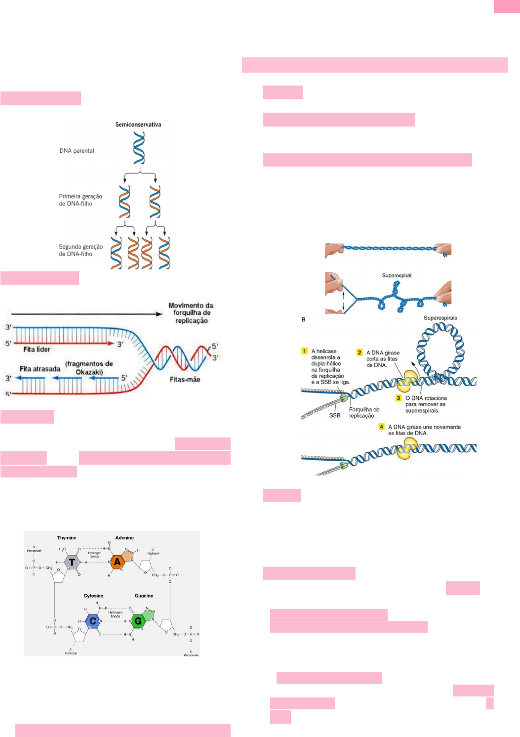 <p>Manoela Melo MEDPUC 89 – Monitoria Genética</p><p>1 Genoma Humano e Patologia Molecular</p><p>Replicação do DNA</p><p> Ocorre durante a fase S da interfase</p><p> Forma 2 moléculas idênticas à original</p><p> Semiconservativa ➝ Cada uma das moléculas</p><p>finais é composta por 1 fita parental e 1 nova</p><p> Semidescontínua ➝ 1 fita contínua e 1 fita</p><p>descontínua</p><p> Antiparalela ➝ Segue a direção 3' para 5’ da fita</p><p>existente para sintetizar do 5' para o 3' da nova</p><p> Inicia-se em pontos chamados origens de</p><p>replicação ➝ Regiões eucromatinizadas com</p><p>sequência de AT</p><p>o Menos ligações de H+ entre A-T (2 LH entre A-T,</p><p>entre C-G são 3) ➝ Mais fácil rompê-las para</p><p>iniciar o processo</p><p>o +- 10.000 origens de replicação por cromossomo</p><p>➝ Economia de tempo para replicar o DNA todo</p><p> Forma-se uma bolha de replicação</p><p>o Forquilha de replicação = metade da bolha</p><p> As polimerases atuam somente no sentido 5' ➝ 3'</p><p>(da nova fita)</p><p>o A menos que estejam atuando para revisão,</p><p>reparo etc.</p><p>Etapas</p><p> Helicase ➝ Reconhece as origens de replicação,</p><p>rompe as pontes de H+ e desfaz a dupla hélice</p><p> SSB (Ligantes de fita simples) ➝ Impedem o</p><p>fechamento (reestruturação) da dupla-hélice aberta</p><p>pela helicase</p><p> Topoisomerase/DNA-Girase/Anel deslizante ➝</p><p>Impede a super helicoidização (nó) do restante da</p><p>dupla fita</p><p>o Cliva a ligação fosfodiéster de 1 das fitas,</p><p>permitindo que o DNA rotacione (relaxando) e</p><p>religa a fita antes da helicase avançar</p><p> Primase ➝ Adiciona um primer de RNA para iniciar</p><p>o processo, já que a polimerase só reconhece fita</p><p>dupla (a DNA pol III não é capaz de iniciar uma</p><p>cadeia, só de estendê-la)</p><p>o Age 1 vez na fita contínua e várias na fita</p><p>descontínua</p><p> DNA polimerase III ➝ Reconhece a região do</p><p>primer e inicia a síntese da nova fita (5' ➝ 3') a</p><p>partir da adição de dNTPs (nucleotídeos de DNA)</p><p>o Fita contínua/líder/leading</p><p>o Fita descontínua/retardada/lagging</p><p> Cada primer é ligado com o DNA que é</p><p>sintetizado a partir dele, mas o próximo primer</p><p>não se liga ao DNA já sintetizado, gerando</p><p>fragmentos de Okazaki</p><p>o A DNA pol III também tem uma atividade</p><p>exonucleásica (removedora de nucleotídeos) 3'</p><p>➝ 5’</p><p>Manoela Melo MEDPUC 89 – Monitoria Genética</p><p>2 Genoma Humano e Patologia Molecular</p><p> Dá um passo para trás cada vez que dá um</p><p>passo para frente ➝ Revisão</p><p> DNA polimerase I ➝ Remove os primers de RNA e</p><p>substitui pelos trechos de DNA correspondentes</p><p> Ligase ➝ Conecta os fragmentos de Okazaki</p><p>o Não age nenhuma vez na fita contínua (já que ela</p><p>não tem fragmentos de Okazaki)</p><p> Telomerase ➝ “Estica” os telômeros</p><p>(extremidades) da fita retardatária para evitar a</p><p>perda de DNA, já que as polimerases não</p><p>conseguem substituir o último primer pela falta de</p><p>uma extremidade 3’OH</p><p>o Ativa em células embrionárias</p><p>o Reativação na idade adulta gera câncer</p><p>o Clone Dolly ➝ Morreu jovem por velhice porque</p><p>as células utilizadas para clonagem já eram</p><p>velhas inicialmente</p>