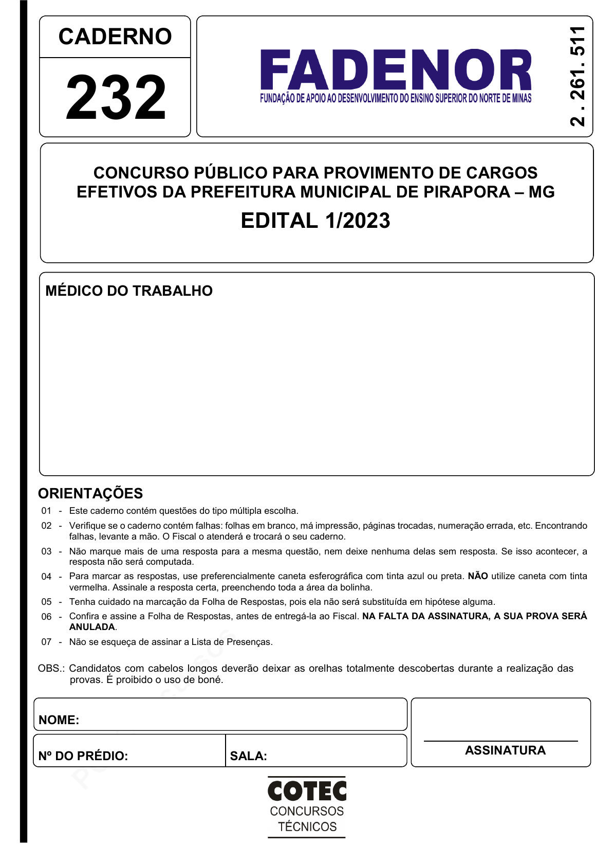 <p>pcimarkpci MjgwNDowMzg5OmIxNjM6NmRmMDowYzY2OjJjNzI6YmI3NDo4YmIz:TW9uLCAxNiBTZXAgMjAyNCAxMjo1OToxOCAtMDMwMA==</p><p>www.pciconcursos.com.br0</p><p>CONCURSO PÚBLICO PARA PROVIMENTO DE CARGOS</p><p>EFETIVOS DA PREFEITURA MUNICIPAL DE PIRAPORA – MG</p><p>EDITAL 1/2023</p><p>ORIENTAÇÕES</p><p>01 - Este caderno contém questões do tipo múltipla escolha.</p><p>02 - Verifique se o caderno contém falhas: folhas em branco, má impressão, páginas trocadas, numeração errada, etc. Encontrando</p><p>falhas, levante a mão. O Fiscal o atenderá e trocará o seu caderno.</p><p>03 - Não marque mais de uma resposta para a mesma questão, nem deixe nenhuma delas sem resposta. Se isso acontecer, a</p><p>resposta não será computada.</p><p>04 - Para marcar as respostas, use preferencialmente caneta esferográfica com tinta azul ou preta. NÃO utilize caneta com tinta</p><p>vermelha. Assinale a resposta certa, preenchendo toda a área da bolinha.</p><p>05 - Tenha cuidado na marcação da Folha de Respostas, pois ela não será substituída em hipótese alguma.</p><p>06 - Confira e assine a Folha de Respostas, antes de entregá-la ao Fiscal. NA FALTA DA ASSINATURA, A SUA PROVA SERÁ</p><p>ANULADA.</p><p>07 - Não se esqueça de assinar a Lista de Presenças.</p><p>OBS.: Candidatos com cabelos longos deverão deixar as orelhas totalmente descobertas durante a realização das</p><p>provas. É proibido o uso de boné.</p><p>CADERNO</p><p>232</p><p>MÉDICO DO TRABALHO</p><p>NOME:</p><p>Nº DO PRÉDIO: SALA: ASSINATURA</p><p>2</p><p>.</p><p>2</p><p>6</p><p>1</p><p>.</p><p>5</p><p>1</p><p>1</p><p>pcimarkpci MjgwNDowMzg5OmIxNjM6NmRmMDowYzY2OjJjNzI6YmI3NDo4YmIz:TW9uLCAxNiBTZXAgMjAyNCAxMjo1OToxOCAtMDMwMA==</p><p>www.pciconcursos.com.br1</p><p>PROVA DE CONHECIMENTOS ESPECÍFICOS</p><p>QUESTÃO 01</p><p>Analise as afirmativas a seguir sobre a comunicação de acidente de trabalho (CAT).</p><p>I – A CAT deve ser imediata, em caso de morte.</p><p>II – A CAT é realizada apenas em acidente de trabalho, não incluindo casos de acidente de trajeto e nem doença</p><p>ocupacional.</p><p>III – O sindicato ou o médico que prestou o atendimento pode realizar a CAT, caso a empresa não a faça.</p><p>Está CORRETO o que se afirma em</p><p>A) I, apenas.</p><p>B) I e II, apenas.</p><p>C) I e III, apenas.</p><p>D) II e III, apenas.</p><p>E) III, apenas.</p><p>QUESTÃO 02</p><p>É vedado ao médico</p><p>A) revelar sigilo profissional relacionado a paciente adolescente, sem capacidade de discernimento, a seus pais ou a</p><p>representantes legais.</p><p>B) revelar informações confidenciais obtidas em exame médico de trabalhadores, após exigência dos dirigentes da</p><p>empresa, mesmo que o silêncio coloque em risco a saúde da comunidade.</p><p>C) prestar informações a empresas seguradoras sobre as circunstâncias da morte de seu paciente, além das contidas</p><p>na D.O., mesmo com o consentimento do seu representante legal.</p><p>D) deixar de guardar o sigilo profissional na cobrança de honorários, independentemente de o trâmite ocorrer por meio</p><p>judicial ou extrajudicial.</p><p>E) revelar fato de que tenha conhecimento em virtude do exercício de sua profissão, salvo por motivo justo, dever legal</p><p>ou consentimento oral do paciente.</p><p>QUESTÃO 03</p><p>Considere as afirmativas a seguir sobre o atestado médico e a Resolução do Conselho Federal de Medicina (CFM) n.º</p><p>1.658/2002, e marque a alternativa CORRETA.</p><p>A) Os médicos somente podem fornecer atestados com o diagnóstico codificado (CID), mesmo com solicitação do</p><p>próprio paciente ou de seu representante legal para que não o faça.</p><p>B) Apenas aos médicos, no estrito âmbito de sua profissão, é facultada a prerrogativa de fornecimento de atestado de</p><p>afastamento do trabalho.</p><p>C) O atestado médico é parte integrante do ato médico, sendo o seu fornecimento direito alienável do paciente, não</p><p>podendo importar em qualquer majoração de honorários.</p><p>D) O atestado solicitado para fins de perícia médica deve conter: o diagnóstico; a conduta terapêutica; o tempo de</p><p>repouso estimado; a decisão do benefício previdenciário: aposentadoria, invalidez definitiva ou readaptação.</p><p>E) Aos médicos é obrigatória a exigência da prova de identidade para os interessados em obter atestados de qualquer</p><p>natureza envolvendo assuntos de saúde ou doença.</p><p>QUESTÃO 04</p><p>Em relação aos equipamentos de proteção individual (EPI), é CORRETO afirmar:</p><p>A) A primeira medida de proteção coletiva, em locais de trabalho com exposição intermitente a ruídos máximos de</p><p>80dB, deve ser o fornecimento do EPI, no caso o protetor auditivo.</p><p>B) O empregador é responsável por fornecer gratuitamente os EPI adequados aos riscos, as orientações e o</p><p>treinamento ao trabalhador, exigir o seu uso e substituir imediatamente os danificados ou extraviados.</p><p>C) O EPI de fabricação nacional só pode ser posto à venda ou utilizado com a indicação do Certificado de Aprovação</p><p>(CA), expedido pelo órgão de âmbito nacional competente, diferentemente do EPI importado.</p><p>D) O empregador é responsável, em relação aos EPI, por armazenar, higienizar, conservar, consertar e utilizar seus</p><p>equipamentos diariamente, no exercício de sua profissão.</p><p>E) O creme protetor, assim como a manga, para a proteção dos membros superiores contra agentes químicos e</p><p>choques elétricos, não são EPI, pois são equipamentos de proteção coletiva (EPC).</p><p>INSTRUÇÃO: Considere o caso clínico a seguir para responder à questão 05.</p><p>João, 65 anos, procura a Unidade de Saúde da Família com queixa de cansaço aos esforços, presente há vários</p><p>meses, mas com piora nas últimas semanas. Nega tabagismo, etilismo ou uso de medicações. Refere estar</p><p>aposentado há cinco anos, tendo trabalhado por 20 anos em uma fáb