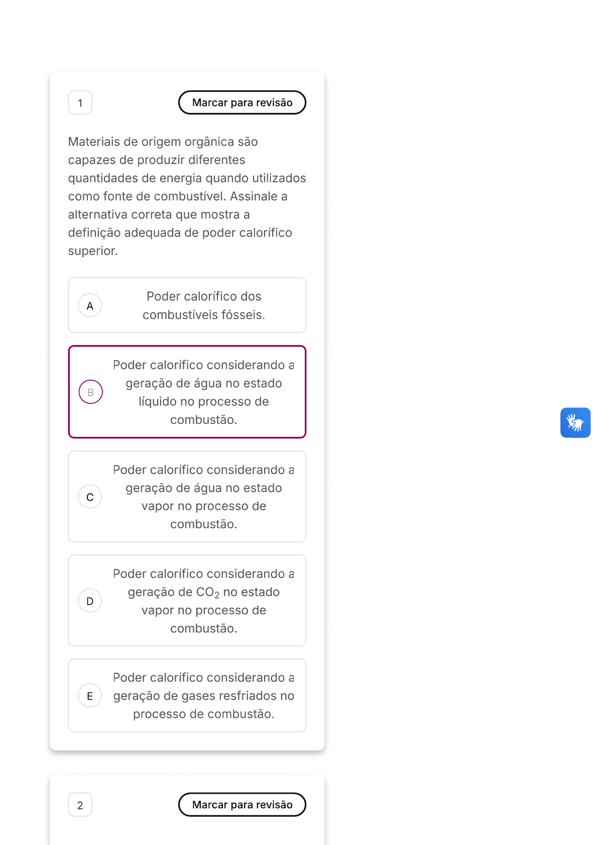 <p>1 Marcar para revisão Materiais de origem orgânica são capazes de produzir diferentes quantidades de energia quando utilizados como fonte de combustível. Assinale a alternativa correta que mostra a definição adequada de poder calorífico superior. Poder calorífico dos A combustíveis fósseis. Poder calorífico considerando a geração de água no estado B líquido no processo de combustão. Poder calorífico considerando a geração de água no estado C vapor no processo de combustão. Poder calorífico considerando a geração de CO2 no estado D vapor no processo de combustão. Poder calorífico considerando a E geração de gases resfriados no processo de combustão. 2 Marcar para revisão</p><p>Além da decomposição de resíduos orgânicos em aterros, o lixo das cidades pode utilizar outras rotas energéticas para seu aproveitamento. Uma das rotas é a pirólise. Assinale a alternativa que mostra dois produtos obtidos na pirólise de resíduos sólidos. A Gás de síntese e gás metano. Gás metano e fertilizante B orgânico. C Bio-óleo e biochar. D Bio-óleo e chorume. E Gás metano e gás propano. 3 Marcar para revisão Os aterros sanitários são locais para a geração de energia. Assinale a alternativa que mostra dois produtos da decomposição dos resíduos orgânicos. A Gás metano e chorume. B Gás de síntese e biochar. C Gás propano e bio-óleo.</p><p>D Bio-óleo e biochar. E Carvão vegetal e cinzas. 4 Marcar para revisão A biodigestão, utilizada em fazendas agropecuárias de grande porte, gera como principal produto energético o gás metano. Assinale a alternativa que mostra a principal fonte de alimentação para o processo de biodigestão. A Restos de capim. B Resíduos plásticos. Carcaça de animais mortos na C criação. D Esterco de gado. E Carvão vegetal. 5 Marcar para revisão Um importante processo para a obtenção de produtos energéticos a partir da biomassa é a pirólise. Esse processo pode ser realizado em um reator no qual a biomassa é comprimida contra discos rotativos em altas temperaturas. Assinale</p><p>a alternativa que indica o tipo de pirólise realizada no equipamento descrito. Pirólise em leito fluidizado A borbulhante. Pirólise em leito fluidizado B circulante. C Pirólise ablativa. D Pirólise em reator cone rotativo. E Pirólise em leito fixo. 6 Marcar para revisão As usinas termoelétricas que utilizam biomassa como fonte de combustível apresentam um crescimento significativo, em virtude do potencial de geração e das ações para a preservação ambiental. Assinale a alternativa que indica um resíduo importante da indústria de açúcar e álcool utilizado como importante fonte de biomassa para a geração de energia elétrica em termoelétricas. A Bagaço de cana. B Palha de cana. C Vinhoto.</p><p>D Resíduo de fermentação. E Resíduo de açúcar. 7 Marcar para revisão As caldeiras, também chamadas de geradores de vapor, são equipamentos bastante importantes para a geração de energia como calor, de forma direta. Assinale o processo energético correto que é utilizado na geração direta de energia para ser utilizada em uma caldeira. A Pirólise da biomassa. B Combustão. C Gaseificação. D Fermentação. Tecnologias De Geração De Sair e Exercício T finalizar Energia a Partir De Biomassa depois Questão 10 de 10 8 Marcar para revisão 1 2 3 4 5 A incineração de lixo é uma alternativa para a geração de energia. Em países 6 7 8 9 10 desenvolvidos, modernas usinas de incineração são responsáveis pelo Respondidas (10) Em branco (0) destino dos resíduos sólidos e por fornecer uma parcela significativa de</p><p>energia para as cidades. Assinale a alternativa que representa a rota energética utilizada pelas usinas de incineração. A Gaseificação. B Pirólise. C Biodigestão. D Fermentação. E Combustão. 9 Marcar para revisão Existem diferentes designs de reatores para o processo de pirólise de biomassa. Assinale a alternativa que mostra as principais vantagens dos reatores de leito fluidizado em relação aos reatores de leito fixo. Operam em baixas faixas de A temperatura. Operam com a biomassa fixa B em uma grade. Não utilizam combustíveis e não C precisam de aquecimento.</p><p>Apresentam uma operação mais D simples. Apresentam maior contato entre E as partículas sólidas e os gases. 10 Marcar para revisão Existem diferentes designs de reatores para o processo de pirólise de biomassa. Assinale a alternativa correta quanto à classificação dos reatores de leito fluidizado. A Leito cônico e leito rotativo. B Leito a vapor e leito pirolítico. C Leito ablativo e leito de grelha. Leito borbulhante e leito D circulante. E Leito aquecido e leito resfriado.</p>