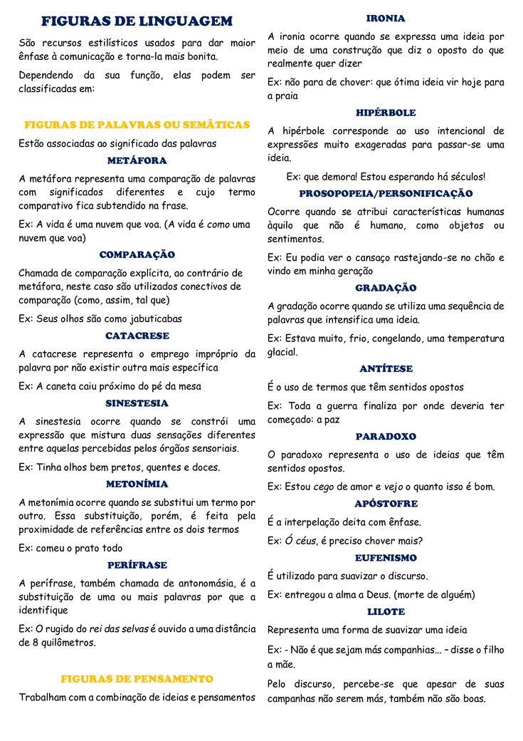 <p>FIGURAS DE LINGUAGEM IRONIA A ironia ocorre quando se expressa uma ideia por São recursos estilísticos usados para dar maior meio de uma construção que diz 0 oposto do que à comunicação e torna-la mais bonita. realmente quer dizer Dependendo da sua função, elas podem ser Ex: não para de chover: que ótima ideia vir hoje para classificadas em: a praia HIPÉRBOLE FIGURAS DE PALAVRAS OU SEMÂTICAS A hipérbole corresponde uso intencional de Estão associadas ao significado das palavras expressões muito exageradas para passar-se uma METÁFORA ideia. A representa uma comparação de palavras Ex: que demora! Estou esperando há séculos! com significados diferentes e cujo termo PROSOPOPEIA/PERSONIFICAÇÃO comparativo fica subtendido frase. Ocorre quando se atribui características humanas Ex: A vida é uma nuvem que (A vida é como uma àquilo que não é humano, como objetos ou nuvem que voa) COMPARAÇÃO Ex: Eu podia ver cansaço rastejando-se no chão e Chamada de comparação explícita, ao contrário de vindo em minha geração neste caso são utilizados conectivos de GRADAÇÃO comparação (como, assim, tal que) A gradação ocorre quando se utiliza uma sequência de Ex: Seus olhos são como jabuticabas palavras que intensifica uma CATACRESE Ex: Estava muito, frio, congelando, uma temperatura A catacrese representa emprego impróprio da glacial. palavra por não existin outra mais específica ANTÍTESE Ex: A caneta caju próximo do pé mesa É uso de termos que têm sentidos opostos SINESTESIA Ex: Toda a guerra finaliza por onde deveria ter A sinestesia ocorre quando se uma começado: a paz expressão que mistura duas sensações diferentes PARADOXO entre aquelas percebidas pelos órgãos paradoxo representa uso de ideias que têm Ex: Tinha olhos bem pretos, quentes e doces. sentidos opostos. METONÍMIA Ex: Estou cego de amor e vejo o quanto isso é bom. A metonímia ocorre quando se substitui um termo por APÓSTOFRE outro. Essa substituição, porém, é feita pela É a interpelação deita com proximidade de referências entre os dois termos Ex: ó céus, é preciso chover mais? Ex: comeu prato todo EUFENISMO PERÍFRASE É utilizado para suavizar 0 A também chamada de é a substituição de uma ou mais palavras por que a Ex: entregou a alma a Deus. (morte de alguém) identifique LILOTE Ex: o rugido do rei das selvas é ouvido a uma distância Representa uma forma de suavizar uma ideia de 8 quilômetros. Ex: - Não é que sejam más companhias.. disse filho a mãe. FIGURAS DE PENSAMENTO Pelo discurso, percebe-se que apesar de suas Trabalham com a combinação de ideias e pensamentos campanhas não serem más, também não são</p>