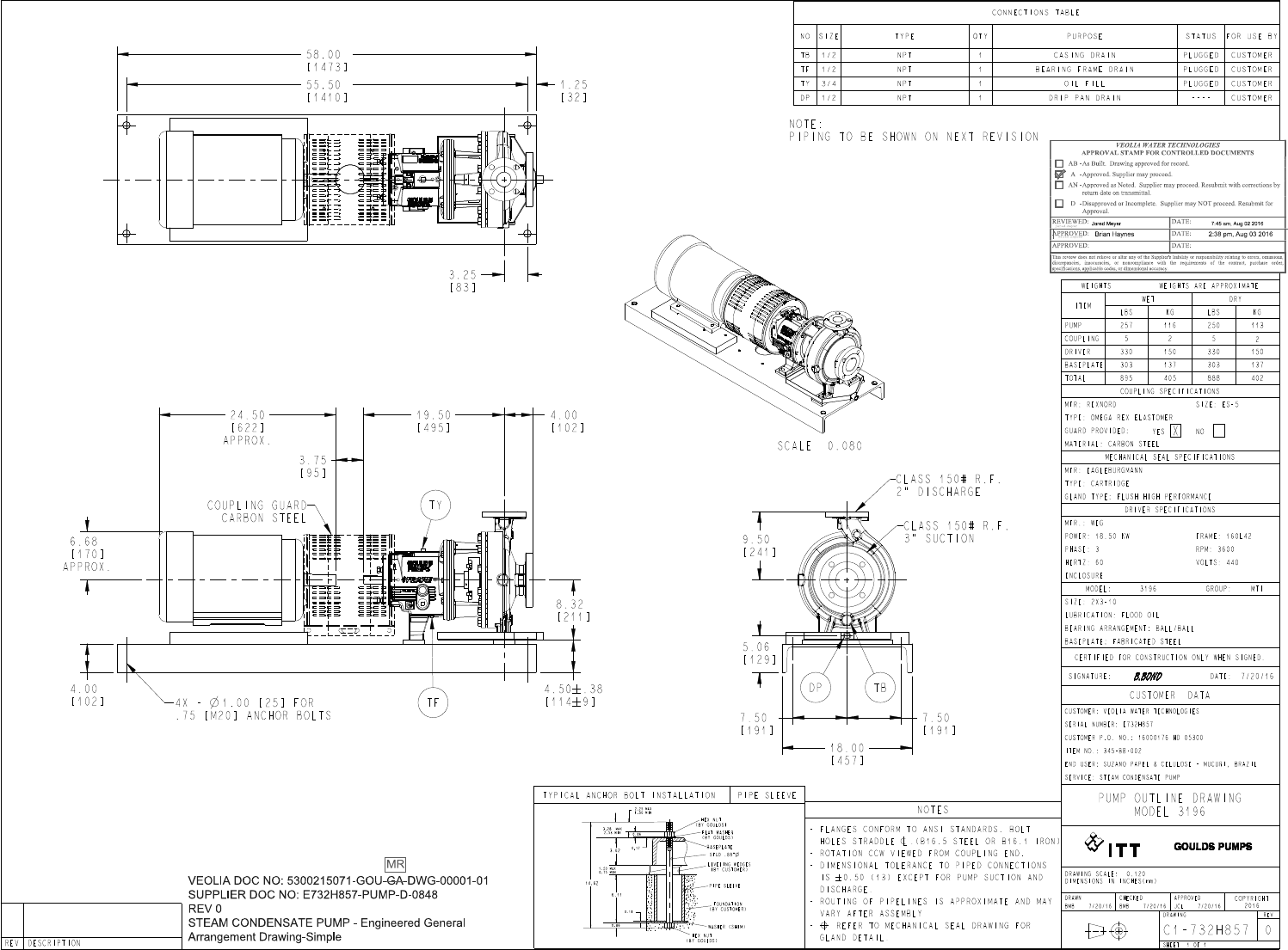 <p>CONNECTIONS TABLE NO SIZE TYPE QTY PURPOSE STATUS FOR USE BY 58.00 TB 1/2 NPT 1 CASING DRAIN PLUGGED CUSTOMER [1473] TF 1/2 NPT 1 BEARING FRAME DRAIN PLUGGED CUSTOMER 55.50 1.25 TY 3/4 NPT 1 OIL FILL PLUGGED CUSTOMER [1410] [32] DP 1/2 NPT 1 DRIP PAN DRAIN CUSTOMER NOTE PIPING TO BE SHOWN ON NEXT REVISION TECHNOLOGIES APPROVAL STAMP FOR CONTROLLED DOCUMENTS Drawing approved for A -Approved. Supplier may -Approved as Noted. Supplier may proceed Resubmit with corrections by return date on transmittal D -Disapproved or Supplier may NOT proceed Resubmit for Approval Jared Meyer DATE 2016 Brian Haynes DATE 2:38 Aug 03 2016 APPROVED DATE This review not relieve alter any of the Supplier's liability responsibility relating noncompliance with the requirements of the purchase order applicable 3.25 [83] WE EIGHTS WEIGHTS ARE APPROXIMATE WET DRY ITEM LBS KG LBS KG PUMP 257 116 250 113 COUPLING 5 2 5 2 DRIVER 330 150 330 150 BASEPLATE 303 137 303 137 TOTAL 895 405 888 402 COUPLING SPECIFICATIONS MFR: REXNORD SIZE: ES-5 24.50 19.50 4.00 TYPE: OMEGA REX ELASTOMER [622] [495] [102] GUARD PROVIDED: YES X NO SCALE 0.080 MATERIAL: CARBON STEEL 3.75 MECHANICAL SEAL SPECIFICATIONS [95] MFR: EAGLEBURGMANN CLASS 150# R.F. TYPE: CARTRIDGE 2" DISCHARGE GLAND TYPE: FLUSH HIGH PERFORMANCE COUPLING GUARD TY DRIVER SPECIFICATIONS CARBON STEEL CLASS 150# MFR. WEG 6.68 9.50 3" SUCTION 18.50 KW 160L42 [170] [241] PHASE 3 RPM: 3600 APPROX HERTZ: 60 VOLTS: 440 ENCLOSURE MODEL: 3196 GROUP: 8.32 SIZE: 2X3-10 [211] FLOOD OIL BEARING BALL/BALL FABRICATED STEEL 5.06 [129] CERTIFIED FOR CONSTRUCTION ONLY WHEN SIGNED B.BOND DATE: 7/20/16 4.00 DP TB CUSTOMER DATA [102] 4X 01.00 [25] FOR TF 75 [M20] ANCHOR BOLTS VEOLIA WATER TECHNOLOGIES 7.50 7.50 SERIAL NUMBER: E732H857 [191] [191] CUSTOMER P.O. NO.: 16000176 HD 05300 18.00 ITEM NO. 345-BB-002 [457] END USER: SUZANO PAPEL & CELULOSE - BRAZIL STEAM CONDENSATE PUMP TYPICAL ANCHOR BOLT INSTALLATION PIPE SLEEVE PUMP OUTLINE DRAWING NOTES MODEL 3196 NUT BY FLAT WASHER FLANGES CONFORM TO ANSI BOLT GOULDS) HOLES STRADDLE (B16.5 STEEL OR IRON) 3.62 STUD ROTATION CCW VIEWED FROM COUPLING END. ITT GOULDS PUMPS MR LEVELING WEDGES DIMENSIONAL TOLERANCE TO PIPED CONNECTIONS CUSTOMER) IS (13) EXCEPT FOR PUMP SUCTION AND DRAWING SCALE: 0.120 VEOLIA DOC NO: 5300215071-GOU-GA-DWG-00001-01 DIMENSIONS IN INCHES(mm) PIPE SLEEVE SUPPLIER DOC NO: E732H857-PUMP-D-0848 DISCHARGE ROUTING OF PIPELINES IS APPROXIMATE AND MAY DRAWN CHECKED APPROVED COPYRIGHT FOUNDATION REV 0 (BY CUSTOMER BMB 7/20/16 BMB 7/20/16 JCL 7/20/16 2016 VARY AFTER ASSEMBLY DRAWING REV STEAM CONDENSATE PUMP - Engineered General WASHER (SHIM) REFER TO MECHANICAL SEAL DRAWING FOR C1-732H857 0 Arrangement Drawing-Simple HEX NUT (BY GOULDS) GLAND DETAIL REV DESCRIPTION SHEET 1 OF</p>