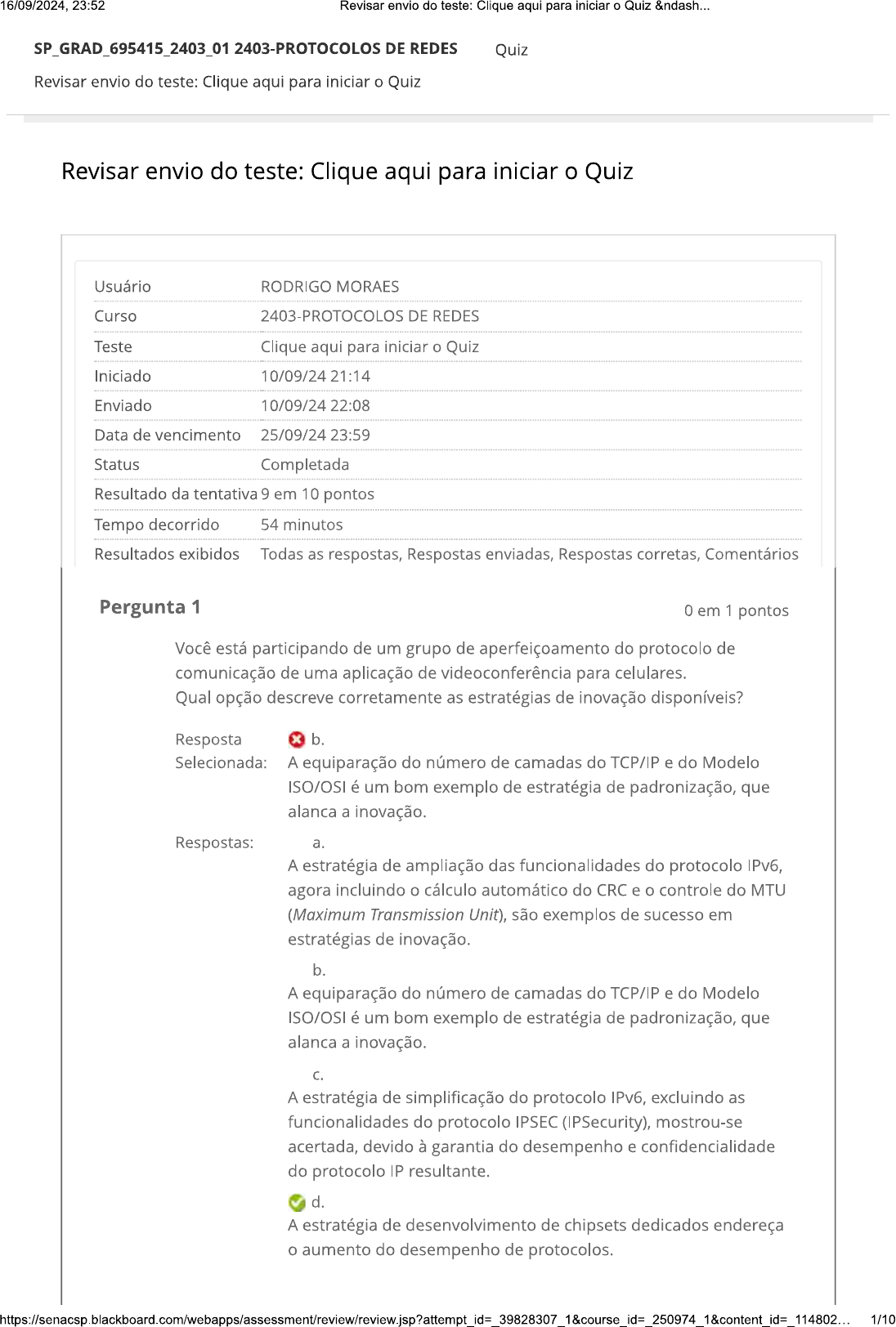 <p>16/09/2024, 23:52 Revisar envio do teste: Clique aqui para iniciar o Quiz &ndash... DE REDES Quiz Revisar envio do teste: Clique aqui para iniciar o Quiz Revisar envio do teste: Clique aqui para iniciar o Quiz Usuário RODRIGO MORAES Curso 2403-PROTOCOLOS DE REDES Teste Clique aqui para iniciar o Quiz Iniciado 10/09/24 21:14 Enviado 10/09/24 22:08 Data de vencimento 25/09/24 23:59 Status Completada Resultado da tentativa 9 em 10 pontos Tempo decorrido 54 minutos Resultados exibidos Todas as respostas, Respostas enviadas, Respostas corretas, Comentários Pergunta 1 0 em 1 pontos Você está participando de um grupo de aperfeiçoamento do protocolo de comunicação de uma aplicação de videoconferência para celulares. Qual opção descreve corretamente as estratégias de inovação disponíveis? Resposta x b. Selecionada: A equiparação do número de camadas do TCP/IP e do Modelo ISO/OSI é um bom exemplo de estratégia de padronização, que alanca a inovação. Respostas: a. A estratégia de ampliação das funcionalidades do protocolo IPv6, agora incluindo o cálculo automático do CRC e o controle do MTU (Maximum Transmission Unit), são exemplos de sucesso em estratégias de inovação. b. A equiparação do número de camadas do TCP/IP e do Modelo ISO/OSI é um bom exemplo de estratégia de padronização, que alanca a inovação. C. A estratégia de simplificação do protocolo IPv6, excluindo as funcionalidades do protocolo IPSEC (IPSecurity), mostrou-se acertada, devido à garantia do desempenho e confidencialidade do protocolo IP resultante. d. A estratégia de desenvolvimento de chipsets dedicados endereça o aumento do desempenho de protocolos. 1/10</p><p>16/09/2024, 23:52 Revisar envio do teste: Clique aqui para iniciar o Quiz &ndash... e. A estratégia de divisão de camada de um protocolo existente, como no caso do protocolo 6LoWPAN, mostrou-se desastrosa devido ao enrijecimento das funcionalidades do protocolo. Comentário Resp: D da resposta: Para questões de aumento do desempenho, uma estratégia largamente adotada é a de desenvolvimento de chipsets dedicados para a implementação do protocolo. Este é o caso de chipsets do protocolo Bluetooth, que já inclui antena, oscilador, resistores e capacitores. Com um chipset dedicado, a execução do protocolo não se degrada quando o processador central do dispositivo estiver sob alta demanda. Pergunta 2 1 em 1 pontos Dois edifícios num novo Centro de Convenções em construção devem ser interligados para integração das suas redes locais. Em quais condições o uso de cabos de fibra óptica não seria recomendado? Resposta Selecionada: Em ambientes onde haja uma grande movimentação de veículos pesados ou obras civis com retroescavadeiras, devido à alta probabilidade de ocorrência de danos aos cabos. Respostas: a. Caso os edifícios estejam muito distantes, gerando grande perda de sinal na comunicação via fibra óptica. b. Em ambientes onde haja uma grande movimentação de veículos pesados ou obras civis com retroescavadeiras, devido à alta probabilidade de ocorrência de danos aos cabos. C. Caso os cabos sejam instalados em postes, porque as fibras ópticas são muito frágeis à tração e ao esmagamento. d. Caso os edifícios estejam muito distantes, pois custo por metro de cabo de fibra óptica ainda é proibitivo nos dias de hoje. e. Em ambientes sujeitos a elevados níveis de ruído eletromagnético, gerando correntes parasitas que danificam as interfaces optoeletrônicas. Comentário Resp: b) Em ambientes onde haja uma grande movimentação de da resposta: veículos pesados ou obras civis com retroescavadeiras, devido à alta probabilidade de ocorrência de danos aos cabos. As fibras ópticas são tubos de vidro muito frágeis. O material de reforço precisa ser suficientemente resistente para evitar que o cabo seja tracionado ou esmagado, acarretando o rompimento das fibras. Cabos terrestres são enterrados em valas de pelo menos um metro de profundidade. Cabos instalados em postes são</p><p>16/09/2024, 23:52 Revisar envio do teste: Clique aqui para iniciar o Quiz &ndash... sustentados por cabos de aço internos ou externos. Pergunta 3 1 em 1 pontos Você está fazendo a configuração do roteador da rede Wi-Fi de um pequeno escritório. Qual opção a seguir está correta em relação à configuração de redes Wi-Fi? Resposta C. Selecionada: O protocolo WAP2 (Wi-Fi Protected Access 2) AES (Advanced Encryption Standard) é o mais recomendado para a proteção das redes Wi-Fi. Respostas: a. O protocolo WAP continua sendo a versão mais segura para a proteção efetiva das redes Wi-Fi contra ataques DoS (Denial of Service). b. A atualização do firmware de Access Points deve ser desativada para bloquear ataques do tipo Cat-Dog lançados a partir de clientes internos. C. O protocolo WAP2 (Wi-Fi Protected Access 2) AES (Advanced Encryption Standard) é o mais recomendado para a proteção das redes Wi-Fi. d. A ativação do recurso WPS (Wi-Fi Protected Setup) é recomendada para segurança da configuração da senha de conexão entre cliente e Access Point. e. tamanho da senha de acesso ao Access Point não é relevante devido ao uso do algoritmo AES (Advanced Encryption Standard), que oferece alto nível de resiliência contra ataques a sistemas de chaves públicas. Comentário Resp: C da resposta: A opção do modo de criptografia da comunicação entre cliente e AP é muito importante. O modo de criptografia deve ser necessariamente WPA2-PSK (AES). O WPA2, que vem de Wi-Fi Protected Access 2, foi formalizado pelo padrão IEEE 802.11i. Nessa configuração, a chave PSK, de Pre-Shared Key, fornecida no momento da configuração inicial, é utilizada para gerar a chave temporária de criptografia da comunicação entre cliente e AP. AES, ou Advanced Encryption Standard, é um algoritmo robusto que utiliza chaves simétricas de 128, 192 ou 256 bits. Não confunda WPA2 com WPA, pois este último é a