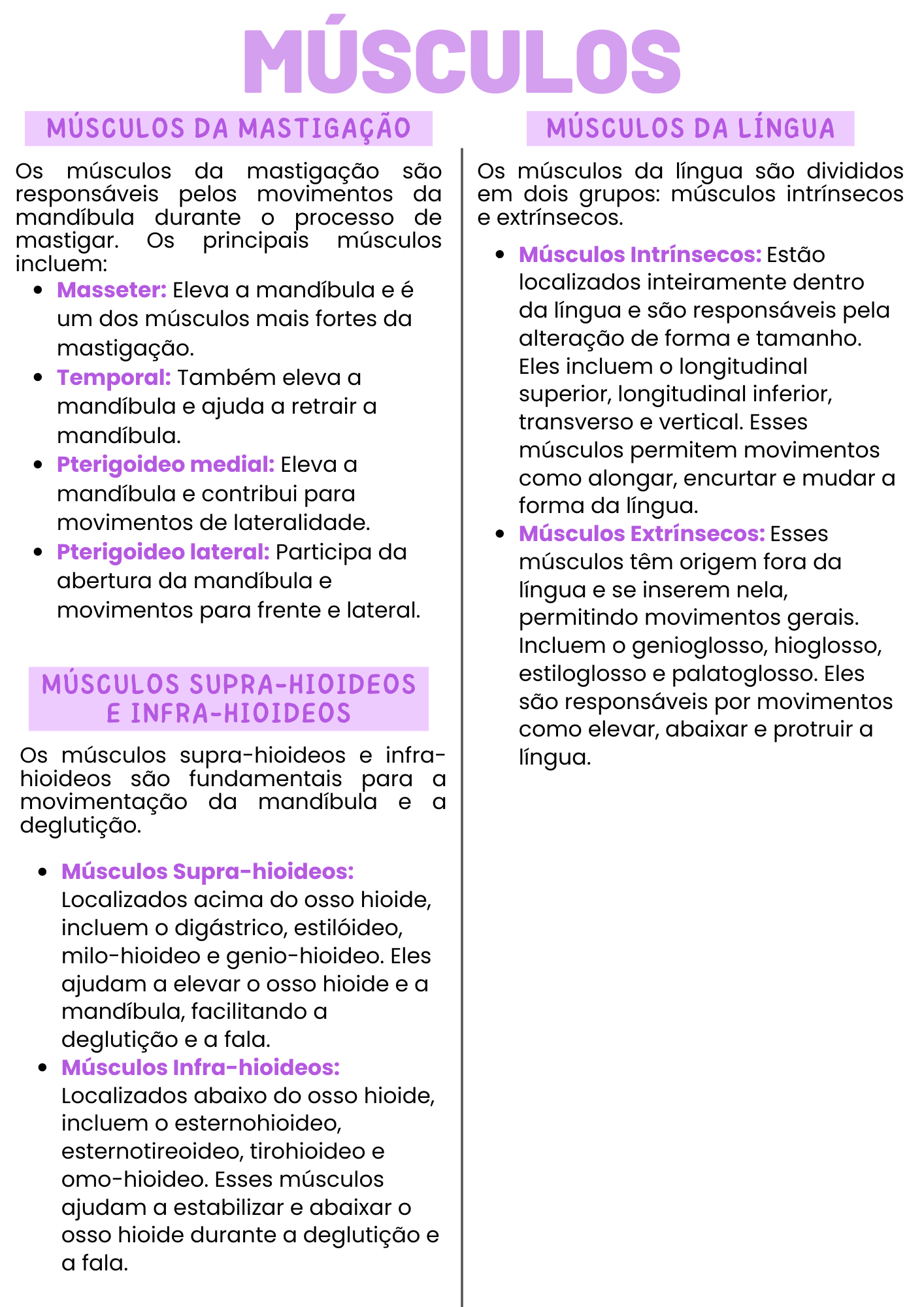 <p>MÚSCULOS DA MASTIGAÇÃO MÚSCULOS DA Os músculos da mastigação são Os músculos da língua são divididos responsáveis pelos movimentos da em dois grupos: músculos intrínsecos mandíbula durante o processo de e extrínsecos. mastigar. Os principais músculos incluem: Músculos Intrínsecos: Estão Masseter: Eleva a mandíbula e é localizados inteiramente dentro um dos músculos mais fortes da da língua e são responsáveis pela mastigação. alteração de forma e tamanho. Temporal: Também eleva a Eles incluem o longitudinal mandíbula e ajuda a retrair a superior, longitudinal inferior, transverso e vertical. Esses mandíbula. músculos permitem movimentos Pterigoideo medial: Eleva a como alongar, encurtar e mudar a mandíbula e contribui para forma da língua. movimentos de lateralidade. Músculos Extrínsecos: Esses Pterigoideo lateral: Participa da músculos têm origem fora da abertura da mandíbula e língua e se inserem nela, movimentos para frente e lateral. permitindo movimentos gerais. Incluem o genioglosso, hioglosso, MÚSCULOS SUPRA-HIOIDEOS estiloglosso e palatoglosso. Eles E INFRA-HIOIDEOS são responsáveis por movimentos como elevar, abaixar e protruir a Os músculos supra-hioideos e infra- língua. hioideos são fundamentais para a movimentação da mandíbula e a deglutição. Músculos Supra-hioideos: Localizados acima do OSSO hioide, incluem o digástrico, estilóideo, milo-hioideo e genio-hioideo. Eles ajudam a elevar o hioide e a mandíbula, facilitando a deglutição e a fala. Músculos Infra-hioideos: Localizados abaixo do hioide, incluem o esternohioideo, esternotireoideo, tirohioideo e omo-hioideo. Esses músculos ajudam a estabilizar e o hioide durante a deglutição e a fala.</p>