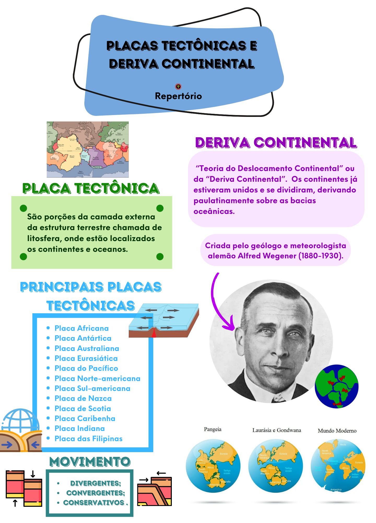 <p>PLACAS TECTÔNICAS E DERIVA CONTINENTAL Repertório DERIVA CONTINENTAL "Teoria do Deslocamento Continental" OU da "Deriva Continental". Os continentes já PLACA TECTÔNICA estiveram unidos e se dividiram, derivando paulatinamente sobre as bacias oceânicas. São porções da camada externa da estrutura terrestre chamada de litosfera, onde estão localizados os continentes e oceanos. Criada pelo geólogo e meteorologista alemão Alfred Wegener (1880-1930). PRINCIPAIS PLACAS TECTÔNICAS Placa Africana Placa Antártica Placa Australiana Placa Eurasiática Placa do Pacífico Placa Norte-americana Placa Sul-americana Placa de Nazca Placa de Scotia Placa Caribenha Placa Indiana Pangeia Laurásia e Gondwana Mundo Moderno Placa das Filipinas Arctic North Eurasia Eurasia North MOVIMENTO Eurasia South South Africa ocean India America Indian ocean Antarctica CONVERGENTES: CONSERVATIVOS</p>