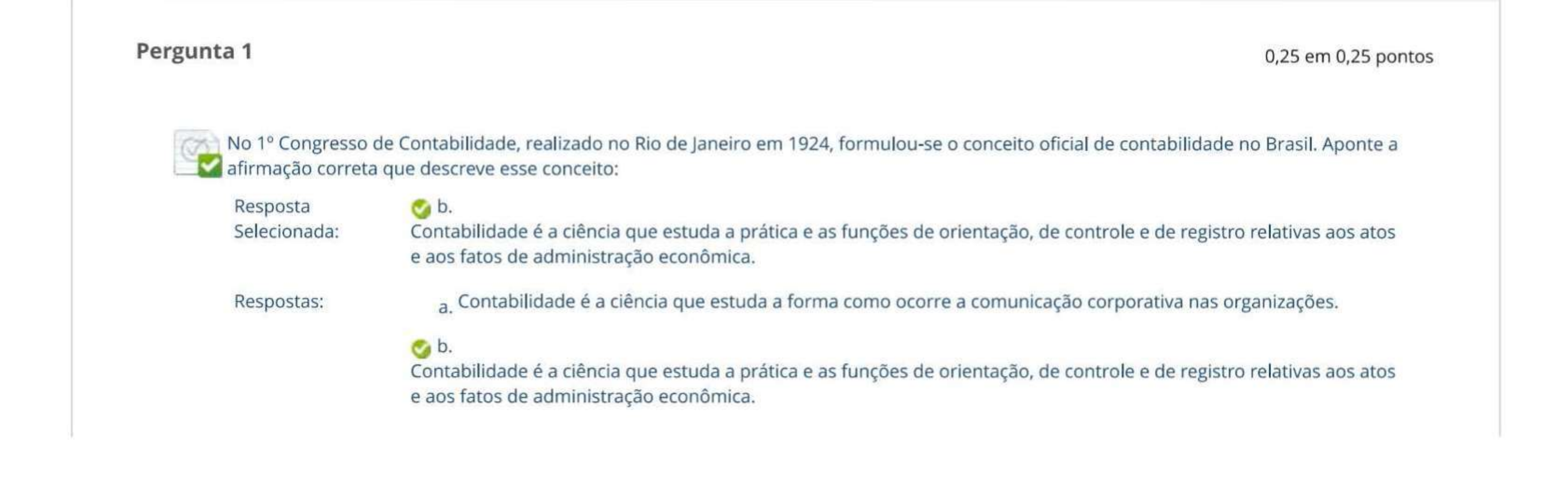 <p>Pergunta 1 0,25 em 0,25 pontos No 1° Congresso de Contabilidade, realizado no Rio de Janeiro em 1924, formulou-se o conceito oficial de contabilidade no Brasil. Aponte a afirmação correta que descreve esse conceito: Resposta b. Selecionada: Contabilidade é a ciência que estuda a prática e as funções de orientação, de controle e de registro relativas aos atos e aos fatos de administração econômica. Respostas: a. Contabilidade é a ciência que estuda a forma como ocorre a comunicação corporativa nas organizações. b. Contabilidade é a ciência que estuda a prática e as funções de orientação, de controle e de registro relativas aos atos e aos fatos de administração econômica.</p><p>C. Contabilidade é a ciência que estuda a alocação dos recursos escassos a finalidades alternativas. d. Contabilidade é a ciência administrativa financeira que busca encontrar respostas para questões estratégicas das empresas. e. Contabilidade é a ciência que padroniza as práticas administrativas nas empresas de médio e grande porte. Comentário Resposta: B da resposta: Comentário: o primeiro congresso brasileiro de contabilidade estabeleceu que a contabilidade é a ciência que estuda a prática e as funções de orientação, de controle e de registro relativas aos atos e aos fatos de administração econômica. Em outras palavras podemos afirmar que contabilidade é o método padronizado que auxilia as empresas no controle e no registro dos fatos de administração econômica das empresas. As demais alternativas estão incorretas, já que não se referem à ciência Pergunta 2 0,25 em 0,25 pontos Um dos principais objetivos da contabilidade é fornecer informações úteis sobre a situação patrimonial e financeira da entidade aos diversos usuários das informações contábeis para fins de tomada de decisão. Nesse contexto, aponte a afirmação que contempla os principais usuários dessas informações contábeis: Resposta a. Selecionada: Sócios, acionistas, proprietários, administradores, diretores, executivos, bancos, fornecedores, credores, governo e pessoas físicas. Respostas: a. Sócios, acionistas, proprietários, administradores, diretores, executivos, bancos, fornecedores, credores, governo e pessoas físicas. b. Sócios, acionistas, proprietários, administradores e diretores. C. Investidores, pessoas físicas e jurídicas, além do governo. d. Sócios, acionistas, proprietários, credores, governo e pessoas físicas.</p><p>e. Governo e investidores. Comentário da Resposta: A resposta: Comentário: a alternativa A é a opção que aponta o maior número de partes interessadas, as demais afirmações estão incompletas. Pergunta 3 0,25 em 0,25 pontos De acordo com o CPC 00 (R2), ativo é um recurso econômico presente controlado pela entidade como resultado de eventos passados (CPC, 2019). o recurso econômico é um direito que tem o potencial de produzir benefícios econômicos, como direitos de receber caixa, direitos de receber produtos ou serviços, e direitos de trocar recursos econômicos com outra parte em condições favoráveis. Por outro lado, há a contrapartida contábil formada pelo passivo. Quanto aos principais conceitos relacionados ao passivo é correto afirmar que: Resposta Selecionada: e. São os deveres e as obrigações de uma pessoa jurídica. Respostas: a. São bens e direitos de uma pessoa jurídica. b. São bens e direitos de uma pessoa São os bens de uma pessoa jurídica. d. São os deveres e as obrigações de uma pessoa e. São os deveres e as obrigações de uma pessoa jurídica. Comentário da Resposta: E resposta: Comentário: a alternativa E é a única opção correta, já que a alternativa A aponta características do ativo e as demais estão incorretas. o lado passivo de um balanço patrimonial é composto por deveres e obrigações da empresa para com as partes interessadas (acionistas, fornecedores, bancos e funcionários).</p><p>Pergunta 4 0,25 em 0,25 pontos A ciência contábil estabelece métodos de controle e demonstração de resultados das entidades (pessoa jurídica), uma das demonstrações contábeis - financeiras mais importantes é o balanço patrimonial. Aponte a afirmação correta referente a essa demonstração: Resposta Selecionada: balanço patrimonial faz parte do conjunto das demonstrações contábeis exigidas por lei e reflete a posição financeira e patrimonial da entidade em determinado momento. Respostas: a. o balanço patrimonial aponta as oscilações da conta caixa e bancos em um determinado período de uma entidade empresarial. b. balanço patrimonial evidencia as mutações do patrimônio líquido da empresa. o balanço patrimonial faz parte do conjunto das demonstrações contábeis exigidas por lei e reflete a posição financeira e patrimonial da entidade em determinado momento. d. balanço é demonstração que evidencia o fluxo de entradas e saídas do caixa da empresa. e. balanço patrimonial faz parte do conjunto de demonstrações contábeis que explica a conta lucro, tendo como a primeira linha o resultado da receita bruta. Comentário da Resposta: C resposta: Comentário: o balanço patrimonial é uma das principais demonstrações contábeis financeiras e demonstra o balanceamento entre as contas do ativo versus as contas do passivo. As demais alternativas estão incorretas, já que se referem a outras demonstrações contábeis. Pergunta 5 0,25 em 0,25 pontos</p><p>o balanço patrimonial é uma das principais demonstrações utilizadas pela ciência contábil para apoiar as empresas no controle e na padronização da posição financeira da pessoa jurídica. Aponte a alternativa correta referente a essa importante demonstração: Resposta Selecionada: b. balanço patrimonial obedece ao regime de competência por fato gerador. Respostas: a. balanço patrimonial obedece ao regime de caixa. b. balanço patrimonial obedece ao regime de competência por fato gerador. balanço pat