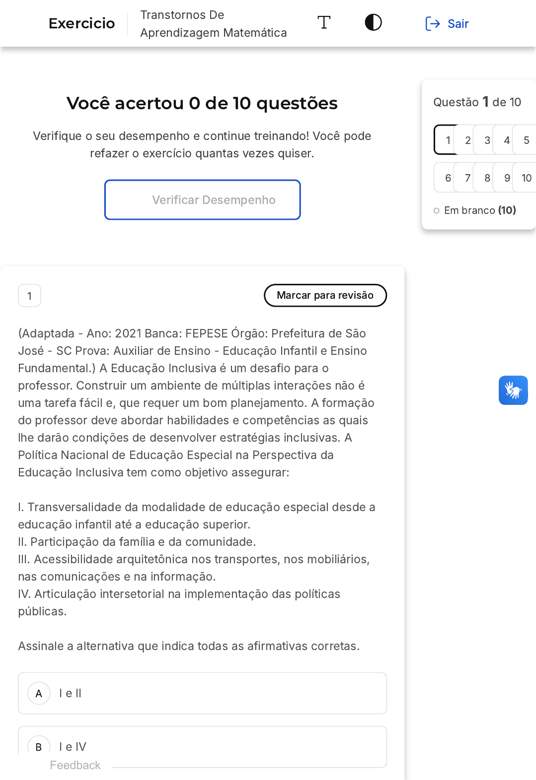 <p>Você acertou 0 de 10 questões</p><p>Verifique o seu desempenho e continue treinando! Você pode</p><p>refazer o exercício quantas vezes quiser.</p><p>Verificar Desempenho</p><p>A</p><p>B</p><p>1 Marcar para revisão</p><p>�Adaptada - Ano: 2021 Banca: FEPESE Órgão: Prefeitura de São</p><p>José - SC Prova: Auxiliar de Ensino - Educação Infantil e Ensino</p><p>Fundamental.) A Educação Inclusiva é um desafio para o</p><p>professor. Construir um ambiente de múltiplas interações não é</p><p>uma tarefa fácil e, que requer um bom planejamento. A formação</p><p>do professor deve abordar habilidades e competências as quais</p><p>lhe darão condições de desenvolver estratégias inclusivas. A</p><p>Política Nacional de Educação Especial na Perspectiva da</p><p>Educação Inclusiva tem como objetivo assegurar:</p><p>I. Transversalidade da modalidade de educação especial desde a</p><p>educação infantil até a educação superior.</p><p>II. Participação da família e da comunidade.</p><p>III. Acessibilidade arquitetônica nos transportes, nos mobiliários,</p><p>nas comunicações e na informação.</p><p>IV. Articulação intersetorial na implementação das políticas</p><p>públicas.</p><p>Assinale a alternativa que indica todas as afirmativas corretas.</p><p>I e II</p><p>I e IV</p><p>Questão 1 de 10</p><p>Em branco �10�</p><p>1 2 3 4 5</p><p>6 7 8 9 10</p><p>Feedback</p><p>Exercicio</p><p>Transtornos De</p><p>Aprendizagem Matemática</p><p>Sair</p><p>C</p><p>D</p><p>E</p><p>I, II e III</p><p>II, III e IV</p><p>I, II, III e IV</p><p>Questão não respondida</p><p>Opa! A alternativa correta é a letra E. Confira o</p><p>gabarito comentado!</p><p>Gabarito Comentado</p><p>A Política Nacional de Educação Especial na Perspectiva da</p><p>Educação Inclusiva tem como objetivo assegurar a inclusão</p><p>escolar de alunos com deficiência, transtornos globais do</p><p>desenvolvimento e altas habilidades/superdotação, orientando</p><p>os sistemas de ensino para garantir: acesso ao ensino regular,</p><p>com participação, aprendizagem e continuidade nos níveis</p><p>mais elevados do ensino; transversalidade da modalidade de</p><p>educação especial desde a educação infantil até a educação</p><p>superior; oferta do atendimento educacional especializado;</p><p>formação de professores para o atendimento educacional</p><p>especializado e demais profissionais da educação para a</p><p>inclusão; participação da família e da comunidade;</p><p>acessibilidade arquitetônica, nos transportes, nos mobiliários,</p><p>nas comunicações e informação; e articulação intersetorial na</p><p>implementação das políticas públicas. �Disponível em:</p><p>http://portal.mec.gov.br/arquivos/pdf/politicaeducespecial.pdf.</p><p>Acesso em: 26 mar 2022�</p><p>2 Marcar para revisão</p><p>Adaptada �Ano: 2005 Órgão: Prefeitura de Teresópolis -</p><p>RJ Prova: Concurso para professores de Ciência). Para que uma</p><p>aprendizagem significativa possa acontecer, é necessário investir</p><p>em ações que potencializem a disponibilidade do aluno para a</p><p>A</p><p>B</p><p>C</p><p>D</p><p>E</p><p>aprendizagem, o que se traduz, por exemplo, no empenho em</p><p>estabelecer relações entre seus conhecimentos prévios sobre um</p><p>assunto e o que está aprendendo sobre ele. �Parâmetros</p><p>Curriculares Nacionais, 1998�</p><p>A afirmação acima destacada, partindo de uma perspectiva</p><p>construtivista, convida o professor a refletir que, ao iniciar uma</p><p>nova situação de ensino e aprendizagem, devemos considerar</p><p>que:</p><p>Em geral, os conceitos prévios dos alunos são esquemas</p><p>mentais alternativos, imperfeitos, incompletos e, por isso,</p><p>devem, desde o primeiro momento, ser afastados do</p><p>contexto da sala de aula e do ensino.</p><p>Antes de qualquer nova situação de ensino, deve ser feita</p><p>uma investigação extensa de todos os conhecimentos</p><p>prévios que possam influenciar o objeto de estudo,</p><p>devendo ser discutidos apenas no início de uma situação</p><p>de ensino.</p><p>O conhecimento prévio dos alunos constitui um amplo</p><p>esquema de ressignificação, devendo ser mobilizado</p><p>durante todo o processo de ensino e aprendizagem, pois</p><p>com base neles o indivíduo interpreta o mundo.</p><p>A natureza da estratégia didática não influencia a</p><p>disponibilização dos conhecimentos prévios dos</p><p>estudantes.</p><p>Todo conhecimento prévio surge do contexto social do</p><p>estudante e, portanto, deve ser substituído por meio da</p><p>transmissão clara e objetiva de novos materiais</p><p>adequados de ensino.</p><p>Questão não respondida</p><p>Opa! A alternativa correta é a letra C. Confira o</p><p>gabarito comentado!</p><p>A</p><p>B</p><p>C</p><p>Gabarito Comentado</p><p>Os conhecimentos prévios dos alunos sempre devem ser</p><p>levados em consideração. Incorretas ou incompletas, as ideias</p><p>prévias trazem informações sobre a forma como eles pensam.</p><p>Somente ao analisá-las o docente consegue propor as</p><p>situações de ensino mais adequadas para que eles atribuam</p><p>significados à nova informação e, se for o caso, coloquem em</p><p>xeque seus conhecimentos.</p><p>3 Marcar para revisão</p><p>O Estatuto da Criança e do Adolescente - ECA, Lei Nº 8.069, de 13</p><p>de julho de 1990 - é um marco nas Políticas Públicas para a</p><p>infância e adolescência, um ganho significativo. O ECA aborda</p><p>questões que estão também diretamente ligadas à questão da</p><p>aprendizagem e quem está envolvido na Educação, em todas as</p><p>dimensões, inclusive escolar, precisa conhecê-lo, incluindo os</p><p>professores de matemática. Considerando o ECA, assinale a única</p><p>opção correta.</p><p>Definiu a igualdade de condições de acesso e</p><p>permanência e o atendimento especializado aos</p><p>portadores de deficiência.</p><p>Definiu que educando