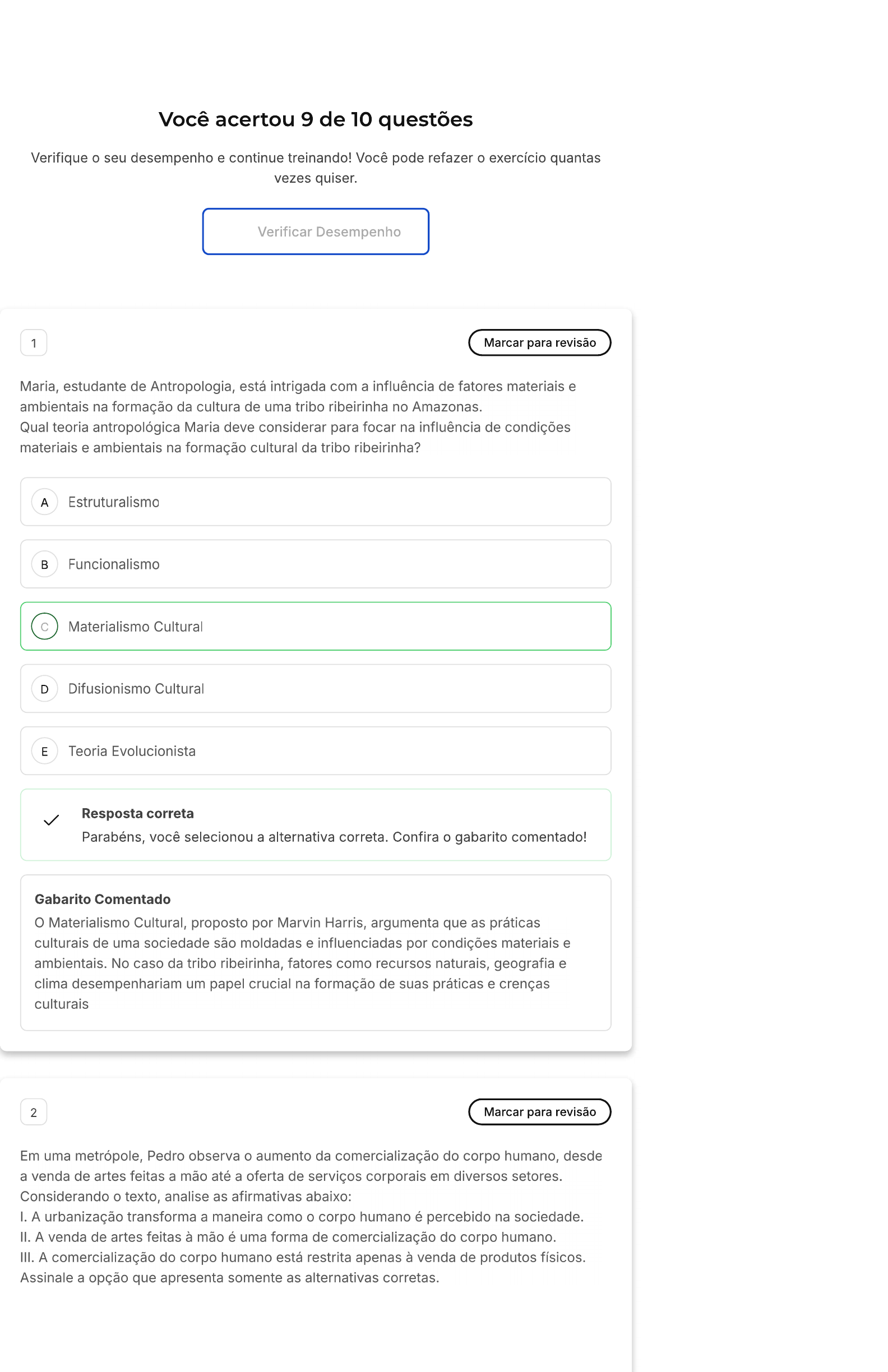 <p>Você acertou 9 de 10 questões Verifique o seu desempenho e continue treinando! Você pode refazer o exercício quantas vezes quiser. Verificar Desempenho 1 Marcar para revisão Maria, estudante de Antropologia, está intrigada com a influência de fatores materiais e ambientais na formação da cultura de uma tribo ribeirinha no Amazonas. Qual teoria antropológica Maria deve considerar para focar na influência de condições materiais e ambientais na formação cultural da tribo ribeirinha? A Estruturalismo B Funcionalismo C Materialismo Cultural D Difusionismo Cultural E Teoria Evolucionista Resposta correta Parabéns, você selecionou a alternativa correta. Confira o gabarito comentado! Gabarito Comentado Materialismo Cultural, proposto por Marvin Harris argumenta que as práticas culturais de uma sociedade são moldadas e influenciadas por condições materiais e ambientais. No caso da tribo ribeirinha, fatores como recursos naturais, geografia e clima desempenhariam um papel crucial na formação de suas práticas e crenças culturais 2 Marcar para revisão Em uma Pedro observa o aumento da comercialização do corpo humano, desde a venda de artes feitas a mão até a oferta de serviços corporais em diversos setores. Considerando o texto, analise as afirmativas abaixo: I. A urbanização transforma a maneira como o corpo humano é percebido na sociedade. II. A venda de artes feitas à mão é uma forma de comercialização do corpo humano III. A comercialização do corpo humano está restrita apenas à venda de produtos físicos. Assinale a opção que apresenta somente as alternativas corretas.</p><p>A Apenas a afirmativa está correta B Apenas a afirmativa está correta C Apenas as afirmativas e estão corretas D As afirmativas I, e III estão corretas Exercicio Introdução À Antropologia Cultural T Sair Questão 3 de 10 Resposta correta Parabéns, você selecionou a alternativa correta. Confira o gabarito comentado! 1 2 3 4 5 Gabarito Comentado 6 7 8 9 10 A urbanização, como discutido no texto-base, realmente altera a percepção do corpo Corretas (9) humano, tornando-o um objeto comercializável em várias formas, incluindo a venda de Incorretas (1) artesanato. No entanto, a comercialização do corpo humano não se limita apenas à venda de produtos físicos, pois também abrange serviços e outras formas de interação Em branco (0) 3 Marcar para revisão Lucas, ao analisar a cultura brasileira nota uma forte relação entre a percepção do corpo e a convivência conjugal em ambientes urbanos. Considerando o texto, analise as afirmativas abaixo. I. A cultura brasileira contemporânea não tem influências de percepções urbanas sobre o corpo. II. A convivência conjugal pode ser influenciada por percepções urbanas do corpo. III. A Antropologia não se preocupa com aspectos da cultura brasileira Assinale a opção que apresenta somente as alternativas corretas A Apenas a afirmativa está correta B Apenas a afirmativa está correta C Apenas as afirmativas e III estão corretas D Apenas as afirmativas e III estão corretas E Apenas a afirmativa III está correta X Resposta incorreta Opa! A alternativa correta é a letra A. Confira o gabarito comentado! Gabarito Comentado O texto menciona que a Antropologia analisa a cultura brasileira especialmente em relação à percepção do corpo e à convivência conjugal. Isso indica que a afirmativa está correta, enquanto as afirmativas e III estão incorretas</p><p>4 Marcar para revisão As escolas de e Etnometodologia são conhecidas por se inserirem na tradição metodológica qualitativa. Ambas buscam ver o mundo através dos olhos dos atores sociais e dos que eles atribuem aos objetos e ações. Estas escolas dão na compreensão dos e dos sentidos que os atores sociais desenvolvem no contexto das suas vivências. Selecione a alternativa cuja sequência preenche corretamente as lacunas. A Fenomenologia, significados, pontos de vista B Etnografia, valores, conceitos C Sociologia, conceitos, significados D Antropologia, pontos de vista, valores E Psicologia, ideais, pensamentos Resposta correta você selecionou a alternativa correta. Confira o gabarito comentado! Gabarito Comentado As escolas de "Fenomenologia" e Etnometodologia são reconhecidas por sua abordagem metodológica qualitativa. Elas priorizam a compreensão dos "significados" que os atores sociais atribuem a objetos e ações em suas vidas cotidianas. Dessa forma, essas escolas enfatizam a importância de entender os "pontos de vista" e os sentidos construídos pelos atores sociais em suas interações e vivências. 5 Marcar para revisão Em uma cidade pequena, moradores começam a observar o comportamento cotidiano de seus vizinhos e se questionam sobre as práticas e representações sociais que influenciam suas ações diárias. Baseado no estudo de caso acima, qual teoria aborda a prática artesanal da vida cotidiana interpretada pelos atores sociais? A Positivismo B Estruturalismo C Interacionismo simbólico D Estudos em Ethnomethodology E Funcionalismo</p><p>Resposta correta Parabéns, você selecionou a alternativa correta. Confira o gabarito comentado! Gabarito Comentado A teoria "Estudos em Ethnomethodology", publicada em 1967 nos EUA, aborda uma forma de compreender a prática artesanal da vida cotidiana. Essa teoria se concentra em interpretar a vida diária e as práticas e representações pelas quais as pessoas negociam sua inserção em grupos. 6 Marcar para revisão A Antropologia Cultural investiga as práticas cotidianas e representações que moldam a inserção de indivíduos em grupos sociais. Dentro de contextos urbanos, estas práticas e representações assumem novas dimensões, influenciadas pela presença do capital e pela complexidade das interações Qual das seguintes afirmações melhor descreve o impacto da urbanização nas relações sociais estudadas pela Antropologia Cultural? A urbanização elimina a necessidade de estu