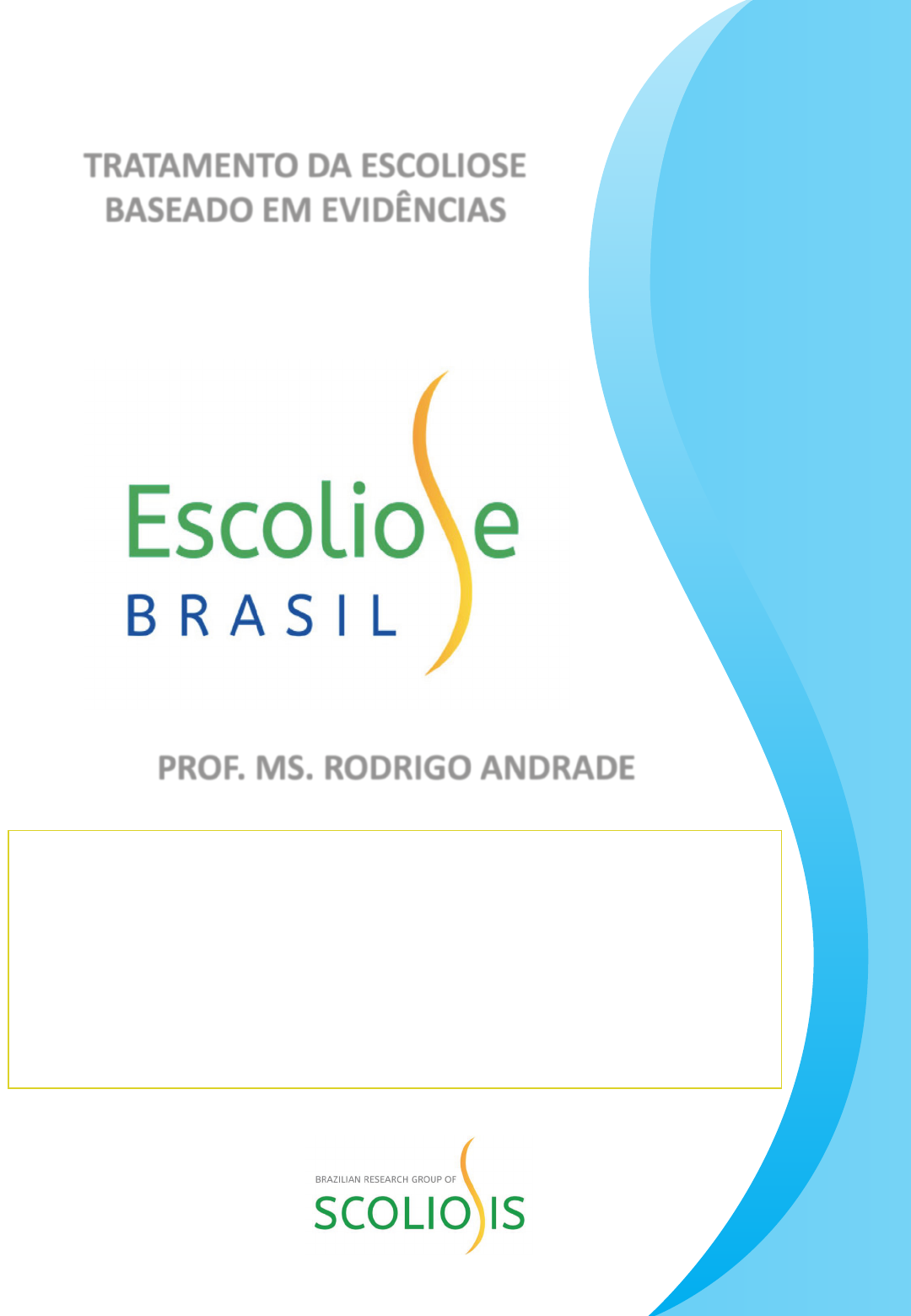 <p>PROF. MS. RODRIGO ANDRADE</p><p>CURSO DE FORMAÇÃO</p><p>TRATAMENTO DA ESCOLIOSE</p><p>BASEADO EM EVIDÊNCIAS</p><p>Metodologias Internacionais</p><p>Aceitas e Publicadas pela SOSORT</p><p>- Doutorando e Mestre em Ciências da Reabilitação - FMUSP.</p><p>- Criador do Método S4D - Brazilian Method.</p><p>- Especialista em Acupuntura pelo Centro Brasileiro de Fisioterapia – CBF.</p><p>- Fisioterapeuta graduado pela UNIARARAS.</p><p>- Prof. dos Cursos de Método Pilates, Avaliação Biomecânica Computadorizada – Fotogrametria</p><p>- Formação Internacional Master ISICO (Istituto Scientifico Italiano Colonna Vertebrale–Milão)</p><p>- Formação Internacional SCHROTH (Scoliologic Schroth Best Practice by Dr Weiss-Hong Kong)</p><p>- Form. Intern. BSPTS Barcelona Scoliosis Physio Therapy School - Hunter College - New York</p><p>- Formação Internacional GOSS ORTHOTIS SYSTEMS - Dr José Miguel Gomez – Colombia)</p><p>- Fundador do Escoliose Brasil School.</p><p>- Proprietário do INSTITUTO REAB CAMPINAS e REAB CURSOS.</p><p>Nenhuma parte deste documento pode ser reproduzida sem permissão do Prof. Ms. Rodrigo Andrade</p><p>Prof. Ms. Rodrigo Andrade - Curso de Formação no Tratamento da Escoliose Baseado em Evidências</p><p>ÍNDICE</p><p>AULA INTRODUÇÃO – TRATAMENTO DA ESCOLIOSE</p><p>AULA DOR E AVALIAÇÃO CLÍNICA E RADIOGRÁFICA</p><p>AULA RASTREAMENTO ESCOLAR DA ESCOLIOSE</p><p>FICHA DE AVALIAÇÃO</p><p>1 - Auto-correção 8</p><p>2 - Deslocamento Lateral (Side Shift) 10</p><p>3 - Estabilização 17</p><p>4 - Abdominais 27</p><p>5 - Rotação de Tronco 34</p><p>6 - Quatro Apoios 39</p><p>7 - Em pé 46</p><p>8 - Equilíbrio 51</p><p>9 - Marcha 62</p><p>10 - Visual 66</p><p>11 - Flexibilidade / Mobilidade 72</p><p>12 - Inclinação Lateral 79</p><p>13 - Aplicação nas Atividades de Vida Diária 83</p><p>REFERÊNCIAS BIBLIOGRÁFICAS 88</p><p>3-104</p><p>196-208</p><p>105-195</p><p>209-212</p><p>RADIOGRAFIAS</p><p>213-215</p><p>EXERCÍCIOS</p><p>1</p><p>PROF. MS. RODRIGO ANDRADE</p><p>Introdução – Tratamento da Escoliose</p><p>Baseado em Evidências</p><p>- Mestre em Ciências da Reabilitação - USP.</p><p>- Especialista em Acupuntura pelo Centro Brasileiro de Fisioterapia – CBF.</p><p>- Fisioterapeuta graduado pela UNIARARAS.</p><p>- Prof. do Curso de Graduação em Fisioterapia da PUC-SP</p><p>- Prof. da Pós Graduação da UNIARARAS, UNIVALE, INSPIRAR.</p><p>- Prof. dos Cursos de Método Pilates, Avaliação Biomecânica Computadorizada –</p><p>Fotogrametria.</p><p>-Formação Internacional Master ISICO (Istituto Scientifico Italiano Colonna Vertebrale–Milão)</p><p>-Formação Internacional SCHROTH (Scoliologic Schroth Best Practice by Dr Weiss-Hong Kong)</p><p>- Form. Intern. BSPTS Barcelona Scoliosis Physio Therapy School - Hunter College - New York</p><p>- Formação Internacional GOSS ORTHOTIS SYSTEMS - Dr José Miguel Gomez – Colombia)</p><p>- Fundador do Escoliose Brasil School.</p><p>- Proprietário do INSTITUTO REAB CAMPINAS e REAB CURSOS.</p><p>FISIOTERAPIA</p><p>Apresentação</p><p>Objetivos:</p><p>• Apresentar os tratamentos aceitos e publicados na literatura científica e nos</p><p>consensos (SOSORT) (Observação, Exercícios, Coletes Ortopédicos e o</p><p>Tratamento Cirúrgico).</p><p>• Aprender a avaliar indivíduos para um programa de rastreamento da</p><p>escoliose.</p><p>• Aprender a avaliar o paciente com escoliose (Radiograficamente e</p><p>clinicamente).</p><p>• Aprender abordagem científica do paciente com dor crônica.</p><p>• Aprender os exercícios mais indicados para cada paciente (Baseado nos</p><p>Consensos e Diretrizes da SOSORT).</p><p>• Aprender a prescrever séries dos exercícios diários.</p><p>• Aprender a utilizar instrumentos para auxiliar no aprendizado do paciente.</p><p>ESCOLIOSE</p><p>Nenhuma parte deste documento pode ser reproduzida sem permissão do Prof. Ms. Rodrigo Andrade</p><p>2</p><p>Contexto: A Sociedade Científica Internacional de Escoliose em Tratamento Ortopédico e</p><p>de Reabilitação (SOSORT), que produziu suas primeiras Diretrizes em 2005, sentiu a</p><p>necessidade de revisá-las e aumentar sua qualidade científica.</p><p>O objetivo foi oferecer a todos os profissionais e seus pacientes uma revisão atualizada</p><p>baseada em evidências reais sobre o tratamento conservador da escoliose idiopática.</p><p>Histórico</p><p>Nenhuma parte deste documento pode ser reproduzida sem permissão do Prof. Ms. Rodrigo Andrade</p><p>3</p><p>Histórico</p><p>ESCOLIOSE</p><p>• Escoliose é um termo geral que compreende um</p><p>grupo heterogêneo de condições que consiste em</p><p>mudanças na forma e posição da coluna vertebral ,</p><p>tórax e tronco.</p><p>• O nome, que se acredita ter sido introduzido por</p><p>Hipócrates (escódios, que significa torto ou curvo) e</p><p>usado por Galeno (escoliose), significa uma</p><p>curvatura lateral anormal da coluna vertebral.</p><p>(Vasiliadis, Grivas, Kaspiris, 2009; Grivas, Burwell, Vasiliadis, 2006;</p><p>Grivas, Vasiliadis, Rodopoulos, Bardakos, 2008; Grivas, Vasiliadis,</p><p>Rodopoulos , 2008)</p><p>Histórico ESCOLIOSE</p><p>Século XV - Ambroise Paré (1510-1590).</p><p>- Descreveu a escoliose congênita: Tentou</p><p>conter a progressão da deformidade do tronco</p><p>com uma placa metál ica anterior e outra</p><p>posterior, fabricada por armeiros.</p><p>Século XIX – Lewis Sayre (1870).</p><p>- O gesso de Paris aplicado como colete circular</p><p>passou a ser um método aceito para manter a</p><p>correção da curvatura.</p><p>- Utilizou a suspensão vertical e um gesso</p><p>corporal como forma de tratamento das</p><p>deformidades escolióticas.</p><p>(Vasiliadis, Grivas, Kaspiris, 2009; Grivas, Burwell, Vasiliadis,</p><p>2006; Grivas, Vasiliadis, Rodopoulos, Bardakos, 2008; Grivas,</p><p>Vasiliadis, Rodopoulos , 2008)</p><p>Nenhuma parte deste documento pode ser reproduzida sem permissão do Prof. Ms. Rodrigo Andrade</