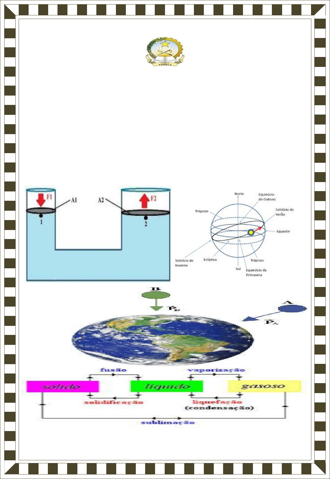 <p>[Escrever texto] [Escrever texto] [Escrever texto]</p><p>Professor: Amândio Caindji Lucas Serafim “AMILSON”</p><p>REPÚBLICA DE ANGOLA</p><p>MINISTÉRIO DA EDUCAÇÃO</p><p>Iº CICLO DE ENSINO SECUNDÁRIO</p><p>FÍSICA</p><p>CONTEÚDOS DO PROFESSOR 7ª CLASSE</p><p>Elaborado por: Téc. Amândio Serafim</p><p>Professor: Amândio Caindji Lucas Serafim</p><p>ÍNDICE GERAL</p><p>Tema 1 – O Universo</p><p>Subtema: 1.1. O sistema solar</p><p> O sistema solar</p><p> O céu diurno - O Sol</p><p> O movimento aparente do sol</p><p> A influência do sol sobre a Terra</p><p> O céu nocturno. As estrelas. O movimento diário das estrelas</p><p> Luz e cor</p><p> Processos de orientação</p><p>TEMA 2 – A FÍSICA E AS GRANDEZAS FÍSICAS</p><p>Subtema: 2.1. A Física e a Natureza</p><p> Introdução: O que estuda a Física e origem da Física</p><p> Ramos da Física</p><p> A Física e a tecnologia</p><p>Subtema: 2.2. Grandezas Físicas e sua medição</p><p> Grandezas Físicas e sua medição</p><p> Tipos de grandezas físicas</p><p> Sistemas de unidades de medidas</p><p> Medidas de comprimento</p><p> Medidas de peso</p><p> Medidas de capacidade</p><p> Medidas de superfície</p><p> Medidas de volume</p><p>Tema 3 – Estrutura e Estado de Agregação de uma Substância</p><p>Subtema: 3.1. Estados físicos das substâncias</p><p> Noções elementares sobre a estrutura das substâncias</p><p> Estados físicos de agregação: sólido, líquido e gasoso</p><p> Agregação e movimentos moleculares</p><p> Introdução à teoria Cinética Molecular</p><p> Dilatação e difusão</p><p> Movimento Browniano</p><p> Temperatura e movimentos moleculares</p><p>Tema 4 – Força E Massa</p><p>Subtema: 4.1. Forças e interacções</p><p> Tipo de forças e seus efeitos</p><p> A força como grandeza vectorial. Sua representação gráfica;</p><p> Unidade de medida da força</p><p> Composição de forças. Força resultante</p><p> Força elástica</p><p> Dinamómetros. Balanças</p><p> Medição de intensidades de forças</p><p> Peso de um corpo. Factores de que depende</p><p> Força de atrito</p><p> Forças de atrito na Natureza e na Técnica</p><p>Professor: Amândio Caindji Lucas Serafim</p><p> Pressão e força de pressão;</p><p> Unidade S.I de pressão</p><p> A pressão na Natureza e na Técnica</p><p>Subtema: 4.2. Massa e inércia</p><p> Medição de massas.</p><p> Unidade de medida de massa</p><p> Outras unidades de medida de massa mais utilizadas</p><p> Densidade de um corpo</p><p>Tema 5 – Pressão nos Líquidos e nos Gases</p><p>Subtema: 5.1. Líquidos: vasos comunicantes</p><p> Superfície livre dos líquidos</p><p> Vasos comunicantes</p><p>Subtema: 5.2. Líquidos: forças de pressão</p><p> Pressão no interior dos líquidos</p><p> Paradoxo hidrostático</p><p>Subtema: 5.3. Pressão nos líquidos. Princípio de Pascal</p><p> Princípio de Pascal</p><p> Prensa hidráulica</p><p> Outras aplicações do Princípio de Pascal</p><p>Subtema: 5.4. Princípio de Arquimedes: Impulsão</p><p> Princípio de Arquimedes</p><p> Impulsão</p><p> Aplicações</p><p>Subtema: 5.5. Pressão dos gases. Pressão atmosférica</p><p> Pressão dos gases</p><p> Pressão atmosférica. Barómetros</p><p> Unidades de pressão atmosférica</p><p>Professor: Amândio Caindji Lucas Serafim</p><p>Tema # 1 – O Universo</p><p>Subtema: 1.1. O sistema solar</p><p>Sumário: O sistema solar</p><p>Na Física, a palavra Universo ou Cosmos: é conjunto de tudo o que existe desde</p><p>as partículas mais pequenas que formam todos até aos astros situados á distâncias</p><p>maiores.</p><p>Ex: Os seres vivos, os astros, as moléculas, as células, os objectos e os fenómenos que</p><p>decorrem na Natureza, constituem uma parte do Universo. Para além dela, temos o Sol, a</p><p>Lua, os Planetas e as Estrelas.</p><p>Entre os principais personagens da Física dos raios cósmicos, mencionamos os</p><p>seguintes: Louis Leprince-Ringuet, Clifford Butter e Patrick Blackett.</p><p>A ciência que estuda os astros, bem como o Universo, chama-se Astronomia e</p><p>faz parte das ciências físicas (Geologia, Química e a Física).</p><p>Sistema Solar: é conjunto constituído pelo Sol (que está ao centro do sistema) e</p><p>por um grande número de outros corpos celestes que giram em torno dele.</p><p>Planeta, em latim «errante» “que procede mal, errado”. Como efeito, a posição</p><p>dos planetas no céu estrelado muda de modo sensível no decorrer de algumas semanas.</p><p>Isto, deve-se ao facto de eles se mover a velocidades entre 8 e 45km/s. Ao redor do Sol</p><p>em trajectória léntica é circunferência.</p><p>Os Planetas: são corpos celestes sem luz e calor próprios, sólidos, arredondados</p><p>e com gravidade própria, os que giram em torno de uma estrela maior.</p><p>Os Planetas distinguem-se pelo seu tamanho e pela sua composição:</p><p> Os (04) planetas interiores: Mercúrio, Vénus, Terra e Marte: são pequenos</p><p>corpos sólidos, essencialmente rochosos.</p><p> Os (04) planetas seguintes: Júpiter, Saturno, Úrano e Neptuno: são planetas</p><p>gigantes formados por gases (hidrogénio e hélio).</p><p> O Plutão é um pequeno planeta constituído aparentemente por gelo.</p><p>Planeta</p><p>Diâmetro</p><p>(em km)</p><p>Período de rotação (em dias</p><p>terrestres)</p><p>Período de translação (em</p><p>dias terrestres)</p><p>Mercúrio 4 880 88 59</p><p>Vénus 12 100 243 225</p><p>Terra 12 756 1 365</p><p>Marte 6 700 1,03 187</p><p>Júpiter 142 800 0,38 4 380</p><p>Saturno 120 000 0,44 29,5</p><p>Úrano 51 520 0,83 30 660</p><p>Neptuno 50 000 0,67 69 225</p><p>Plutão 2 500 6 90 885</p><p>Mercúrio: é o planeta mais próximo do Sol e rochoso provavelmente constituído</p><p>por um núcleo de ferro rodeado por uma camada de silicatos. Dista do Sol 45 600 000km</p><p>e completa a sua orbita em 88 dias e gira sobre si mesmo em 59 dias; a sua superfície</p><p>Professor: Amândio Caindji Lucas Serafim</p><p>está alte