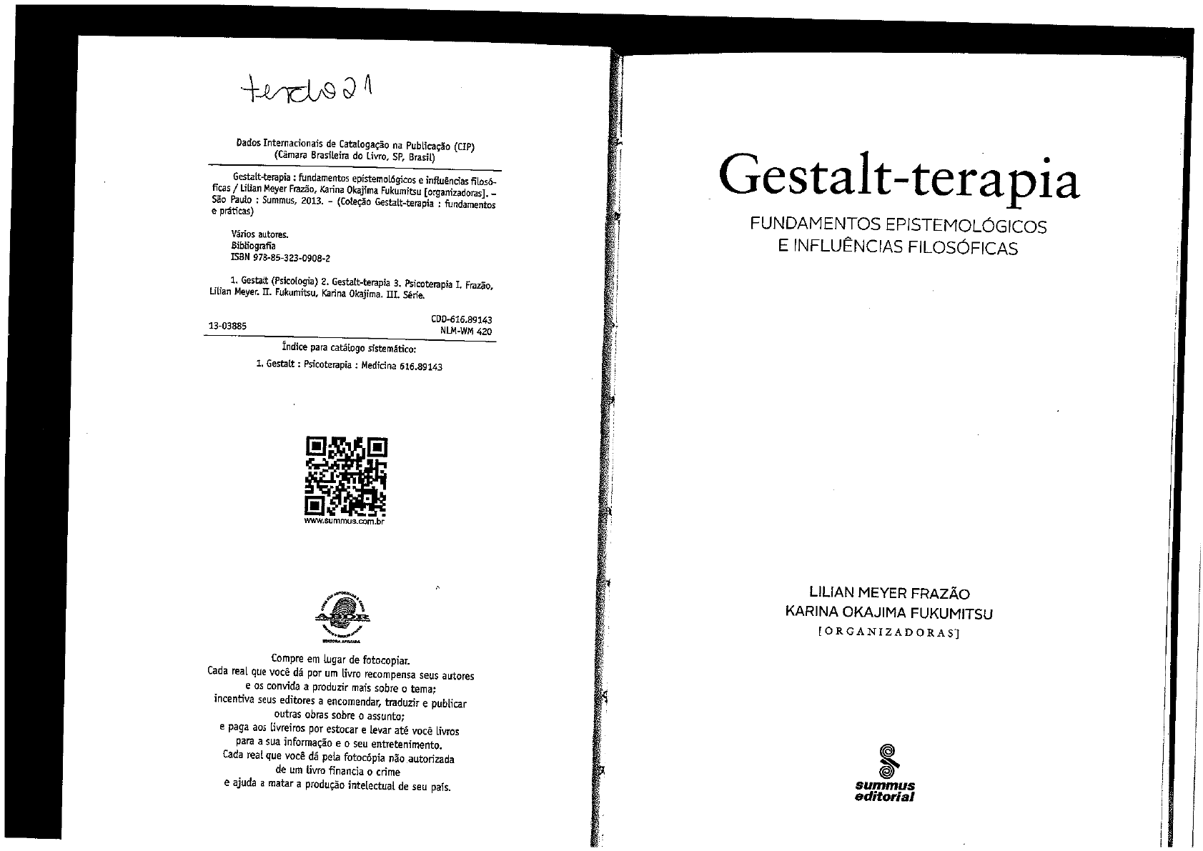 <p>Dados Internacionais de Catalogação na Publicação (CIP) (Câmara Brasileira do Livro, SP, Brasil) Gestalt-terapia : fundamentos epistemológicos e influências ficas / Lilian Meyer Frazão, Karina Okajima Fukumitsu [organizadoras]. Gestalt-terapia São Paulo : Summus, 2013. - (Coleção Gestalt-terapia : fundamentos e práticas) FUNDAMENTOS EPISTEMOLÓGICOS Vários autores. E INFLUÊNCIAS FILOSÓFICAS Bibliografia ISBN 978-85-323-0908-2 1. Gestalt (Psicologia) 2. Gestalt-terapia 3. Psicoterapia I. Frazão, Lilian Meyer. II. Fukumitsu, Karina Okajima. III. CDD-616.89143 13-03885 NLM-WM 420 Índice para catálogo 1. Gestalt : Psicoterapia : Medicina 616.89143 www.summus.com.br LILIAN MEYER FRAZÃO KARINA OKAJIMA FUKUMITSU Compre em lugar de fotocopiar. Cada real que você dá por um livro recompensa seus autores e os convida a produzir mais sobre o tema; incentiva seus editores a encomendar, traduzir e publicar outras obras sobre 0 assunto; e paga aos livreiros por estocar e levar até você livros para a sua informação e seu entretenimento. Cada real que você dá pela fotocópia não autorizada de um livro financia crime summus e ajuda a matar a produção intelectual de seu país. editorial</p><p>Lilian Meyer Frazão e Karina Okajima Fukumitsu (orgs.) FRAZÃO, L. "Psicologia da Gestalt". In: L. M.; FUKUMITSU, K.O. (orgs.). Gestalt-terapia: fundamentos epistemológicos e influências filosóficas. São Paulo: Summus, 2013, p. 99-113. ORGLER, S. "Teoria paradoxal da mudança/mudança". In: D'ACRI, G.; LIMA, P.; OR- GLER, S. (orgs.). Dicionário de Gestalt-terapia - São Paulo: Summus, 11 2007, p. 214-5. PERLS. Escarafunchando Fritz: dentro e fora da lata de lixo. São Paulo: Summus, Concepção de neurose 1979. em Gestalt-terapia YONTEF, G.M. Processo, diálogo e awareness - Ensaios em Gestalt-terapia. São Pau- lo: Summus, 1998. ANGELA SCHILLINGS Segundo Perls (1981, p. 38), "a neurose é como uma doença que surge quando o indivíduo, de alguma forma, interrompe os processos contínuos da vida e se sobrecarrega com tantas situações incompletas que não pode prosseguir satisfatoria- mente com o processo de viver". Partindo dessa colocação, é necessário inicialmente descrever como se desenvolve o pro- cesso saudável de contato para depois compreender as ocor- rências geradoras da interrupção de contato, que em Gestalt- -terapia é denominada neurose. Na vida, necessitamos de contato para sobreviver. Esta- mos sempre em contato com o meio, seja para a realização de nossas necessidades fisiológicas, seja para a satisfação de nos- sas necessidades emocionais. Nesse sentido, pessoa e ambien- te são indissociáveis - que em nossa abordagem nomeamos de campo. A relação do ser humano no seu ambiente lhe dá organização, tanto no sentido de ser social quanto no de ser singular no mundo em que vive. Nessa indissociabilidade pes- 192 193</p><p>Lilian Meyer Frazão e Karina Okajima Fukumitsu (orgs.) Gestalt-terapia Conceitos fundamentais soa/ambiente, não é possível falar em situações isoladas nem em ocorrências separadas entre cada uma das partes desse mento criativo e sua busca de solução vindoura; e, inversamente, todo. Portanto, o que é considerado saudável ou não saudável se ele aliena o que não é organicamente seu e, portanto, não pode é forjado nessa relação de campo. ser vitalmente interessante, pois dilacera a figura/fundo, nesse Quando em Gestalt-terapia falamos de funcionamento caso, ele é psicologicamente sadio, porque está exercendo sua ca- saudável, estamo-nos referindo à integração da pessoa e do pacidade superior e fará o que melhor puder nas circunstâncias ambiente ocorrendo por meio de ajustamentos criativos na difíceis do Contudo, ao contrário, se ele se aliena e, devido formação e destruição de Gestalten, ou seja, o fluxo de conta- a identificações falsas, tenta subjugar sua própria espontaneidade, to que se desenvolve. De acordo com Tellegen (1982, p. 84-5): torna sua vida insípida, confusa e dolorosa. "Experiência humana é relação, é contato [...]. Contato é o processo contínuo de reciprocidade em que homem e mundo FUNCIONAMENTO SAUDÁVEL E AJUSTAMENTO CRIATIVO se transformam". desenvolvimento saudável do ser humano consiste em Para haver contato é necessário que apareça algo na frontei- lidar com as circunstâncias de vida como elas se apresentam, ra de contato que excite o organismo, ativando-o. Tal ocor- buscando satisfazer as necessidades emergentes apesar dos rência recebe várias denominações como excitação, excita- obstáculos que porventura apareçam e procurando solucio- mento, início de formação da Gestalt, início de delineamento nar os problemas por meio de ações viáveis (entende-se por de uma figura -, sendo uma condição básica da vida humana problema a situação aberta que busca fechamento). Ao con- em contato com o mundo. Tocamos e somos tocados pelo trário, quando a pessoa não consegue lidar com as situações mundo a todo instante por meio da nossa sensorialidade. O com que depara, não fazendo ajustamentos satisfatórios para mundo nos toca mobilizando nossa visão, audição, olfato, dar curso ao que lhe é necessário nem utilizando o que existe gustação e sensação tátil esses são os órgãos dos sentidos. em si e no meio mediante novos rearranjos, seu funcionamen- A partir do momento em que somos tocados, movemo-nos to apresenta indisponibilidade na forma criativa de viver; a em direção ao estímulo que nos tocou, fazendo um movi- pessoa está interrompida no contato e seu funcionamento não mento de expansão ou de retração em relação a ele. Quando está saudável. há expansão na relação com o que nos mobilizou, a fronteira Segundo Perls, Hefferline e Goodman (1997, p. 49), se expande, possibilitando que o contato siga seu curso; ao contrário, quando há retração, não havendo então permeabi- [...] a descrição da saúde e doença psicológicas