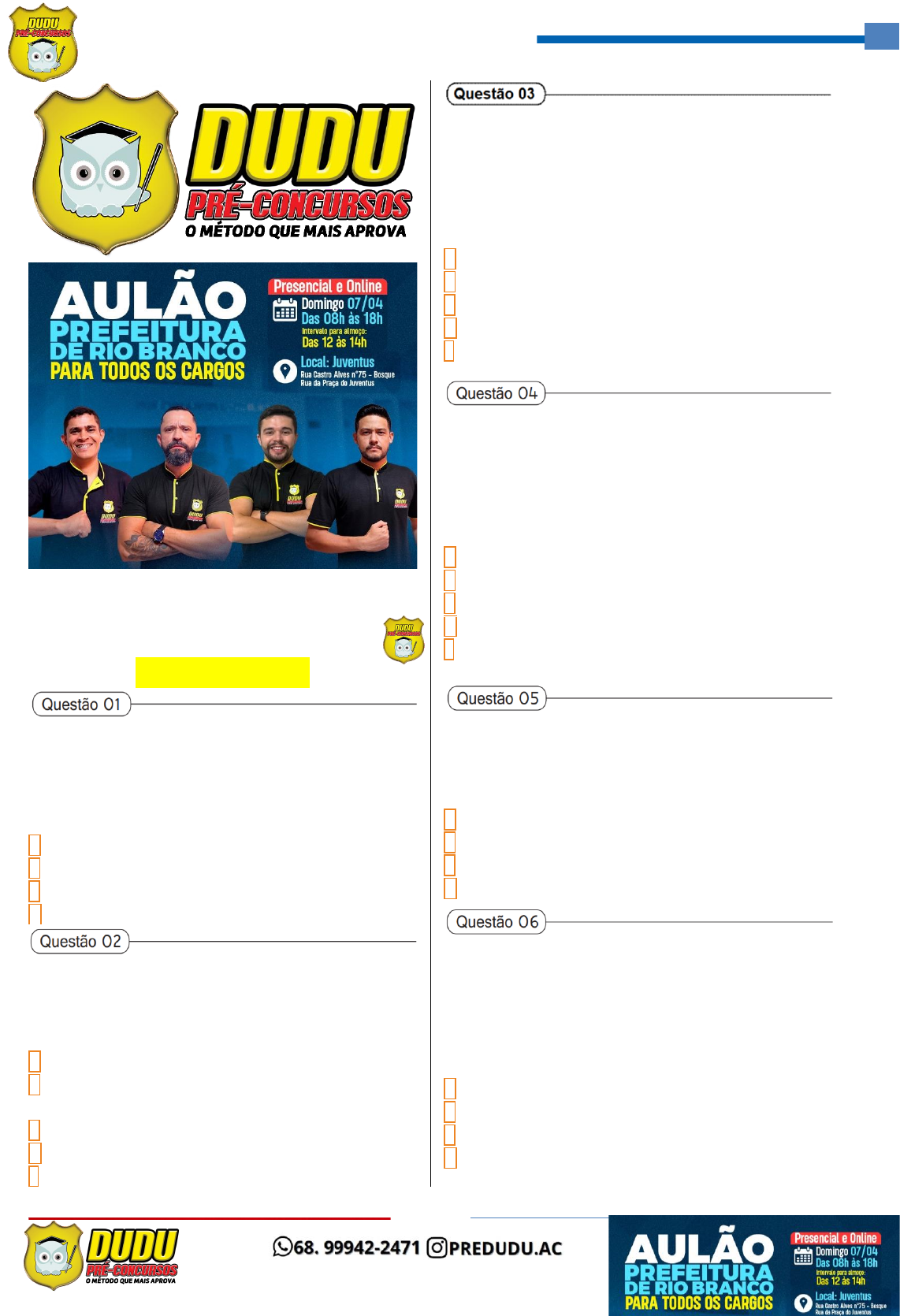 <p>Página 1</p><p>1 DUDU PRÉ-CONCURSOS</p><p>INSTRUTOR: FILIPI SANTOS</p><p>Aluno: _________________________________</p><p>INFORMÁTICA</p><p>No Windows, a extensão dos arquivos permite</p><p>que o sistema trate cada um deles de forma</p><p>diferente. As três extensões que representam</p><p>arquivos do tipo: texto, imagem e planilha de</p><p>dados são, respectivamente:</p><p>A CSV, GIF, JPG.</p><p>B GIF, JPG, PNG.</p><p>C TXT, JPG, XLSX.</p><p>D DOCX, PNG, JPG.</p><p>Quando se deseja enviar um arquivo por e-mail,</p><p>recomenda-se adaptá-lo ao formato “.ZIP”, antes</p><p>do envio, com o objetivo de</p><p>Alternativas</p><p>A adicionar-lhe criptografia.</p><p>B reduzir seu tamanho e economizar tempo de</p><p>envio.</p><p>C aumentar a qualidade do arquivo anexado.</p><p>D incluí-lo como arquivo seguro.</p><p>E torná-lo um arquivo elegível para o usuário.</p><p>Google é um serviço de busca que permite,</p><p>através da combinação de palavras-chaves, obter</p><p>melhores resultados. A busca por uma expressão</p><p>por inteiro, por exemplo, Câmara de Caldas Novas,</p><p>no Google, pode ser feita a partir da digitação de</p><p>Alternativas</p><p>A (Câmara de Caldas Novas)</p><p>B “Câmara de Caldas Novas”</p><p>C \* Câmara de Caldas Novas</p><p>D Câmara_de_Caldas_Novas</p><p>E {Câmara de Caldas Novas}</p><p>Quando se acessa uma página na internet, é</p><p>comum determinar o grau de segurança e validez</p><p>desta através de um certificado digital. O</p><p>certificado digital que garante que o site é seguro</p><p>é</p><p>Alternativas</p><p>A HTTPS.</p><p>B HTTP.</p><p>C 3G/Safe.</p><p>D HTTP/Safe.</p><p>E 3G/Secure.</p><p>LibreOffice e Microsoft Office são pacotes de</p><p>software muito utilizados para a editoração de</p><p>textos, planilhas e apresentações, sendo que</p><p>Alternativas</p><p>A ambos são de código aberto.</p><p>B o primeiro é gratuito e de código aberto.</p><p>C ambos são de código fechado.</p><p>D o segundo é gratuito e de código aberto.</p><p>No Google Chrome, ao utilizar o sistema</p><p>operacional Windows, quais são os atalhos de</p><p>teclado corretos para realizar as seguintes ações:</p><p>“abrir uma nova janela” e “abrir uma nova guia e</p><p>acessá-la”?</p><p>Alternativas</p><p>A “Ctrl + n” e “Ctrl + t”.</p><p>B “Ctrl + a” e “Ctrl + t”.</p><p>C “Ctrl + m” e “Ctrl + a”.</p><p>D “Ctrl + n” e “Ctrl + z”.</p><p>Página 2</p><p>2 DUDU PRÉ-CONCURSOS</p><p>Cada organização, empresa ou instituição, pública</p><p>ou particular, comumente utiliza-se de e-mails</p><p>corporativos para realizar comunicações internas</p><p>com seus colaboradores. Sendo assim, a estrutura</p><p>de endereço de correio eletrônico para um</p><p>servidor governamental deve ser:</p><p>Alternativas</p><p>A servidor:br.usuario.edu</p><p>B usuario/servidor/com/br</p><p>C servidor#usuario.org</p><p>D usuario@servidor.gov.br</p><p>E Servidor&usuario.org</p><p>Serviços de correio eletrônico são sistemas que</p><p>permitem o envio, o recebimento e o</p><p>gerenciamento de mensagens eletrônicas,</p><p>conhecidas como e-mails. Esses serviços</p><p>funcionam por meio de protocolos de</p><p>comunicação, como SMTP, POP3 ou IMAP. Eles</p><p>possibilitam a troca de mensagens entre usuários</p><p>através de uma rede de computadores de forma</p><p>rápida e eficiente. É considerada uma</p><p>característica do protocolo IMAP:</p><p>Alternativas</p><p>A ser usado para enviar e-mails entre servidores</p><p>assim como o SMTP.</p><p>B permitir o acesso a e-mails em vários</p><p>dispositivos sem baixá-los.</p><p>C ser o protocolo mais antigo e menos seguro em</p><p>comparação com POP3.</p><p>D fazer downloads de mensagens para o</p><p>dispositivo do usuário e removê-las do servidor</p><p>de e-mails.</p><p>Sophia recebeu a seguinte mensagem por e-</p><p>mail e percebeu que Pedro não estava na</p><p>cópia:</p><p>De: julio@email.com Para: sophia@email.com Cc:</p><p>tomas@email.com Assunto: Reunião Olá Sophia,</p><p>vamos fazer uma reunião amanhã, com o Tomas</p><p>e o Pedro, 9h.</p><p>Para compartilhar a mensagem com Pedro, que</p><p>não está nas linhas Para nem Cc, Sophia deve</p><p>Alternativas</p><p>A Encaminhar.</p><p>B Responder.</p><p>C Mover.</p><p>D Redirecionar.</p><p>E Categorizar.</p><p>Um usuário do LibreOffice Calc pretende calcular a</p><p>média de valores dos produtos listados na tabela a</p><p>seguir:</p><p>Para encontrar a média correta dos valores</p><p>listados na tabela, o usuário deverá utilizar a</p><p>fórmula:</p><p>Alternativas</p><p>A =MÉDIA(B2:B6)</p><p>B =MED(B2:B6)</p><p>C =MÉDIA(B1:B6)</p><p>D =B2+B3+B4+B5+B6/5</p><p>O Excel é essencial para agentes públicos devido à</p><p>sua capacidade de análise de dados, gestão</p><p>financeira e planejamento de projetos. Ele</p><p>simplifica o acompanhamento de recursos</p><p>humanos e a criação de relatórios, além de facilitar</p><p>a tomada de decisões informadas. Com suas</p><p>diversas funcionalidades, como tabelas dinâmicas</p><p>e gráficos, o Excel se torna uma ferramenta</p><p>indispensável na administração pública,</p><p>proporcionando eficiência e organização em</p><p>diferentes áreas de atuação governamental.</p><p>Diante do exposto, assinale a alternativa que</p><p>apresenta o resultado da formula</p><p>=SOMA(B2;C1;A2) de acordo com a tabela</p><p>seguinte.</p><p>Página 3</p><p>3 DUDU PRÉ-CONCURSOS</p><p>Alternativas</p><p>A O resultado da fórmula aplicada é 8.</p><p>B O resultado da fórmula aplicada é 12.</p><p>C O resultado da fórmula aplicada é 16.</p><p>D O resultado da fórmula aplicada é 21.</p><p>No contexto dos navegadores para acesso à</p><p>internet, qual alternativa apresenta dois</p><p>aplicativos específicos para essa finalidade?</p><p>Alternativas</p><p>A Autodesk AutoCAD e Tor Browser.</p><p>B Opera e Spotify.</p><p>C Safari e Mozilla Firefox.</p><p>D Mozilla Firefox 