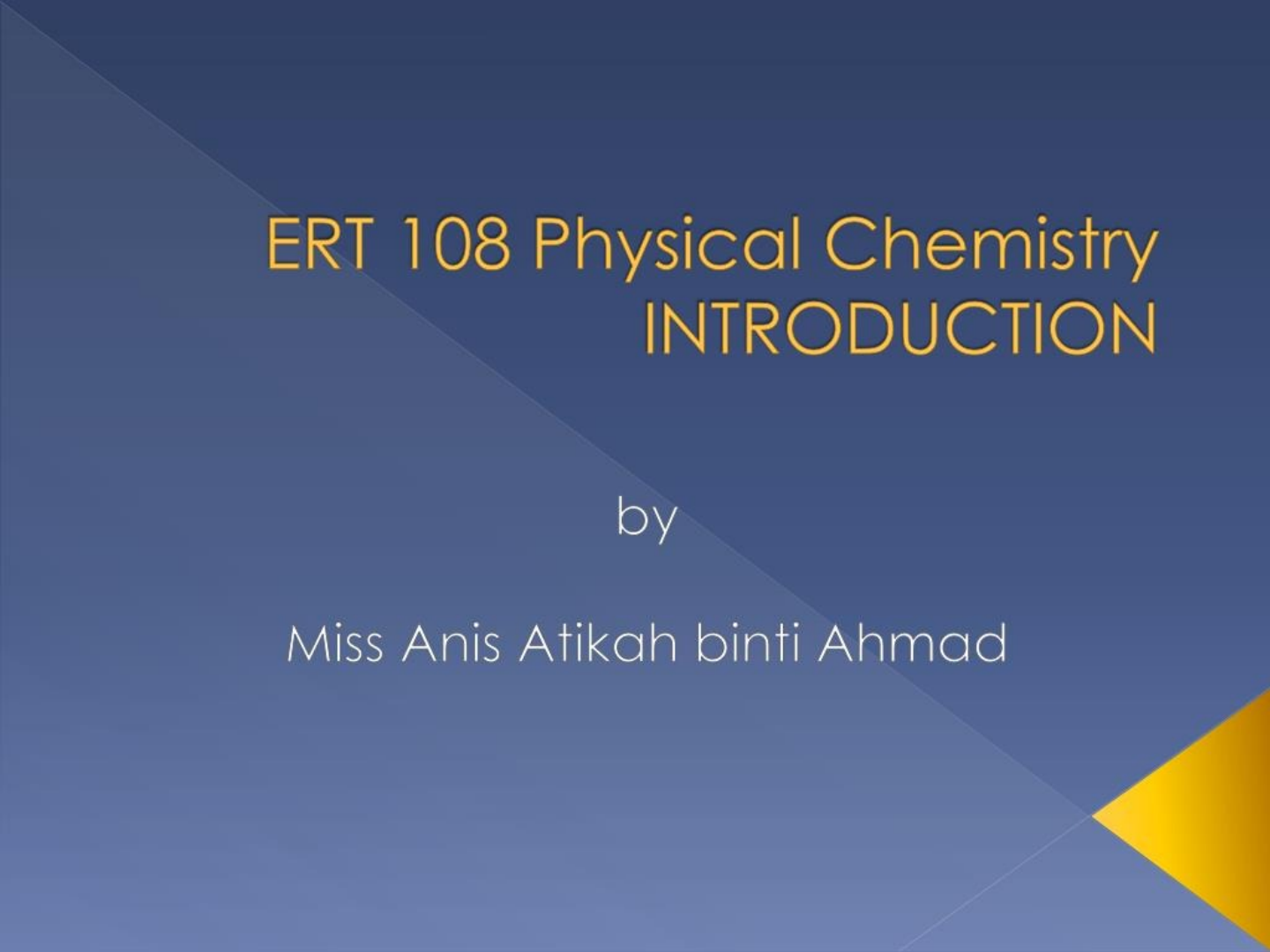 <p>ERT 108 Physical Chemistry INTRODUCTION by Miss Anis Atikah binti Ahmad</p><p>COURSE STRUCTURE Course : Physical Chemistry Course Code: ERT 108 Course Type: Core Unit : 3 Pre-requisite of ERT 206 Thermodynamics Lecturers: Miss Anis Atikah binti Ahmad Dr Mohd Irfan Hatim</p><p>LEARNING OUTCOMES At the end of the course, students are expected to be: Able to define and apply the phenomena, basic concepts, laws and principles in physical chemistry Able to calculate and solve a problem concerning physical chemistry. Able to illustrate various fundamental laws in physical chemistry.</p><p>EVALUATION CONTRIBUTION Final Exam (50%) Mid Term Exams (20%) Continuous Assessment (30%) Assignments (20%) Quizzes (10%)</p><p>BOOKS Text Book: Atkins, P and de Paula, Julia. 2009. Physical Chemistry. Oxford University Press, 9th Edition. Reference Books: Bahl, B.S.; Bahl, Arun & Tuli, G.D. 2006. Essentials of Physical Chemistry. S. Chand, New Delhi. Paul Monk, 2004. Physical Chemistry, John Wiley & Sons. Levine I. N. 2002. Physical Chemistry, McGraw Hill, 5th Edition. Silbey R. J., Alberty R. A., Bawendi M. G. 2005. Physical Chemistry, John Wiley & Son, Inc., 4th Edition.</p><p>LESSON PLAN Minggu/Week Kandungan Kursus / Course Contents Pensyarah/Lecturer (Panduan/Guidelines) 1. Introduction to Physical Chemistry What is Physical chemistry Week 1 Thermodynamics Miss Anis Atikah (17 Feb-21 Feb) Variables, relationship & Laws Physical and Molecular interactions ( 3 hours ) 2.0 The First Law of Thermodynamics The First Law of Thermodynamics Week 2-3 Enthalpy (24 Feb-7 Heat Capacities Miss Anis Atikah March) The Joule and Joule - Thomson Experiments Perfect gases and The First Law Calculation of First Law Quantities (6 hours) 3. The Second Law of Thermodynamics The Second Law of Thermodynamics Heat Engines Week 4-5 Entropy (10 March-21 Calculation of entropy changes Miss Anis Atikah March) Entropy, Reversibility and Irreversibility The thermodynamics temperature scale What is entropy? ( 6 hours)</p><p>LESSON PLAN (cont.) Minggu/Week Kandungan Kursus / Course Contents (Panduan/Guidelines) 4.0 Material Equilibrium Material Equilibrium Thermodynamics Properties of Nonequilibrium System. Entropy and Equilibrium Week 6-7 The Gibbs and Hemholtz Function Miss Anis Atikah (24 March-4 Thermodynamic Relation for a system in Apr) equilibrium Calculation of changes in state function Phase Equilibrium Reaction Equilibrium (6 hours) Week 8 CUTI PERTENGAHAN SEMESTER/MID-TERM BREAK (7 Apr-11 Apr) 5.0 Standard Thermodynamic Functions of Reaction Standard States Standard Enthalpy of Reaction Week 9 Standard Enthalpy of Formation Dr Mohd Irfan Hatim (14 Apr-18 Apr) Determination of standard enthalpies of Formation and Reaction (3 hours)</p><p>LESSON PLAN (cont.) Minggu/Week Kandungan Kursus / Course Contents (Panduan/Guidelines) 6. Reaction Equilibrium in Ideal Gas Mixture Chemical Potential in an Ideal Gas Mixture Week 10 Ideal-Gas Reaction equilibrium Temperature Dependence of the Equilibrium Dr Mohd Irfan Hatim (21 Apr-25 Apr) constant Ideal-Gas equilibrium Calculations (4 hours) 6. Chemical Kinetics Experimental Chemical and Kinetic Reactions. Week 11 First Order Reactions Dr Mohd Irfan Hatim (28 Apr- 2 May) Second Order Reactions Reaction Rates and Reaction Mechanisms Light Spectroscopy and adsorption Chemistry. (4 hours) 8.0 Phase Diagrams Definitions The Phase Rule Week 12 Two-component Systems (5 May- 9 May) Vapour Pressure Diagrams Dr Mohd Irfan Hatim Temperature-composition Diagrams Liquid-liquid Phase Diagrams Liquid-solid Phase Diagrams (4 hours)</p><p>LESSON PLAN (cont.) Minggu/Week Kandungan Kursus / Course Contents Pensyarah/Lecturer (Panduan/Guidelines) 9.0 Equilibrium Electrochemistry Half-reactions and electrodes Varieties of Cells Week 13-14 The Electromotive Force (12 May- 23 Dr Mohd Irfan Hatim Standard Potentials May) Applications of standard potentials Impact on Biochemistry : Energy Conversion in Biological Cells (6 hours) Week 15 (26 May-30 MINGGU ULANGKAJI / REVISION WEEK May) Week 16-17 (2 June - PEPERIKSAAN AKHIR SEMESTER / FINAL EXAMINATION June)</p><p>INTRODUCTION TO PHYSICAL CHEMISTRY What is Physical Chemistry? the study of the underlying physical principles that govern the properties & behaviour of chemical systems. Large-scale Macroscopic properties of Chemical matter system Microscopic Concepts of molecules</p><p>AREAS OF PHYSICAL CHEMISTRY Can be classified into 4 main areas: Quantum Kinetics chemistry Statistical mechanics Thermodynamics</p><p>AREAS OF PHYSICAL CHEMISTRY Quantum chemistry: application of quantum mechanics to atomic structure, molecular bonding & spectroscopy Thermodynamics: Macroscopic science that studies: i. the interrelationships of the various equilibrium properties of a system & ii. the changes in equilibrium properties in process</p><p>AREAS OF PHYSICAL CHEMISTRY Statistical mechanics: relate quantum chemistry with thermodynamics. Gives insight into why laws of thermodynamics hold & allows calculation of macroscopic thermodynamic properties from molecular properties. Kinetics: study of rate processes. Examples: chemical reaction, diffusion & flow of charge in an electrochemical cell.</p><p>THERMODYNAMICS Is the study of heat, work, energy and the changes they produce in the state of the systems. Work is done to achieve motion Work against an opposing force Example: process of raising a weight against the pull of gravity Energy is the capacity to do work Energy Heat is the transfer of energy as a Heat results of a temperature difference between the system & it surroundings</p><p>Thermodynamic- Basic concepts Part of the universe under study in System thermodynamics Eg: reaction vessel, engine, biological cell Universe The region outside the Surroundings system that can interact with the system</p><p>Type of system: Matter System System System Energy Energy Open system Closed system Isolated system can exchange matter & energy) (no transfer of matter, (can exchange neith