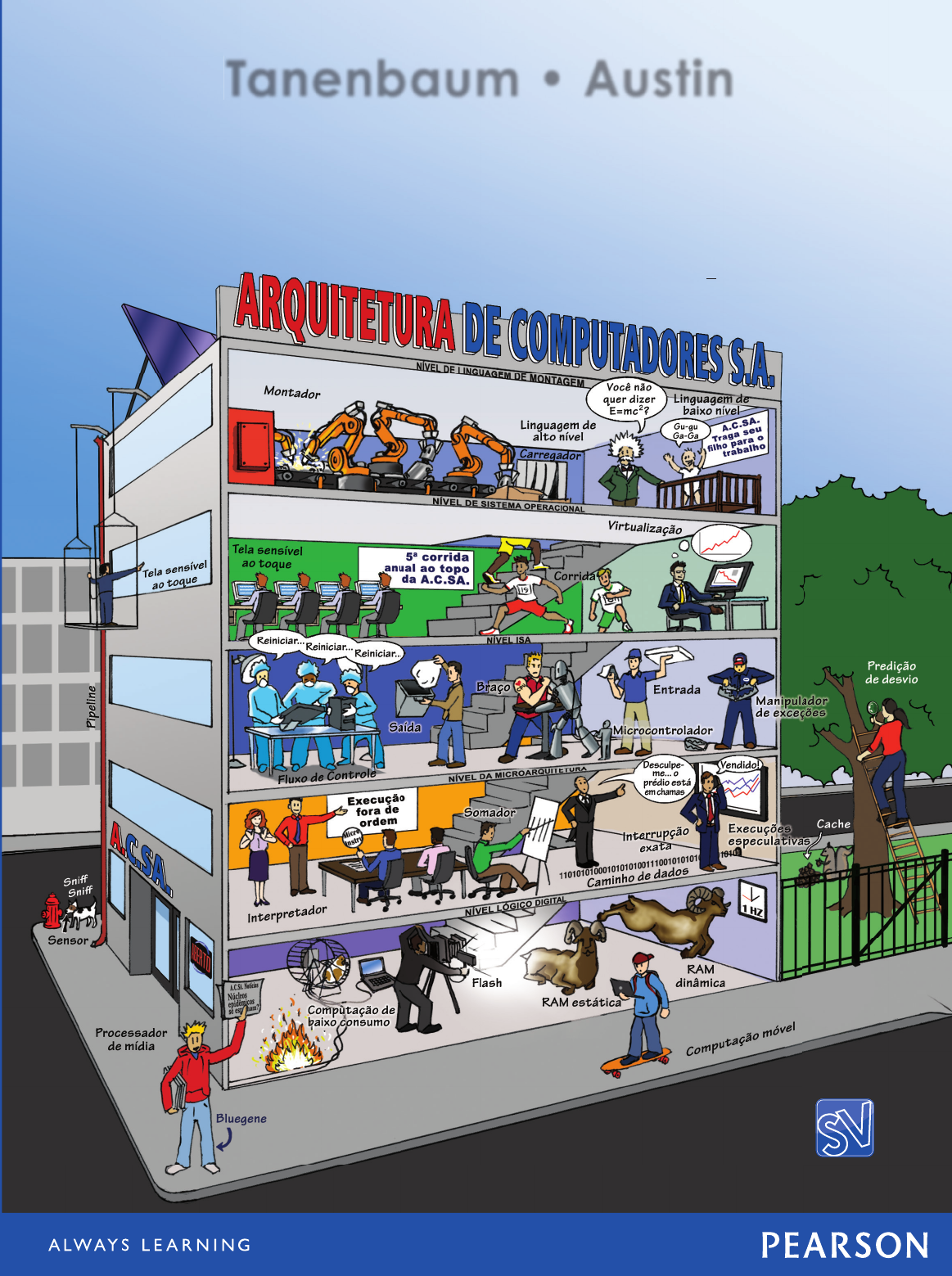 <p>ISBN 978-85-8143-539-8</p><p>C</p><p>om</p><p>p</p><p>u</p><p>tação</p><p>w w w . p e a r s o n . c o m . b r</p><p>sv.pearson.com.br</p><p>A Sala Virtual oferece, para professores, apresentações em PowerPoint e manual de soluções</p><p>(em inglês); para estudantes, download de aplicativos (assembler e tracer), simulador grá� co para</p><p>aplicações do Capítulo 4 e sugestões de leitura para aprofundamento.</p><p>Este livro também está disponível para compra em formato e-book.</p><p>Para adquiri-lo, acesse nosso site.</p><p>Organização estruturada</p><p>de computadores</p><p>Organização estruturada</p><p>de computadores</p><p>O</p><p>rganização estruturada</p><p>de com</p><p>putadores</p><p>Tanenbaum • AustinTanenbaum • Austin</p><p>Ta</p><p>n</p><p>e</p><p>n</p><p>b</p><p>a</p><p>u</p><p>m</p><p>•</p><p>A</p><p>u</p><p>stin</p><p>Esta sexta edição traz o que há de mais moderno em termos de organização</p><p>estruturada de computadores, apresentando as terminologias, tecnologias</p><p>e tendências mais recentes em organização e arquitetura de computadores.</p><p>Com novos exemplos e discussões sobre x86, microcontroladores AVR e</p><p>arquitetura ARM, Organização estruturada de computadores é uma obra</p><p>indispensável para estudantes de ciência da computação, engenharia</p><p>da computação, análise e desenvolvimento de sistemas e sistemas de</p><p>informação, bem como para profissionais da área.</p><p>6a EDIÇÃO</p><p>6a EDIÇÃO</p><p>6a EDIÇÃO</p><p>CVR_TANE5398_6_CVR.indd 1 06/03/2015 08:50:39</p><p>Organização estruturada</p><p>de computadores</p><p>Tanenbaum.indb 1 14/05/13 18:55</p><p>Organização estruturada</p><p>de computadores</p><p>Tanenbaum • Austin</p><p>Tanenbaum.indb 2 14/05/13 18:55</p><p>Organização estruturada</p><p>de computadores</p><p>Tanenbaum • Austin</p><p>6a EDIÇÃO</p><p>Tradução</p><p>DANIEL VIEIRA</p><p>Revisão técnica</p><p>PROF. DR. WAGNER LUIZ ZUCCHI</p><p>professor do Departamento de Sistemas Eletrônicos da Escola politécnica</p><p>da Universidade de São paulo, do programa de pós-Graduação do Instituto de</p><p>pesquisas Tecnológicas (IpT) e da Universidade Nove de Julho. Colaborador</p><p>da revista RTI – Redes, Telecomunicações e Infraestrutura – e consultor de</p><p>diversas empresas na área de redes e telecomunicação digital</p><p>Tanenbaum.indb 3 14/05/13 18:55</p><p>2013</p><p>Direitos exclusivos para a língua portuguesa cedidos à</p><p>Pearson Education do Brasil Ltda.,</p><p>uma empresa do grupo Pearson Education</p><p>Rua Nelson Francisco, 26</p><p>CEP 02712-100 – São Paulo – SP – Brasil</p><p>Fone: 11 2178-8686 – Fax: 11 2178-8688</p><p>vendas@pearson.com</p><p>Dados Internacionais de Catalogação na Publicação (CIP)</p><p>(Câmara Brasileira do Livro, SP, Brasil)</p><p>Tanenbaum, Andrew S.</p><p>Organização estruturada de computadores / Andrew S. Tanenbaum,</p><p>Todd Austin; tradução Daniel Vieira; revisão técnica Wagner Luiz</p><p>Zucchi. -- São Paulo : Pearson Prentice Hall, 2013.</p><p>Título original: Structured computer organization.</p><p>6 ed. norte-americana.</p><p>Bibliografia.</p><p>ISBN 978-85-4301-379-4</p><p>1. Organização de computador 2. Programação (Computadores)</p><p>I. Austin, Todd. II. Título.</p><p>13-04217 CDD-005.1</p><p>Índice para catálogo sistemático:</p><p>1. Organização estruturada de computadores:</p><p>Ciências da computação 005.1</p><p>©2013 by Andrew S. Tanenbaum e Todd Austin</p><p>Todos os direitos reservados. Nenhuma parte desta publicação poderá ser reproduzida ou</p><p>transmitida de qualquer modo ou por qualquer outro meio, eletrônico ou mecânico, incluindo</p><p>fotocópia, gravação ou qualquer outro tipo de sistema de armazenamento e transmissão de</p><p>informação, sem prévia autorização, por escrito, da Pearson Education do Brasil.</p><p>Diretor editorial e de conteúdo Roger Trimer</p><p>Gerente editorial Kelly Tavares</p><p>Supervisora de produção editorial Silvana Afonso</p><p>Coordenadora de desenvolvimento Danielle Sales</p><p>Coordenador de produção editorial Sérgio Nascimento</p><p>Coordenadora de produção gráfica Tatiane Romano</p><p>Editor de aquisições Vinícius Souza</p><p>Editora de texto Daniela Braz</p><p>Editor assistente Luiz Salla</p><p>Preparação Christiane Colas</p><p>Tradução Daniel Vieira</p><p>Revisão técnica Wagner Luiz Zucchi</p><p>Revisão Guilherme Summa</p><p>Capa Solange Rennó</p><p>(adaptação do projeto original)</p><p>Projeto gráfico e diagramação Casa de Ideias</p><p>Tanenbaum.indb 4 14/05/13 18:55</p><p>Sumário</p><p>PREFÁCIO xv</p><p>dEdICatóRIa xviii</p><p>1 INtROdUÇÃO 1</p><p>1.1 ORGANIZAÇÃO ESTRUTURADA DE COMPUTADOR 2</p><p>1.1.1 Linguagens, níveis e máquinas virtuais 2</p><p>1.1.2 Máquinas multiníveis contemporâneas 4</p><p>1.1.3 Evolução de máquinas multiníveis 6</p><p>1.2 MARCOS DA ARQUITETURA DE COMPUTADORES 10</p><p>1.2.1 A geração zero — computadores mecânicos (1642–1945) 10</p><p>1.2.2 A primeira geração — válvulas (1945–1955) 13</p><p>1.2.3 A segunda geração — transistores (1955–1965) 15</p><p>1.2.4 A terceira geração — circuitos integrados (1965–1980) 17</p><p>1.2.5 A quarta geração — integração em escala muito grande (1980–?) 18</p><p>1.2.6 A quinta geração — computadores de baixa potência e invisíveis 20</p><p>1.3 O ZOOLÓGICO DOS COMPUTADORES 22</p><p>1.3.1 Forças tecnológicas e econômicas 22</p><p>1.3.2 Tipos de computadores 23</p><p>1.3.3 Computadores descartáveis 24</p><p>1.3.4 Microcontroladores 26</p><p>1.3.5 Computadores móveis e de jogos 27</p><p>1.3.6 Computadores pessoais 28</p><p>1.3.7 Servidores 29</p><p>1.3.8 Mainframes 30</p><p>1.4 EXEMPLOS DE FAMÍLIAS DE COMPUTADORES 30</p><p>1.4.1 Introdução à arquitetura x86 31</p><p>1.4.2 Introdução à arquitetura ARM 35</p><p>1.4.3 Introdução à arquitetura AVR 37</p><p>1.5 UNIDA