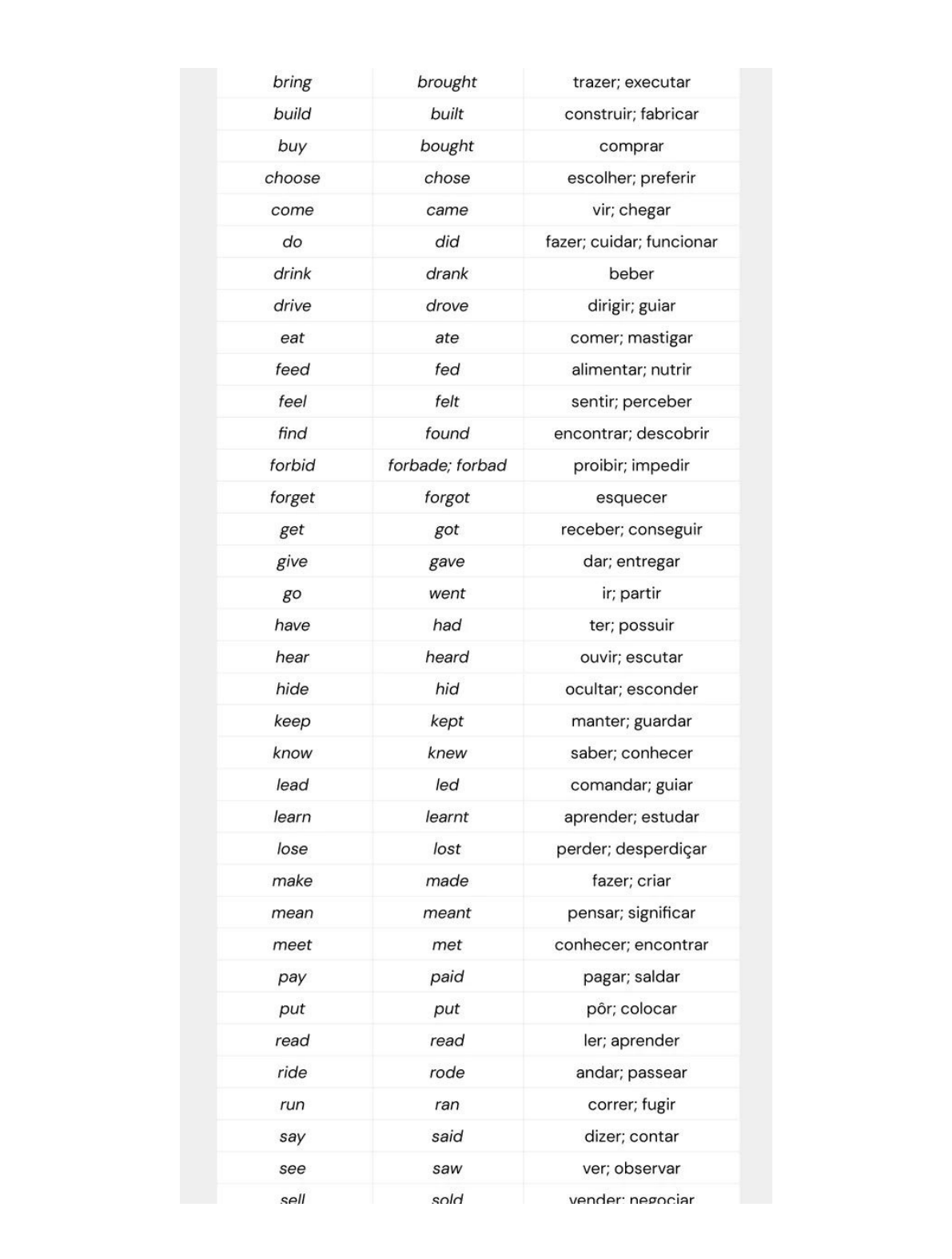 <p>Exercises + irregular verbs</p><p>1) Escreve a forma correta dos verbos no Simple Past</p><p>a) Work - Play - Use</p><p>b) Ask - Listen - Open</p><p>c) Watch - Stay - Study</p><p>d) Talk - Cry - Close</p><p>e) Answer - Need</p><p>2) Selecione a forma correta do verbo a seguir</p><p>a) Eat</p><p>b) Sleep</p><p>c) Take</p><p>Eated</p><p>Eaten</p><p>Ate</p><p>Slept</p><p>Sleeped</p><p>Sleepted</p><p>Took</p><p>Taked</p><p>Tooked</p>