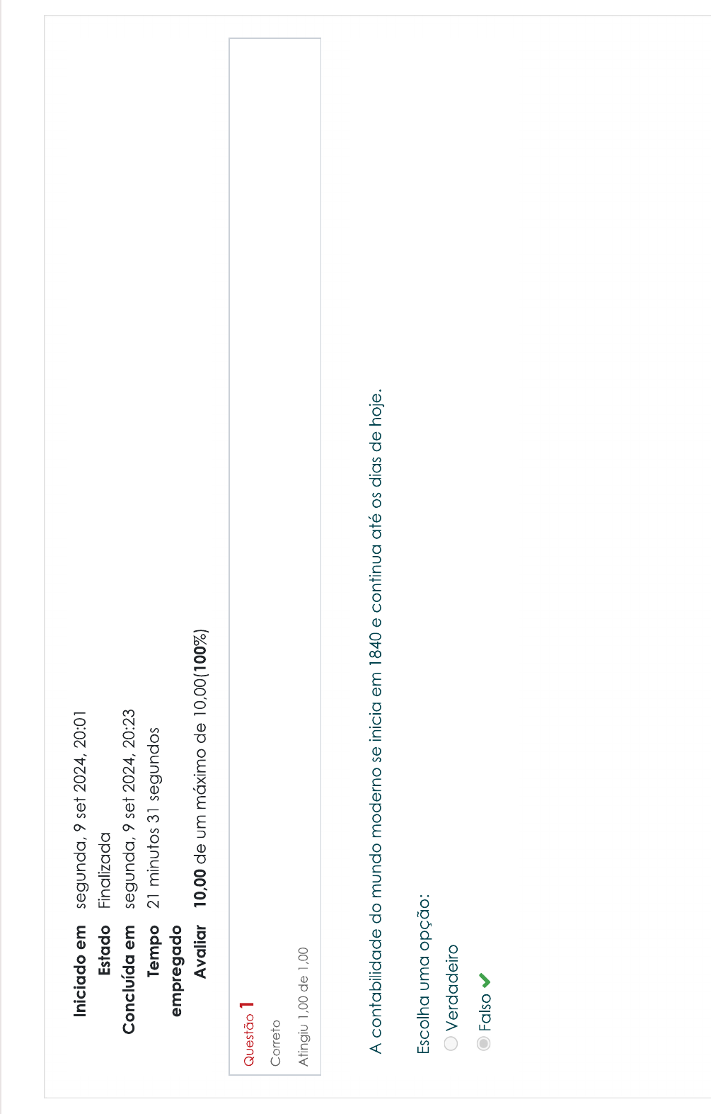<p>Iniciado em segunda, 9 set 2024, 20:01 Estado Finalizada Concluída em segunda, 9 set 2024, 20:23 Tempo 21 minutos 31 segundos empregado Avaliar 10,00 de um máximo de 10,00(100%) Questão 1 Correto Atingiu 1,00 de 1,00 A contabilidade do mundo moderno se inicia em 1840 e continua até os dias de hoje. Escolha uma opção: Verdadeiro Falso</p><p>Questão 2 Correto Atingiu 1,00 de 1,00 Em qual documento os bens, direitos, obrigações e a participação dos sócios, são explícitas a todos que tenham acesso a este documento? a. Demonstração do Resultado do Exercício b. Demonstração dos Fluxos de Caixa C. Livro diário d. Situação líquida positiva ou superavitária e. Balanço patrimonial Questão 3 Correto Atingiu 1,00 de 1,00 ATIVO representa os valores positivos do patrimônio (bens + direitos). É onde estão aplicados os recursos da empresa.</p><p>Questão 4 Correto Atingiu 1,00 de 1,00 Por que a contabilidade é considerada indispensável para as empresas, especialmente em relação a órgãos governamentais, bancos, fornecedores e investidores? a. Porque é uma exigência legal imposta pelo governo b. Porque garante a segurança física da empresa C. Porque facilita processo de contratação de funcionários d. Porque fornece informações essenciais para a tomada de decisões e estabelece credibilidade perante investidores e instituições e. Porque ajuda na publicidade e marketing da empresa</p><p>Questão 5 Correto Atingiu 1,00 de 1,00 Associe a contabilidade das épocas: Período que vai de 1494 até 1840, com aparecimento da obra "La Contabilità Applicatta alle Amministrazioni Private e Pubbliche", de Francesco Villa, premiada Contabilidade do mundo moderno pelo governo da Áustria. Obra marcante na história da Contabilidade. Período que se inicia em 1840 e continua até os dias de hoje. A obra de Francesco Contabilidade do mundo científico Villa, em 1840, é considerada marco inicial da contabilidade como ciência. Período que se inicia com a civilização do homem e vai até 1202 da Era quando Leonardo Fibonacci publica Liber Abaci, um compêndio (Obra/livro em Contabilidade do mundo antigo que se encontra resumido mais indispensável de um estudo.) sobre cálculo comercial. Período que vai de 1202 da Era até 1494, com surgimento do Tratactus de Computis et Scripturis (Contabilidade por Partidas Dobradas), de Frei Luca Pacioli, Contabilidade do mundo medieval publicado em 1494, enfatizando que a teoria contábil do débito e do crédito corresponde à teoria dos números positivos e negativos.</p><p>Questão 6 Correto Atingiu 1,00 de 1,00 Complete corretamente a lacuna na frase a seguir e com base nos textos do curso: Contabilidade é a ciência que estuda e pratica, controla e interpreta os fatos ocorridos no patrimônio das entidades, mediante registro, a demonstração EXPOSITIVA e a revelação desses fatos, com fim de oferecer informações sobre a composição do patrimônio, suas variações e resultado econômico decorrente da gestão da riqueza econômica. Questão 7 Correto Atingiu 1,00 de 1,00 Qual é a origem de recursos onde capital é dos outros (terceiros) e estão representados no Balanço Patrimonial pelas obrigações de curto prazo (passivo circulante) e longo prazo (passivo não circulante)? a. Origem de recursos b. Aplicação de recursos C. Capital de terceiros d. Capital próprio</p><p>Questão 8 Correto Atingiu 1,00 de 1,00 empresa. A contabilidade responde pelo levantamento e organização de cada elemento que pode ser mensurado monetariamente na Escolha uma opção: Verdadeiro Falso</p><p>Questão 9 Correto Atingiu 1,00 de 1,00 Qual é a diferença fundamental entre análise interna e análise externa? a. A análise interna é mais completa do que a análise externa b. A análise interna é efetuada por profissionais externos, enquanto a análise externa é realizada pelos próprios empregados da entidade C. A análise interna envolve apenas dados financeiros, enquanto a análise externa abrange dados operacionais d. A análise interna é realizada dentro da entidade pelos próprios empregados, enquanto a análise externa é efetuada fora da entidade por profissionais externos e. A análise externa é mais detalhada do que a análise interna</p><p>Questão 10 Correto Atingiu 1,00 de 1,00 Como os usuários da contabilidade de entidades são classificados? a. Superiores e Inferiores b. Ativos e Passivos C. Primários e Secundários d. Estratégicos e Operacionais e. Internos e Externos 6.6 Organização das contas na contabilidade Seguir para... 6.8 Contas do ativo (bens + direitos) Baixar aplicativo móvel.</p>