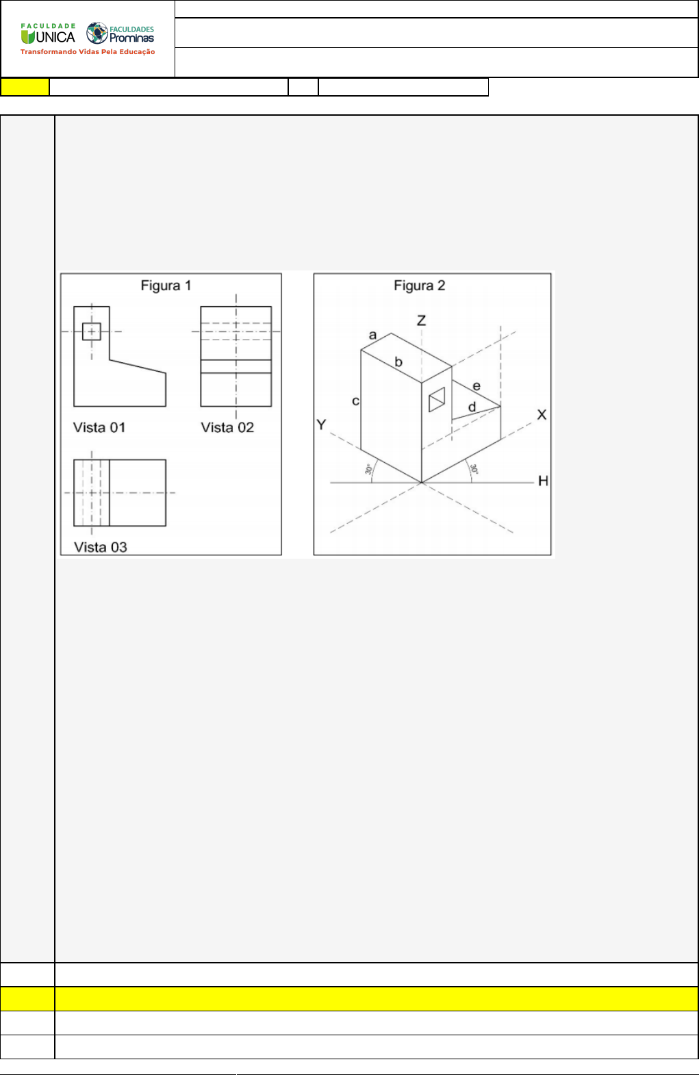 <p>29/05/2023 19:46:01 1/4</p><p>REVISÃO DE SIMULADO</p><p>Nome:</p><p>ANDREIA ELISÂNGELA FERREIRA DOS SANTOS</p><p>Disciplina:</p><p>Desenho Projetivo</p><p>Respostas corretas são marcadas em amarelo X Respostas marcardas por você.</p><p>Questão</p><p>001 (FUNDEP - 2019). No desenho de perspectivas isométricas, são utilizados como base 3</p><p>eixos, indicados na figura 2 a seguir pelas letras X, Y e Z, sendo que os eixos X e Y</p><p>formam com a linha H ângulos de 30º e são utilizados para representar o comprimento</p><p>e a largura dos objetos, além do o eixo Z, que forma com essa mesma linha H um</p><p>ângulo de 90º e é, por sua vez, utilizado para a representação das alturas dos objetos.</p><p>Dessa forma, é possível, então, a partir de elementos e medidas obtidas a partir de</p><p>vistas de um desenho bidimensional (figura 1), representar objetos e / ou ambientes de</p><p>forma a dar uma aparência tridimensional.</p><p>Considerando as características das representações em vista e o desenho isométrico,</p><p>apresentados por essas figuras, assinale com V as afirmativas verdadeiras e com F as</p><p>falsas.</p><p>( ) Apesar de ser indicado um coeficiente de redução para a representação de</p><p>perspectivas isométricas, na prática as arestas dos desenhos isométricos de objetos</p><p>que são paralelas aos eixos X, Y e Z (indicadas na figura 2 pelas letras a, b e c) são</p><p>representadas em verdadeira grandeza (ainda que em escala) para facilitar a execução</p><p>do desenho.</p><p>( ) Segundo MICELI e FERREIRA (2008), “para o traçado de arestas não isométricas</p><p>deve-se considerar o sólido envolvente como elemento auxiliar, marcando-se os pontos</p><p>extremos das linhas não isométricas e unindo-os posteriormente”. Na figura 2, pode-se</p><p>verificar uma aresta desse tipo representada pela letra e.</p><p>( ) Considerando a “Vista 01”, indicada na figura 2 como sendo a vista frontal da peça</p><p>representada em perspectiva isométrica na figura 1, as vistas 2 e 3 representam,</p><p>respectivamente, a vista lateral esquerda e a vista inferior.</p><p>( ) As linhas “traço ponto” presentes nas vistas 2 e 3 (figura 2) indicam tanto o centro</p><p>do furo quadrado presente no objeto representado quanto o eixo de simetria do mesmo</p><p>desenho. As linhas tracejadas, por sua vez, presentes também nessas vistas,</p><p>representam as arestas não visíveis do mesmo furo e possibilitam concluir que ele</p><p>atravessa a peça de face a face.</p><p>Assinale sequência correta.</p><p>A) F, V, F, V.</p><p>B) V, F, F, V.</p><p>C) V, F, V, F.</p><p>X D) V, V, F, F.</p><p>29/05/2023 19:46:01 2/4</p><p>E) F, V, V, F.</p><p>Questão</p><p>002 (FEPESE - 2020). A projeção de um objeto em um único plano não é suficiente para a</p><p>determinação da forma e da posição deste objeto no espaço. Assinale a alternativa que</p><p>corresponde à perspectiva onde os eixos x, y e z têm a mesma inclinação de 120° em</p><p>relação ao plano vertical.</p><p>A) Perspectiva cônica.</p><p>B) Perspectiva cilíndrica.</p><p>C) Perspectiva cavaleira.</p><p>X D) Perspectiva isométrica.</p><p>E) Perspectiva trimétrica.</p><p>Questão</p><p>003 (2017 – UnB) Em relação aos conceitos de perspectiva cônica e de perspectiva</p><p>isométrica, assinale a opção correta.</p><p>A) Na perspectiva cônica, utiliza-se apenas um ponto de fuga.</p><p>B) Na perspectiva cônica, a linha de terra é determinada pelo ponto de vista do</p><p>observador.</p><p>X C) Perspectiva isométrica é uma representação tridimensional em que o objeto se situa em</p><p>um sistema de três eixos coordenados.</p><p>D) Os ângulos de 45º e 90º são os mais utilizados na perspectiva cônica.</p><p>E) O círculo isométrico é representado em verdadeira grandeza.</p><p>Questão</p><p>004 Os jogos e animações utilizam-se de perspectivas para que os seus elementos fiquem</p><p>mais realísticos e interessantes aos usuários. Na imagem, é possível visualizar quatro</p><p>perspectivas, cada uma de um ambiente diferente de uma casa, como se fosse um</p><p>jogo.</p><p>Todos os ambientes apresentam o mesmo tipo de perspectiva.</p><p>Você consegue dizer qual é a perspectiva presente nesses desenhos?</p><p>A) Perspectiva cônica de 2 pontos de fuga.</p><p>X B) Perspectiva isométrica.</p><p>C) Perspectiva militar.</p><p>D) Perspectiva cavaleira.</p><p>29/05/2023 19:46:01 3/4</p><p>E) Perspectiva cônica de 1 ponto de fuga.</p><p>Questão</p><p>005 (UECE-CEV - 2018). Cada tipo de perspectiva existente mostra o objeto de um jeito</p><p>diferente. Observe os tipos de perspectivas apresentados a seguir e assinale a opção</p><p>que apresenta a correta relação entre a figura e o tipo de perspectiva.</p><p>A) 1. cônica; 2. isométrica; 3. Cavaleira.</p><p>B) 1. isométrica; 2. cavaleira; 3. Cônica.</p><p>C) 1. cavaleira; 2. cônica; 3. Isométrica.</p><p>D) 1. isométrica; 2. cônica; 3. Cavaleira.</p><p>X E) 1. cônica; 2. cavaleira; 3. Isométrica.</p><p>Questão</p><p>006 (UECE-CEV - 2016). Perspectiva é a representação gráfica dos objetos tridimensionais.</p><p>Através dela pode-se visualizar o comprimento, a largura e a altura dos objetos</p><p>representados em um único plano. Atente ao que se diz a seguir, em relação aos tipos</p><p>de perspectiva no desenho técnico.</p><p>I. Perspectiva cavaleira é uma projeção que pressupõe o observador no infinito e utiliza</p><p>os raios paralelos e oblíquos ao plano de quadro. Na perspectiva cavaleira, a face da</p><p>frente conserva sua forma e grandeza. Considerando um eixo tridimensional Y</p><p>(vertical), X (horizontal) e Z (oblíquo), a face de fuga é o eixo Z, onde a face do desenho</p><p>aparecerá reduzida.</p><p>II. Perspectiva isométrica é uma perspectiva axonométrica ortogonal onde a projeção</p><p>ortogonal é feita sobre um plano perpendicular à diagonal de um cubo; neste tipo de</p><p>perspectiva, 