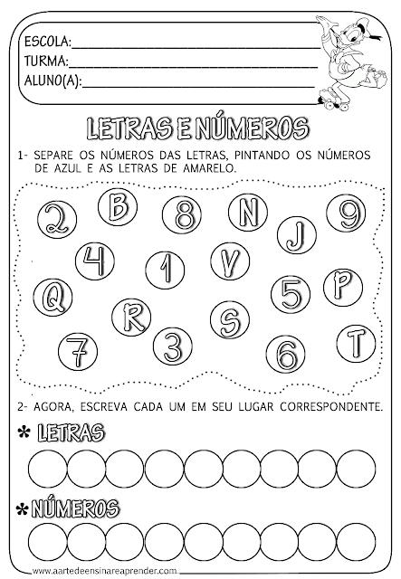 <p>ESCOLA: TURMA: ALUNO(A): LETRASENÚMEROS 1- SEPARE os NÚMEROS DAS LETRAS, PINTANDO os NÚMEROS DE AZUL E AS LETRAS DE B N 4 1 Q 5 3 T 2- ESCREVA CADA UM EM SEU LUGAR CORRESPONDENTE. LETRAS 000000000 * NÚMEROS 000000000</p>