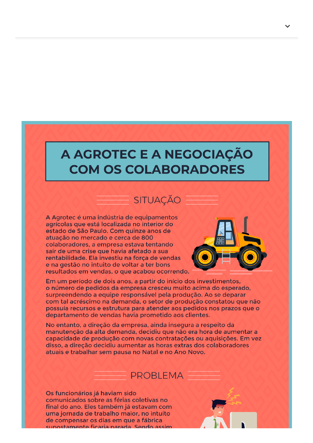 <p>20/08/2022 10:50 Técnicas e táticas de negociação :: Plataforma A</p><p>https://unibf.grupoa.education/sagah/object/default/30301314 1/2</p><p>Na prá�ca</p><p>As negociações, até mesmo para um gestor comercial, não ocorrem somente para compra e venda de produtos</p><p>ou de serviços. É necessário, algumas vezes, negociar para honrar um compromisso ou buscar soluções que</p><p>mantenham as relações dentro da empresa. A negociação permeia todos os setores de uma organização.</p><p>Confira, neste Na Prá�ca, o caso da empresa Agrotec, que precisou fazer uma negociação delicada com os seus</p><p>colaboradores para tentar honrar compromissos assumidos com os clientes.</p><p>Anterior Próximo </p><p>LA </p><p>20/08/2022 10:50 Técnicas e táticas de negociação :: Plataforma A</p><p>https://unibf.grupoa.education/sagah/object/default/30301314 2/2</p><p>Anterior Próximo </p><p>LA </p>