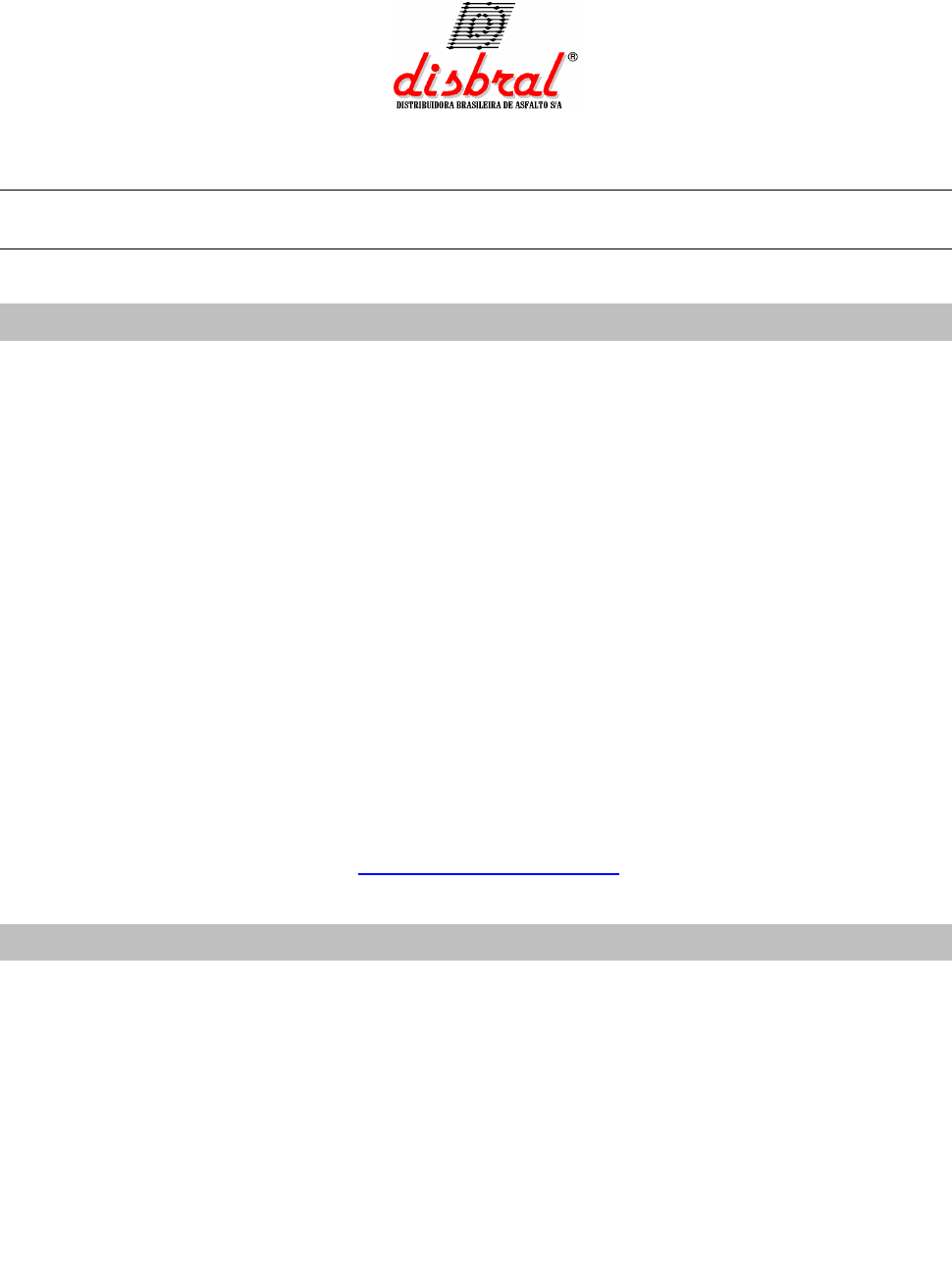 <p>Ficha de Informações Segurança Produtos Químicos - FISPQ</p><p>PRODUTO: EMULSAO ASFALTICA PARA PAVIMENTAÇAO Página 1/15</p><p>FISPQ nº: 001 Revisão: Data da última revisão: 01/16/2013</p><p>1. Identificação do produto e da empresa</p><p>Nome do produto: EMULSAO ASFALTICA PARA PAVIMENTAÇAO</p><p>Sinônimos Asfalto Emulsionado Modificado ou não por Polímeros</p><p>Elastoméricos</p><p>Código interno de</p><p>identificação do produto:</p><p>RR1C, RR2C, RM1C, RL1C, LA1C, LARC, RR1C-E,</p><p>RR2C-E, RL1C-E e RC1C-E, EAI BIO PRIMER®,</p><p>PROPIL</p><p>Nome da empresa: Distribuidora Brasileira de Asfalto S/A - DISBRAL</p><p>Endereço: Via Primária-08 Quadra-18 Módulos-24/47 – DAIAG –</p><p>CEP 74.980-970 – Aparecida de Goiânia (GO)</p><p>Telefone da empresa: (62) 4014-2500</p><p>Telefone para emergências: (62) 4017-2537 / (62) 4017-2500 / 0800-118270</p><p>Fax: (62) 4017-2510</p><p>E-mail: industria@disbral.com.br</p><p>2. Composição e informações sobre os ingredientes</p><p>[PREPARADO]</p><p>Natureza química: Cimento Asfáltico de Petróleo – CAP, mistura de</p><p>hidrocarbonetos parafínicos, olefínicos, naftênicos e</p><p>poliaromáticos de alto peso molecular em dispersão</p><p>aquosa com emulsificantes; que pode conter polímeros</p><p>elastoméricos.</p><p>Preparado: Este produto é um preparado.</p><p>Ficha de Informações Segurança Produtos Químicos - FISPQ</p><p>PRODUTO: EMULSAO ASFALTICA PARA PAVIMENTAÇAO Página 2/15</p><p>FISPQ nº: 001 Revisão: Data da última revisão: 01/16/2013</p><p>Ingredientes ou impurezas que contribuam para o perigo:</p><p>Ingrediente Número CAS Concentração(%)</p><p>Cimento Asfáltico de Petróleo</p><p>– CAP</p><p>8052-42-4 45,00 mín.</p><p>Emulsificante Catiônico</p><p>(Aminas de Ácido Graxo)</p><p>61791-55-7 0,15 – 2,50</p><p>Ácido Clorídrico ou Ácido</p><p>Muriático</p><p>7647-01-0 0,15 – 2,50</p><p>Nafta Média de Petróleo 64742-88-7 15,00 máx.</p><p>Emulsificante Não Iônico</p><p>Nonilfenol Etoxilado</p><p>9016-45-9 (genérico) 0,70 – 1,20</p><p>Água 7732-18-5 30,00 - 50,00</p><p>Polímero Elastomérico (SBS) 91261-65-3 0,00-4,00</p><p>Polímero Elastomérico (SBR) 9003-55-8 0,00 - 4,00</p><p>3. Identificação de perigos</p><p>Perigos mais importantes: Produto irritante</p><p>Líquido não inflamável</p><p>Efeitos do produto: Saúde:</p><p>-Contato com os olhos: Irritação</p><p>-Inalação: Vapores do produto aquecido podem</p><p>causar irritação no aparelho respiratório.</p><p>Ficha de Informações Segurança Produtos Químicos - FISPQ</p><p>PRODUTO: EMULSAO ASFALTICA PARA PAVIMENTAÇAO Página 3/15</p><p>FISPQ nº: 001 Revisão: Data da última revisão: 01/16/2013</p><p>-Ingestão: irritação na mucosa do aparelho</p><p>digestivo.</p><p>Meio ambiente:</p><p>-Ar: Produto pouco volátil.</p><p>-Água: O produto é prejudicial à vida aquática.</p><p>-Solo: Pode afetar a vegetação da área em</p><p>contato direto. Não apresenta percolação e o</p><p>resíduo seco do produto apresenta</p><p>características inertes.</p><p>Perigos físicos e químicos: Produto não é combustível sob condições normais de</p><p>utilização. Sob altas temperaturas os gases gerados</p><p>podem ser inflamáveis.</p><p>Perigos específicos: Produto pouco nocivo.</p><p>4. Medidas de primeiros-socorros</p><p>Recomendação Geral: Tomar as precauções adequadas para garantir a sua</p><p>segurança antes de tentar resgatar ou prestar</p><p>primeiros-socorros a terceiros.</p><p>Inalação: Remover a vítima da área poluída e mantê-la deitada,</p><p>quieta e aquecida com as vias respiratórias livres.</p><p>Remover qualquer objeto que possa obstruí-las, como</p><p>por exemplo, uma prótese dentária. Administrar</p><p>oxigênio úmido a 100%. Se a vítima não estiver</p><p>respirando, ministrar respiração artificial. Providenciar</p><p>atendimento médico de emergência.</p><p>Ficha de Informações Segurança Produtos Químicos - FISPQ</p><p>PRODUTO: EMULSAO ASFALTICA PARA PAVIMENTAÇAO Página 4/15</p><p>FISPQ nº: 001 Revisão: Data da última revisão: 01/16/2013</p><p>Contato com a pele: Remover as roupas contaminadas. Lavar</p><p>abundantemente os locais atingidos com água corrente</p><p>e sabão neutro. Se a vítima tiver sido atingida por</p><p>produto quente, resfriar a pele e o material asfáltico</p><p>imediatamente com água fria. Não remover qualquer</p><p>resíduo de asfalto aderido à pele. Providenciar</p><p>atendimento médico de emergência. Vaselina e</p><p>lanolina facilitam a remoção no ambiente hospitalar.</p><p>Contato com os olhos: A vítima não deve friccionar os olhos. Remover lentes</p><p>de contato. Lavar com água corrente no mínimo por 15</p><p>minutos, mantendo as pálpebras abertas e solicitando</p><p>à vítima que movimente o globo ocular para facilitar a</p><p>remoção de corpos estranhos. Providenciar</p><p>atendimento médico de emergência. Em queimaduras</p><p>químicas oculares é recomendável a utilização de</p><p>substância anfotérica capaz de neutralizar tanto ácidos</p><p>como bases sem produzir reações exotérmicas por 5</p><p>minutos antes de irrigar com água ou solução</p><p>fisiológica. Além disso, por tratar-se de uma solução</p><p>hipertônica, carreia água e o agente agressor do</p><p>interior da córnea para o exterior, dificultando a</p><p>penetração ocular.(Diphoterine®).</p><p>Ingestão: Não provoque o vômito. Se o acidentado estiver</p><p>consciente, lave a sua boca abundantemente com</p><p>água limpa. Não oferecer líquidos ou alimentos para a</p><p>vítima. Providenciar atendimento médico de</p><p>emergência.</p><p>Informações ao médico: O óleo mineral é contra indicado, pois aumenta a</p><p>absorção de hidrocarbonetos.</p><p>Ficha de Informações Segurança Produtos Químicos - FISPQ</p><p>PRODUTO: EMULSAO ASFALTICA PARA PAVIMENTAÇAO Página 5/15</p><p>FISPQ nº: 001 Revisão: Data da 