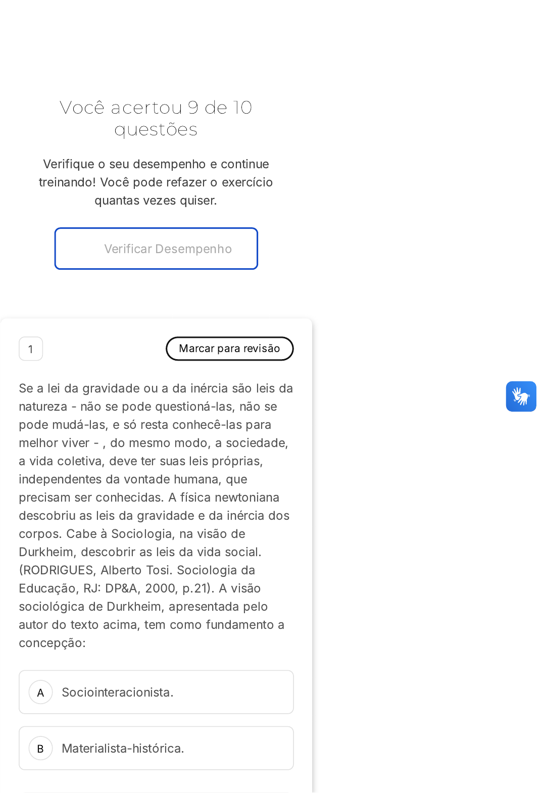 <p>04/09/2024 15:41 https://estacio.saladeavaliacoes.com.br/exercicio/66d8a7c2d6fc23ed6685653b/gabarito/</p><p>https://estacio.saladeavaliacoes.com.br/exercicio/66d8a7c2d6fc23ed6685653b/gabarito/ 1/15</p><p>Você acertou 9 de 10</p><p>questões</p><p>Verifique o seu desempenho e continue</p><p>treinando! Você pode refazer o exercício</p><p>quantas vezes quiser.</p><p>Verificar Desempenho</p><p>A</p><p>B</p><p>1 Marcar para revisão</p><p>Se a lei da gravidade ou a da inércia são leis da</p><p>natureza - não se pode questioná-las, não se</p><p>pode mudá-las, e só resta conhecê-las para</p><p>melhor viver - , do mesmo modo, a sociedade,</p><p>a vida coletiva, deve ter suas leis próprias,</p><p>independentes da vontade humana, que</p><p>precisam ser conhecidas. A física newtoniana</p><p>descobriu as leis da gravidade e da inércia dos</p><p>corpos. Cabe à Sociologia, na visão de</p><p>Durkheim, descobrir as leis da vida social.</p><p>�RODRIGUES, Alberto Tosi. Sociologia da</p><p>Educação, RJ� DP&A, 2000, p.21�. A visão</p><p>sociológica de Durkheim, apresentada pelo</p><p>autor do texto acima, tem como fundamento a</p><p>concepção:</p><p>Sociointeracionista.</p><p>Materialista-histórica.</p><p>04/09/2024 15:41 https://estacio.saladeavaliacoes.com.br/exercicio/66d8a7c2d6fc23ed6685653b/gabarito/</p><p>https://estacio.saladeavaliacoes.com.br/exercicio/66d8a7c2d6fc23ed6685653b/gabarito/ 2/15</p><p>C</p><p>D</p><p>E</p><p>Positivista.</p><p>Construtivista.</p><p>Estruturalista.</p><p>Resposta correta</p><p>Parabéns, você selecionou a</p><p>alternativa correta. Confira o</p><p>gabarito comentado!</p><p>Gabarito Comentado</p><p>Durkheim é considerado um dos principais</p><p>teóricos do estruturalismo. O</p><p>estruturalismo é uma corrente filosófica</p><p>que defende que a realidade é constituída</p><p>por estruturas que não podem ser</p><p>percebidas diretamente, mas que são</p><p>responsáveis por organizar o mundo.</p><p>Durkheim acreditava que a sociedade é</p><p>uma estrutura que determina o</p><p>comportamento dos indivíduos.</p><p>2 Marcar para revisão</p><p>Considere as sentenças abaixo:</p><p>I � Para Durkheim, a Sociologia é o estudo dos</p><p>fatos sociais.</p><p>II � A Sociologia é chamada de geral quando</p><p>consideramos a sociedade em seu sentido mais</p><p>amplo e é especial quando se ocupa de</p><p>determinado grupo de fatos sociais de mesma</p><p>natureza.</p><p>04/09/2024 15:41 https://estacio.saladeavaliacoes.com.br/exercicio/66d8a7c2d6fc23ed6685653b/gabarito/</p><p>https://estacio.saladeavaliacoes.com.br/exercicio/66d8a7c2d6fc23ed6685653b/gabarito/ 3/15</p><p>A</p><p>B</p><p>C</p><p>D</p><p>E</p><p>III � A Sociologia da Educação tornou-se uma</p><p>disciplina autônoma, desvinculada da</p><p>Sociologia Geral, pela importância que a</p><p>Educação assumiu no mundo contemporâneo.</p><p>Estão corretas:</p><p>Somente a sentença I.</p><p>Somente a sentença II.</p><p>Somente a sentença III.</p><p>Somente as sentenças II e III.</p><p>Somente as sentenças I e II.</p><p>Resposta correta</p><p>Parabéns, você selecionou a</p><p>alternativa correta. Confira o</p><p>gabarito comentado!</p><p>Gabarito Comentado</p><p>A resposta correta é: Somente as</p><p>sentenças I e II.</p><p>3 Marcar para revisão</p><p>Atualmente os professores enfrentam crises ao</p><p>confrontar a diversidade cultural, os discursos</p><p>dissonantes e o preconceito racial, político e</p><p>religioso no ambiente escolar. Alguns</p><p>professores acreditam que a escola não é o</p><p>04/09/2024 15:41 https://estacio.saladeavaliacoes.com.br/exercicio/66d8a7c2d6fc23ed6685653b/gabarito/</p><p>https://estacio.saladeavaliacoes.com.br/exercicio/66d8a7c2d6fc23ed6685653b/gabarito/ 4/15</p><p>A</p><p>B</p><p>C</p><p>D</p><p>E</p><p>lugar adequado para debater essas questões e</p><p>defendem a igualdade absoluta entre os alunos.</p><p>É importante que os professores estejam</p><p>preparados para lidar com a diversidade</p><p>cultural e os discursos dissonantes no ambiente</p><p>escolar?</p><p>Não, porque a escola é um ambiente</p><p>homogêneo e deve tratar todos da</p><p>mesma forma.</p><p>Sim, porque a diversidade cultural e</p><p>os discursos dissonantes enriquecem</p><p>o ambiente educacional e promovem</p><p>a reflexão crítica.</p><p>Não, porque os alunos não devem</p><p>expressar suas identidades no</p><p>contexto escolar.</p><p>Não, porque a diversidade cultural e</p><p>os discursos dissonantes são</p><p>irrelevantes para o processo</p><p>educacional.</p><p>Sim, porque a escola deve promover</p><p>tratamento diferenciado para alguns</p><p>grupos em detrimento de outros.</p><p>Resposta correta</p><p>Parabéns, você selecionou a</p><p>alternativa correta. Confira o</p><p>gabarito comentado!</p><p>Gabarito Comentado</p><p>É importante que os professores estejam</p><p>preparados para lidar com a diversidade</p><p>Exercicio</p><p>Fundamentos</p><p>Socioantropológicos Da Sair</p><p>04/09/2024 15:41 https://estacio.saladeavaliacoes.com.br/exercicio/66d8a7c2d6fc23ed6685653b/gabarito/</p><p>https://estacio.saladeavaliacoes.com.br/exercicio/66d8a7c2d6fc23ed6685653b/gabarito/ 5/15</p><p>A</p><p>B</p><p>C</p><p>D</p><p>E</p><p>cultural e os discursos dissonantes no</p><p>ambiente escolar, pois esses elementos</p><p>enriquecem o ambiente educacional,</p><p>promovendo a reflexão crítica e</p><p>contribuindo para o desenvolvimento</p><p>integral dos alunos.</p><p>4 Marcar para revisão</p><p>A consolidação do domínio europeu nas</p><p>Américas é um estudo de contrastes e</p><p>percepções. A literatura etnográfica da época</p><p>revela visões polarizadas dos povos nativos,</p><p>que oscilam entre a idealização e a</p><p>demonização, influenciando as políticas</p><p>coloniais.</p><p>Como a literatura etnográfica primitiva</p><p>contribuiu para o imaginário europeu do</p><p>período colonial?</p><p>Incentivando a exploração comercial</p><