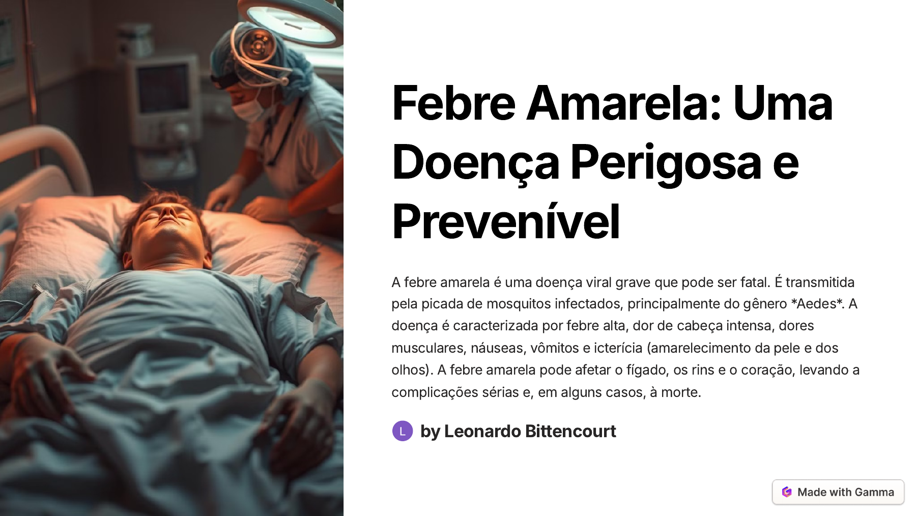 <p>Febre Amarela: Uma</p><p>Doença Perigosa e</p><p>Prevenível</p><p>A febre amarela é uma doença viral grave que pode ser fatal. É transmitida</p><p>pela picada de mosquitos infectados, principalmente do gênero *Aedes*. A</p><p>doença é caracterizada por febre alta, dor de cabeça intensa, dores</p><p>musculares, náuseas, vômitos e icterícia (amarelecimento da pele e dos</p><p>olhos). A febre amarela pode afetar o fígado, os rins e o coração, levando a</p><p>complicações sérias e, em alguns casos, à morte.</p><p>by Leonardo Bittencourt</p><p>https://gamma.app/?utm_source=made-with-gamma</p><p>Mobile User</p><p>Fatores Individuais</p><p>1 Idade</p><p>Crianças e idosos são mais</p><p>suscetíveis a complicações</p><p>da febre amarela. O sistema</p><p>imunológico de crianças em</p><p>desenvolvimento e de</p><p>pessoas mais velhas pode</p><p>ser menos eficaz na resposta</p><p>ao vírus.</p><p>2 Condições Pré-</p><p>Existentes</p><p>Pessoas com condições</p><p>médicas pré-existentes,</p><p>como diabetes, doenças</p><p>cardíacas e HIV, podem ter</p><p>maior risco de desenvolver</p><p>complicações graves da</p><p>febre amarela.</p><p>3 Histórico de Vacinação</p><p>A vacinação contra a febre</p><p>amarela é a forma mais eficaz</p><p>de prevenir a doença.</p><p>Pessoas que não foram</p><p>vacinadas estão em risco</p><p>aumentado de contrair a</p><p>doença.</p><p>4 Gravidez</p><p>A vacinação contra a febre</p><p>amarela não é recomendada</p><p>durante a gravidez. No</p><p>entanto, mulheres que</p><p>precisam viajar para áreas de</p><p>risco devem consultar um</p><p>médico para discutir os</p><p>riscos e benefícios da</p><p>vacinação.</p><p>https://gamma.app/?utm_source=made-with-gamma</p><p>Mobile User</p><p>Fatores Ambientais</p><p>Presença de Mosquitos Vetores</p><p>A presença de mosquitos *Aedes aegypti* e *Aedes</p><p>albopictus* é fundamental para a transmissão da febre</p><p>amarela. Esses mosquitos são encontrados em áreas tropicais</p><p>e subtropicais com climas quentes e úmidos. A urbanização e</p><p>o desmatamento podem aumentar a proliferação desses</p><p>mosquitos.</p><p>Condições Climáticas</p><p>As condições climáticas influenciam a reprodução e o ciclo de</p><p>vida dos mosquitos. Temperaturas quentes e umidade</p><p>favorecem a proliferação dos mosquitos, aumentando o risco</p><p>de transmissão da febre amarela. As chuvas também podem</p><p>criar criadouros para os mosquitos.</p><p>https://gamma.app/?utm_source=made-with-gamma</p><p>Mobile User</p><p>Fatores Sociais e Econômicos</p><p>Fator Impacto</p><p>Pobreza e Desigualdade Social A pobreza e a desigualdade social podem levar a condições</p><p>de moradia precárias, falta de acesso à água potável e</p><p>saneamento básico, e a dificuldades em obter assistência</p><p>médica, aumentando o risco de transmissão da febre</p><p>amarela.</p><p>Urbanização e Crescimento Demográfico A urbanização rápida e o crescimento populacional podem</p><p>contribuir para a proliferação dos mosquitos, especialmente</p><p>em áreas com infraestrutura inadequada e saneamento</p><p>precário.</p><p>Migrações As migrações para áreas endêmicas podem levar à</p><p>introdução da doença em regiões anteriormente livres de</p><p>febre amarela. A movimentação de pessoas pode facilitar a</p><p>dispersão do vírus e do mosquito vetor.</p><p>Falta de Acesso à Informação e Educação A falta de acesso à informação sobre a febre amarela e suas</p><p>medidas de prevenção pode contribuir para a disseminação</p><p>da doença. A conscientização da população é fundamental</p><p>para reduzir o risco de transmissão.</p><p>https://gamma.app/?utm_source=made-with-gamma</p><p>Mobile User</p><p>Descrição da Doença,</p><p>Sintomas, Transmissão e</p><p>Impacto</p><p>1</p><p>Fase Inicial</p><p>A febre amarela se manifesta inicialmente com sintomas</p><p>como febre alta, dor de cabeça intensa, dores musculares,</p><p>náuseas, vômitos e fraqueza. A maioria dos casos se</p><p>recupera após esta fase, mas alguns podem evoluir para uma</p><p>fase mais grave.</p><p>2</p><p>Fase Tóxica</p><p>Na fase tóxica da febre amarela, ocorre a icterícia</p><p>(amarelecimento da pele e dos olhos), que é causada pelo</p><p>acúmulo de bilirrubina no sangue devido ao dano hepático. A</p><p>doença também pode afetar o fígado, os rins, o coração, o</p><p>sistema nervoso central e outros órgãos, levando a</p><p>complicações sérias.</p><p>3</p><p>Transmissão</p><p>A febre amarela é transmitida pela picada de mosquitos</p><p>infectados, principalmente do gênero *Aedes*. O *Aedes</p><p>aegypti* é o principal vetor em áreas urbanas, enquanto o</p><p>*Aedes albopictus* é mais comum em áreas rurais e florestas.</p><p>O mosquito se infecta ao picar um animal infectado, como</p><p>macacos, e transmite o vírus para outros humanos.</p><p>https://gamma.app/?utm_source=made-with-gamma</p><p>Mobile User</p><p>Incidência de Febre Amarela no Brasil</p><p>11990-2000</p><p>O Brasil experimentou uma redução significativa na</p><p>incidência de febre amarela durante a década de</p><p>1990, devido à intensificação das campanhas de</p><p>vacinação e de controle do mosquito vetor.</p><p>2 2000-2010</p><p>A incidência da doença permaneceu baixa, com</p><p>surtos esporádicos em áreas específicas. No</p><p>entanto, a urbanização crescente e a desinformação</p><p>sobre a vacinação levaram a um aumento gradual do</p><p>risco de transmissão.</p><p>32010-Atualidade</p><p>Desde 2016, o Brasil tem enfrentado uma série de</p><p>surtos de febre amarela, principalmente nas regiões</p><p>Norte e Centro-Oeste, afetando áreas urbanas e</p><p>rurais. O aumento da incidência é atribuído à</p><p>negligência das campanhas de vacinação, à</p><p>desinformação sobre a doença e ao aumento da</p><p>proliferação do mosquito vetor.</p><p>https://gamma.app/?u