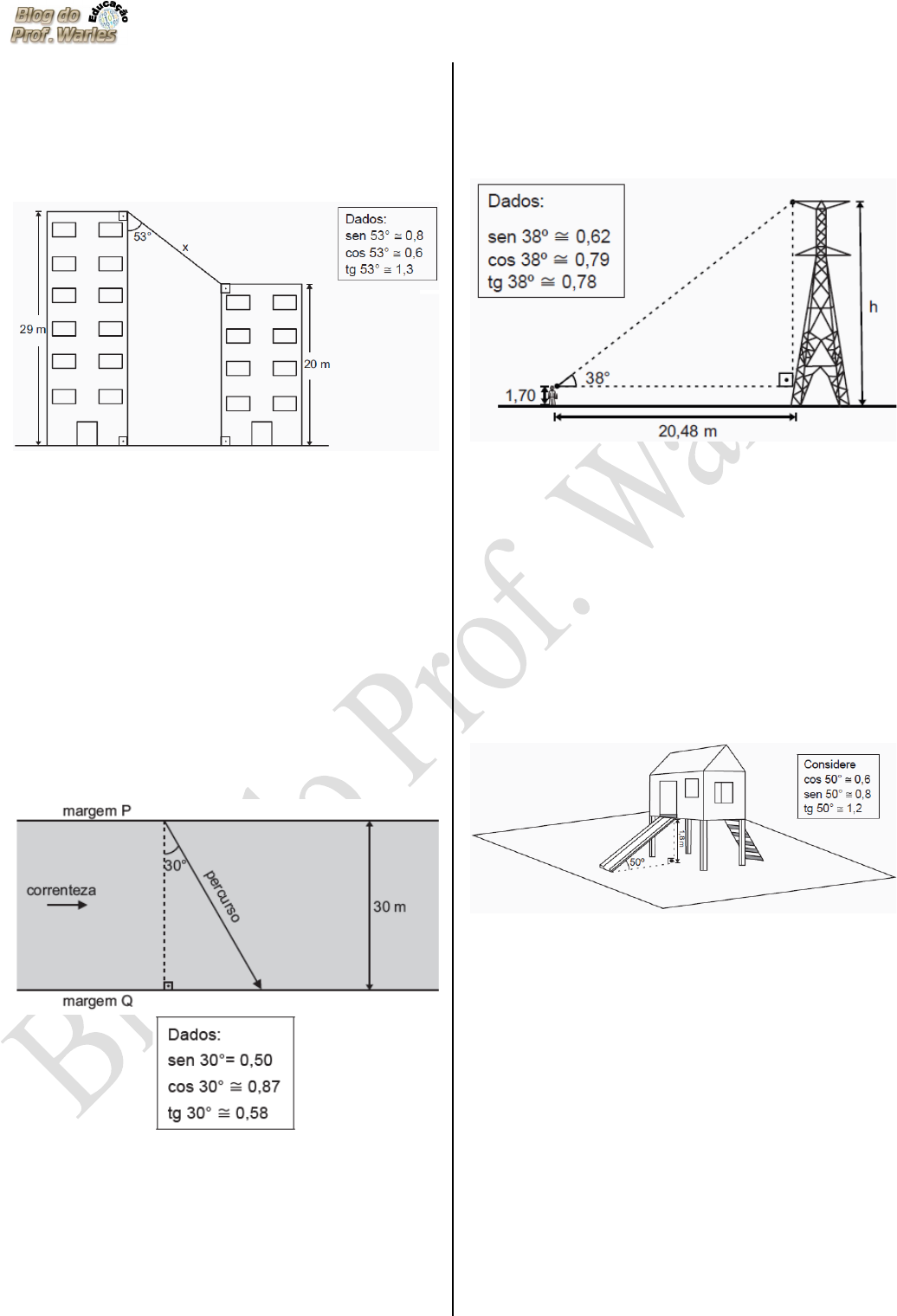 <p>D5 – Resolver problema que envolva razões trigonométricas no triângulo</p><p>retângulo (seno, cosseno, tangente).</p><p>-------------------------------------------------------------------</p><p>(PAEBES). Um telhado será instalado entre dois prédios de um condomínio, de forma que sua inclinação em relação ao prédio maior será de 53°, conforme representado no desenho abaixo.</p><p>Qual será o comprimento x desse telhado?</p><p>A) 5,4</p><p>B) 6,9</p><p>C) 9,0</p><p>D) 11,2</p><p>E) 15,0</p><p>-------------------------------------------------------------------</p><p>(SAEPE). Um barco realizou a travessia em um rio partindo da margem P com trajetória retilínea em direção à margem oposta Q. Devido à correnteza desse rio, o percurso do barco foi deslocado 30° em relação à trajetória retilínea predeterminada, conforme representado no desenho abaixo.</p><p>O percurso aproximado, em metros, realizado pelo barco para atravessar esse rio é de</p><p>A) 26,10.</p><p>B) 30,00.</p><p>C) 34,48.</p><p>D) 51,72.</p><p>E) 60,00.</p><p>-------------------------------------------------------------------</p><p>(SAEGO). Observe abaixo o esquema que um observador montou para estimar a altura de uma torre de energia.</p><p>Qual é a altura h aproximada dessa torre de energia?</p><p>A) 15,97</p><p>B) 17,67</p><p>C) 26,25</p><p>D) 27,62</p><p>E) 34,73</p><p>-------------------------------------------------------------------</p><p>(PAEBES). O desenho abaixo representa o projeto de um escorregador que será instalado em uma praça. Nesse projeto, estão indicados a medida da altura do escorregador e o ângulo de inclinação em relação ao solo.</p><p>O comprimento do escorregador é</p><p>A) 1,44 m.</p><p>B) 1,5 m.</p><p>C) 2,16 m.</p><p>D) 2,25 m.</p><p>E) 3,0 m.</p><p>-------------------------------------------------------------------</p><p>(SAEPB). O corpo de bombeiros de uma cidade possui um caminhão multifuncional e autossuficiente que possui uma escada de plataforma giratória para alcançar edifícios com alturas elevadas. Em um treinamento de novos integrantes dessa corporação, um caminhão desse tipo foi posicionado conforme representado na figura abaixo.</p><p>Nesse treinamento, qual a foi a altura h, aproximada, atingida por essa escada?</p><p>A) 8,0 m</p><p>B) 8,6 m</p><p>C) 11,5 m</p><p>D) 13,5 m</p><p>E) 14,5 m</p><p>-------------------------------------------------------------------</p><p>(SAEGO). Com um binóculo, um observador avista um pássaro no topo de uma árvore sob um ângulo de 60°, conforme representado na figura abaixo.</p><p>Qual é a altura aproximada desse pássaro em relação ao solo, em metros?</p><p>A) 13,81</p><p>B) 12,11</p><p>C) 10,41</p><p>D) 7,79</p><p>E) 6,09</p><p>-------------------------------------------------------------------</p><p>(SEAPE). Um pacote é lançado de um helicóptero em voo. Devido à ação do vento, esse pacote cai a uma distância horizontal x do helicóptero. No instante em que esse pacote atinge o solo, o helicóptero dista 200 metros do chão, conforme ilustra o desenho abaixo.</p><p>Quantos metros esse pacote foi deslocado horizontalmente em relação ao helicóptero devido a ação do vento?</p><p>A) m</p><p>B) 200 m</p><p>C) m</p><p>D) m</p><p>E) 100 m</p><p>-------------------------------------------------------------------</p><p>Para se deslocar de sua casa até a sua escola, Pedro percorre o trajeto representado na figura abaixo.</p><p>Sabendo que , a distância total, em km, que Pedro percorre no seu trajeto de casa para a escola é de:</p><p>(A)</p><p>(B)</p><p>(C)</p><p>(D)</p><p>(E)</p><p>-------------------------------------------------------------------</p><p>Para consertar um telhado, o pedreiro Pedro colocou uma escada de 8 metros de comprimento numa parede, formando com ela um ângulo de 60º.</p><p>Sabendo que: (, ). A altura da parede que o pedreiro apoiou a escada é:</p><p>(A) 5 m.</p><p>(B) m</p><p>(C) 8 m.</p><p>(D) m</p><p>(E) 4 m</p><p>-------------------------------------------------------------------</p><p>Para permitir o acesso a um monumento que está em um pedestal de 1,5 m de altura, será construída uma rampa com inclinação de 30º com o solo, conforme a ilustração abaixo:</p><p>Sabendo que: (, ). O comprimento da rampa de acesso ao monumento é:</p><p>(A) m</p><p>(B) 3 m.</p><p>(C) m</p><p>(D) m.</p><p>(E) 4 m</p><p>-------------------------------------------------------------------</p><p>Do topo de um farol situado a 40 m acima do nível do mar, o ângulo de depressão de um barco (figura abaixo) é de 15º.</p><p>Sabendo que , a distância do barco ao farol é de:</p><p>(A) m</p><p>(B) m</p><p>(C) m</p><p>(D) m</p><p>(E) m</p><p>-------------------------------------------------------------------</p><p>Um caminhão sobe uma rampa inclinada 15º em relação ao plano horizontal. Sabendo-se que a distância HORIZONTAL que separa o início da rampa até o ponto vertical mede 24 m, a que altura, em metros, aproximadamente, estará o caminhão depois de percorrer toda a rampa?</p><p>(A) 6.</p><p>(B) 23.</p><p>(C) 25</p><p>(D) 92</p><p>(E) 100</p><p>-------------------------------------------------------------------</p><p>Uma escada deve ser construída para unir dois pisos de um prédio. A altura do piso mais elevado em relação ao piso inferior é de 8 m. Para isso, é necessário construir uma rampa plana unindo os dois pisos. Se o ângulo da rampa com o piso inferior for 30º, o comprimento da rampa, em metros, é:</p><p>(A) 4</p><p>(B)</p><p>(C) 8</p><p>(D) 16</p><p>(E)</p><p>-------------------------------------------------------------------</p><p>Duas ruas de uma cidade mineira encontram-se em P formando um ângulo de 30º. Na rua Rita, existe um posto de gasolina G que dista 2 400 m de P, conforme mostra a ilustração abaixo.</p><p>Sabendo que , e , a distância d, em metros, do posto G à rua Reila é aproximadamente igual a:</p><p>(A) 1200</p><p>(B) 1392</p><p>(C) 0264</