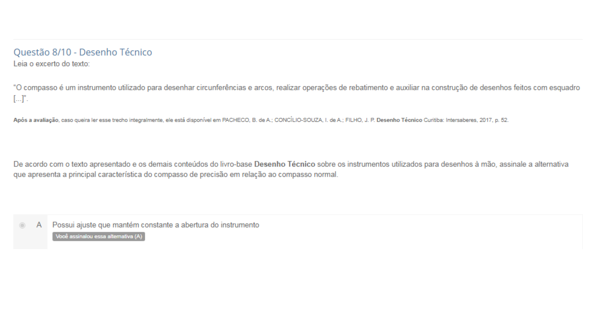 <p>Questão 8/10 - Desenho Técnico Leia o excerto do texto: "O compasso é um instrumento utilizado para desenhar circunferências e arcos, realizar operações de rebatimento e auxiliar na construção de desenhos feitos com esquadro [...]". Após a avaliação, caso queira ler esse trecho integralmente, ele está disponível em PACHECO, B. de A.: I. de A.; FILHO, J. P. Desenho Técnico Curitiba: Intersaberes, 2017, De acordo com texto apresentado e os demais conteúdos do livro-base Desenho Técnico sobre os instrumentos utilizados para desenhos à mão, assinale a alternativa que apresenta a principal característica do compasso de precisão em relação ao compasso normal. A Possui ajuste que mantém constante a abertura do instrumento Você assinalou alternativa (A)</p>