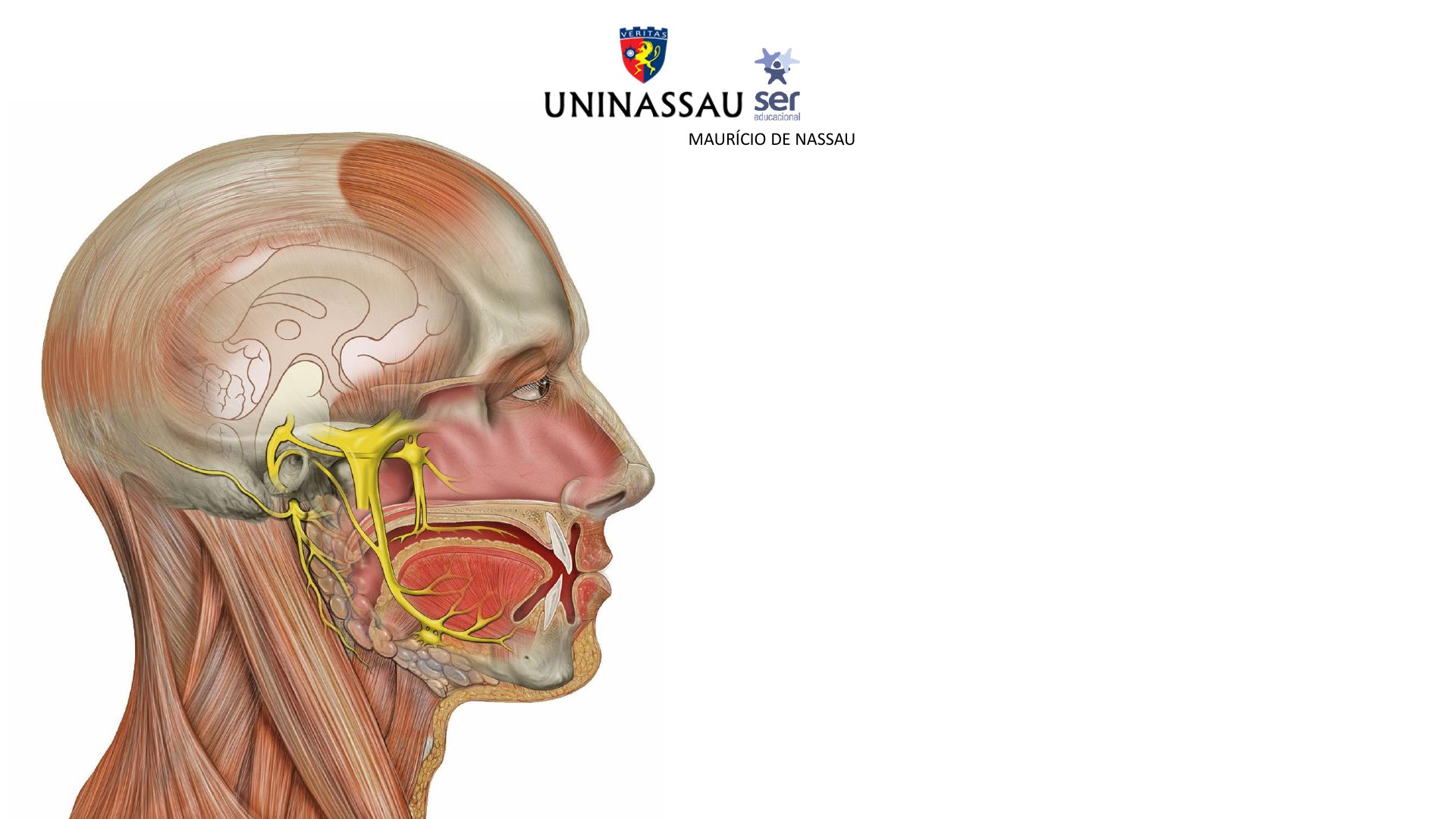 <p>NERVO</p><p>TRIGÊMEO</p><p>CENTRO UNIVERSITÁRIO MAURÍCIO DE NASSAU</p><p>Raissa Pinheiro Moraes</p><p>C I R U R G I Ã -D E NT I S TA (U F C )</p><p>C I R U R G I Ã BU C O -M A X I LO - FAC I A L (U F MA )</p><p>M E S T R A (U FC )</p><p>P R O F E S S OR A</p><p>- Artéria → Vermelho</p><p>- Veia → Azul</p><p>- Nervos → Laranja/amarelo</p><p>- Músculos</p><p>Comunicação entre os</p><p>centros nervosos (encéfalo</p><p>e medula espinhal) e os</p><p>órgãos efetores</p><p>Estruturas formadas por feixes de fibras nervosas, que</p><p>fazem parte do Sistema Nervoso Periférico</p><p>NERVOS</p><p>I- Olfatório</p><p>II- Óptico</p><p>III- Oculomotor</p><p>IV- Troclear</p><p>V- Trigêmeo</p><p>VI- Abducente</p><p>VII- Facial</p><p>VIII- Vestibulococlear</p><p>IX- Glossofaríngeo</p><p>X- Vago</p><p>XI- Acessório</p><p>XII- Hipoglosso</p><p>Nervos cranianos</p><p>Maior dos 12 pares de nervos cranianos</p><p>NERVO SENSITIVO</p><p>NERVO MOTOR</p><p>NERVO MISTO</p><p>- Fibras Aferentes (sensitivas): órgãos sensitivos → SNC</p><p>- Fibras Eferentes (motoras): SNC → Músculos e glândulas</p><p>NERVO TRIGÊMEO NERVO FACIAL</p><p>PARALISIA</p><p>FACIAL</p><p>Causas: Mudança buscar de temperatura, estresse, trauma, AVC, cirurgia*, otite, infecção, tumor</p><p>Nervo alveolar inferior → Canal mandibular</p><p>Nervo lingual → Tecido mole lingual</p><p>CUIDADO COM INCISÃO E</p><p>MANIPULAÇÃO DO TECIDO LINGUAL</p><p>1 – OLFTÁLMICO</p><p>- Sensitivo</p><p>- Fissura orbital superior</p><p>2 – MAXILAR</p><p>- Sensitivo</p><p>- Forame redondo</p><p>3 - MANDIBULAR</p><p>- Misto</p><p>- Forame oval</p><p>V1</p><p>V2</p><p>V3</p><p>* 3 ramos antes de sair do crânio</p><p>NERVO MISTO: INERVAÇÃO SENSITIVA (DOS 3 TERÇOS DA FACE) + INERVAÇÃO</p><p>MOTORA (MÚSCULOS DA MASTIGAÇÃO)</p><p>Nervo oftálmico</p><p>Nervo maxilar</p><p>NASP</p><p>NASM</p><p>NASA</p><p>NASM</p><p>N. INFRA-ORBITÁRIO</p><p>N. ZIGOMATICOFACIAL</p><p>Dente, periodonto, tecido ósseo e tecido mole</p><p>Maxila porosa</p><p>Nervo infra-orbitário</p><p>-- Pálpebra inferior</p><p>-- Asa do nariz</p><p>-- Lábio superior</p><p>-- Gengiva vestibular ântero-superior</p><p>-- ASA e ASM</p><p>3 RAMOS: PALPEBRAL INFERIOR, NASAL EXTERNO E</p><p>LABIAL SUPERIOR</p><p>-- Polpa Incisivos e Canino Superiores</p><p>-- Periodonto</p><p>-- Osso alveolar</p><p>Nervo alveolar superior anterior</p><p>Nervo alveolar superior médio</p><p>-- Polpa Pré-Molares Superiores</p><p>-- Periodonto Pré-Molares</p><p>Superiores</p><p>-- Raiz Mésio-vestibular 1MS</p><p>-- Gengiva Vestibular Pré-Molares</p><p>Superiores</p><p>-- Seio Maxilar</p><p>Ausente em 30-54% dos indivíduos</p><p>Nervo alveolar superior posterior</p><p>-- Polpa Molares Superiores</p><p>-- Periodonto Molares Superiores-</p><p>- Exceção: raíz MV 1MS</p><p>-- Gengiva Vestibular Molares</p><p>Superiores</p><p>-- Seio Maxilar</p><p>(nervo facial)</p><p>Palatino menorPalatino maiorNasopalatino</p><p>NERVO NASOPALATINO</p><p>NERVO PALATINO MAIOR</p><p>NERVO PALATINO MENOR</p><p>INTRACRANIANO FOSSA PTERIGOPALATINA CANAL INFRAORBITÁRIO FACE</p><p>Meníngeo médio</p><p>NASP</p><p>Pterigopalatino:</p><p>- Orbitais</p><p>- Faringeos</p><p>- Palatinos (maior</p><p>e menor)</p><p>- Nasais</p><p>Zigomático:</p><p>- Zigomaticofacial</p><p>- Zigomaticotemporal</p><p>Infraorbitário</p><p>ASA ASM</p><p>Palpebral superior</p><p>Nasal externo</p><p>Labial superior</p><p>Nervo mandibular</p><p>- DIVISÃO ANTERIOR:</p><p>Menor/ Motora</p><p>- DIVISÃO POSTERIOR:</p><p>Maior/ Sensitiva</p><p>RAMO MANDIBULAR</p><p>NERVOS TEMPORAIS:</p><p>Músculo temporal e cápsula da ATM</p><p>NERVO MASSETÉRICO:</p><p>Músculo masseter e cápsula da ATM</p><p>NERVO BUCAL:</p><p>-Mucosa e pele da bochecha, gengiva</p><p>vestibular dos molares inferiores,</p><p>podendo chegar até a região pré-</p><p>molares e algumas vezes a gengiva</p><p>vestibular dos molares superiores</p><p>-Nervo sensitivo</p><p>TRATAMENTO AGUDO</p><p>Nervo alveolar</p><p>Forame</p><p>Inferior</p><p>Mandibular</p><p>Nervo</p><p>Lingual</p><p>Nervo</p><p>Mentoniano</p><p>TRAJETO INTRAÓSSEO</p><p>Mucoperiósteo bucal</p><p>Corpo da mandíbula, parte inferior do ramo</p><p>Dentes mandibulares até a linha media</p><p>Nervo</p><p>Alveolar</p><p>Inferior</p><p>Pele do mento, lábio inferior e gengiva</p><p>vestibular dos dentes anteriores</p><p>- Ramos incisivos</p><p>GLÂNDULA SUBMANDIBULAR E</p><p>SUBLINGUAL → CORDA DO TÍMPANO VIA</p><p>LINGUAL</p><p>NERVO MANDIBULAR</p><p>RAMOS</p><p>PALADAR DOR, PRESSÃO,</p><p>TEMPERATURA</p><p>NERVO TRIGÊMEO (V PAR)NERVO FACIAL (VII PAR)</p><p>NERVO GLOSSOFARÍNGEO (IX PAR)NERVO GLOSSOFARÍNGEO (IX PAR)</p><p>MOTRICIDADE NERVO HIPOGLOSSO (XII PAR)</p><p>ANTES DA DIVISÃO</p><p>Meníngeo (S)</p><p>Pterigóideo medial (M)</p><p>DIVISÃO ANTERIOR</p><p>Massetérico (M)</p><p>Temporal profundo (M)</p><p>Pterigóideo lateral (M)</p><p>Tensor do tímpano (M)</p><p>Tensor do véu palatino (M)</p><p>Bucal (S)</p><p>DIVISÃO POSTERIOR</p><p>Auriculotemporal (S)</p><p>Lingual (S)</p><p>Alveolar inferior (S)</p><p>Milo-hióideo (S + M)</p><p>Mentoniano (S)</p><p>Incisivo (S)</p>