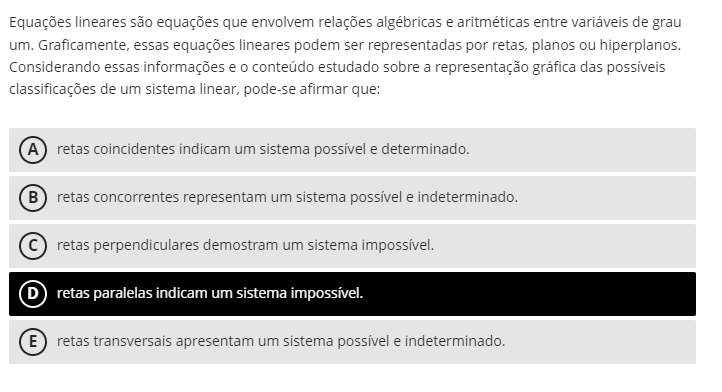 <p>Equações lineares são equações que envolvem relações algébricas e aritméticas entre variáveis de grau um. Graficamente, essas equações lineares podem ser representadas por retas, planos ou hiperplanos. Considerando essas informações e O conteúdo estudado sobre a representação gráfica das possíveis classificações de um sistema linear, pode-se afirmar que: A retas coincidentes indicam um sistema possível e determinado. B retas concorrentes representam um sistema possível e indeterminado. C retas perpendiculares demostram um sistema impossível. D retas paralelas indicam um sistema impossível. E retas transversais apresentam um sistema possível e indeterminado.</p>