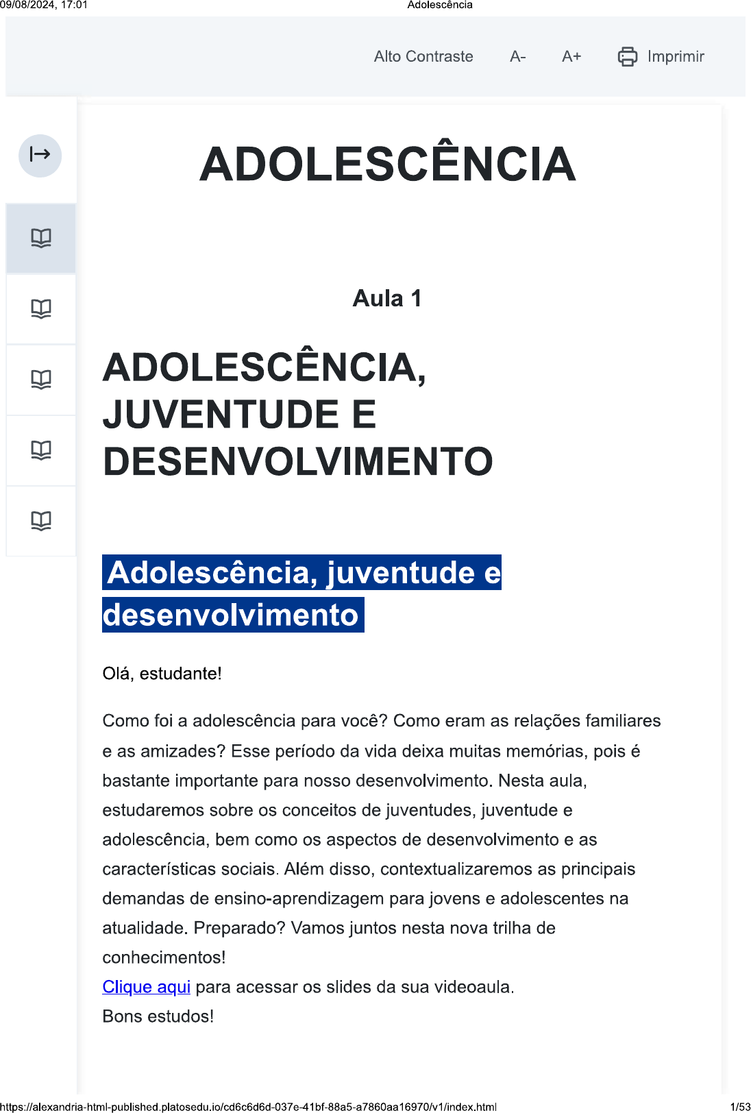 <p>09/08/2024, 17:01 Adolescência Alto Contraste A- A+ Imprimir ADOLESCÊNCIA Aula 1 ADOLESCÊNCIA, JUVENTUDE E DESENVOLVIMENTO Adolescência, juventude e desenvolvimento Olá, estudante! Como foi a adolescência para você? Como eram as relações familiares e as amizades? Esse período da vida deixa muitas memórias, pois é bastante importante para nosso desenvolvimento. Nesta aula, estudaremos sobre os conceitos de juventudes, juventude e adolescência, bem como os aspectos de desenvolvimento e as características sociais. Além disso, contextualizaremos as principais demandas de ensino-aprendizagem para jovens e adolescentes na atualidade. Preparado? Vamos juntos nesta nova trilha de conhecimentos! Clique aqui para acessar os slides da sua videoaula. Bons estudos! 1/53</p><p>Ponto de Partida Boas-vindas à primeira aula da disciplina Adolescência e Juventude no Século XXI. Se você está aqui, em um curso de nível superior, certamente já vivenciou ou continua na fase da adolescência e da juventude. Mas será que há uma distinção clara entre adolescência e juventude? Podemos considerar adolescência como um processo inerente à condição humana? Qual é o papel da escola no desenvolvimento dos adolescentes? Refletir sobre esses questionamentos é crucial para uma compreensão mais ampla dos diferentes momentos de desenvolvimento humano em seu aspecto biopsicossocial. Para nos aprofundarmos um pouco mais nesses assuntos, imagine uma turma do 9° ano do Ensino Fundamental de um colégio público, na qual alguns dos estudantes, nos últimos meses, parecem mais desmotivados, enquanto outros exibem mudanças de humor abruptas. desempenho acadêmico de alguns deles está abaixo do esperado, e há relatos de conflitos interpessoais. Diante desses desafios, um professor começa a questionar-se sobre a importância de compreender melhor a adolescência para conseguir mediar algumas dessas situações em sala de aula. As indagações a seguir podem servir de base para essa busca de maior entendimento: 2/53</p><p>09/08/2024, 17:01 Adolescência De que maneira a percepção das mudanças cognitivas e emocionais típicas da adolescência pode auxiliar o professor em relação ao trabalho pedagógico e educacional com os discentes? Pensando em ajudar esse professor, exploraremos mais profundamente essas questões utilizando este material de estudo. Por isso, dedique tempo e energia ao aprendizado e encare este momento não como obrigação, mas como fonte valiosa de saberes. Bons estudos! Vamos Começar! Adolescência e juventude: aspectos biológicos, políticos e sociais Quando você pensa em sua adolescência, o que vem primeiro à mente? Quais são as principais lembranças? Com certeza, todos nós temos memórias positivas e negativas desse período da vida, dado que a adolescência é uma fase de transição para a vida adulta e um momento de construção interna como sujeitos no mundo. Todavia, não se trata de uma transição simples; ela apresenta especificidades que abordaremos mais detalhadamente a seguir. Inicialmente, é necessário compreender o surgimento dessa concepção, pois nem sempre a ideia de adolescência existiu histórica e socialmente. O historiador francês Philippe Ariès (1986), em seus estudos sobre os contextos social, escolar e infantil durante a Idade Média na Europa, constatou que o conceito de adolescência só emergiu no final do século XVIII e só se disseminou efetivamente no século XX. Segundo esse autor, por volta dos 7 anos de idade, as crianças eram integradas ao mundo do trabalho, com poucas oportunidades de estudo. Eram consideradas "miniadultos"; não se via motivo para a diferenciação, nem 3/53</p><p>09/08/2024, 17:01 Adolescência Isso também ocorria em idades posteriores, entre 13 e 20 anos. Por exemplo, no período medieval, era comum que estudantes de todas as idades ocupassem as mesmas salas de aula, estudando o mesmo conteúdo; essa mistura de idades era observada também fora da escola. Ou seja, a partir do momento que a criança adquiria um pouco mais de autonomia, já podia ser inserida no mundo adulto. Com as transformações sociais pós-período de industrialização e a mudança na concepção da própria família burguesa (surgida durante a Revolução Industrial, nos séculos XVIII e XIX, na Europa, a família burguesa caracterizava-se por uma estrutura nuclear, com ênfase em educação, papel definido para a mulher, transmissão de propriedade e herança e vida urbana), a infância e a adolescência começaram a ganhar mais destaque nas sociedades modernas. Conforme Avila (2005), a adolescência passou a ser considerada como um período de transição, um espaço intermediário entre a infância e a idade adulta, entre a maturidade biofisiológica e a maturidade psicossocial. No contexto brasileiro, o reconhecimento da infância, bem como dos direitos e dos deveres das crianças, também foi se construindo ao longo dos séculos, conforme se ressignificava o papel das instituições escolares e da família e com a industrialização da sociedade. Durante o período colonial, por exemplo, era comum a atuação de crianças no trabalho escravo, assim como as questões de abandono de menores. Muitas dessas crianças abandonadas foram, inicialmente, acolhidas nas Santas Casas de Misericórdia, que implantaram as chamadas "rodas dos expostos". Instaladas nos muros ou nas janelas das instituições, essas rodas tinham um formato cilíndrico e uma divisória ao meio. No lado externo, o responsável pelo abandono colocava a criança na abertura do dispositivo que, ao ser girado, transferia a criança para o lado interno. Espaços como esses, e posteriormente creches, pré-escolas e escolas, começaram a trazer para discussão social e política as necessidades 4/53</p><p>09/08/2024, 17:01 Adolescência A propósito, adolescência e juventude são sinônimos? Apesar de compreenderem um período de desenvolvimento etário próx