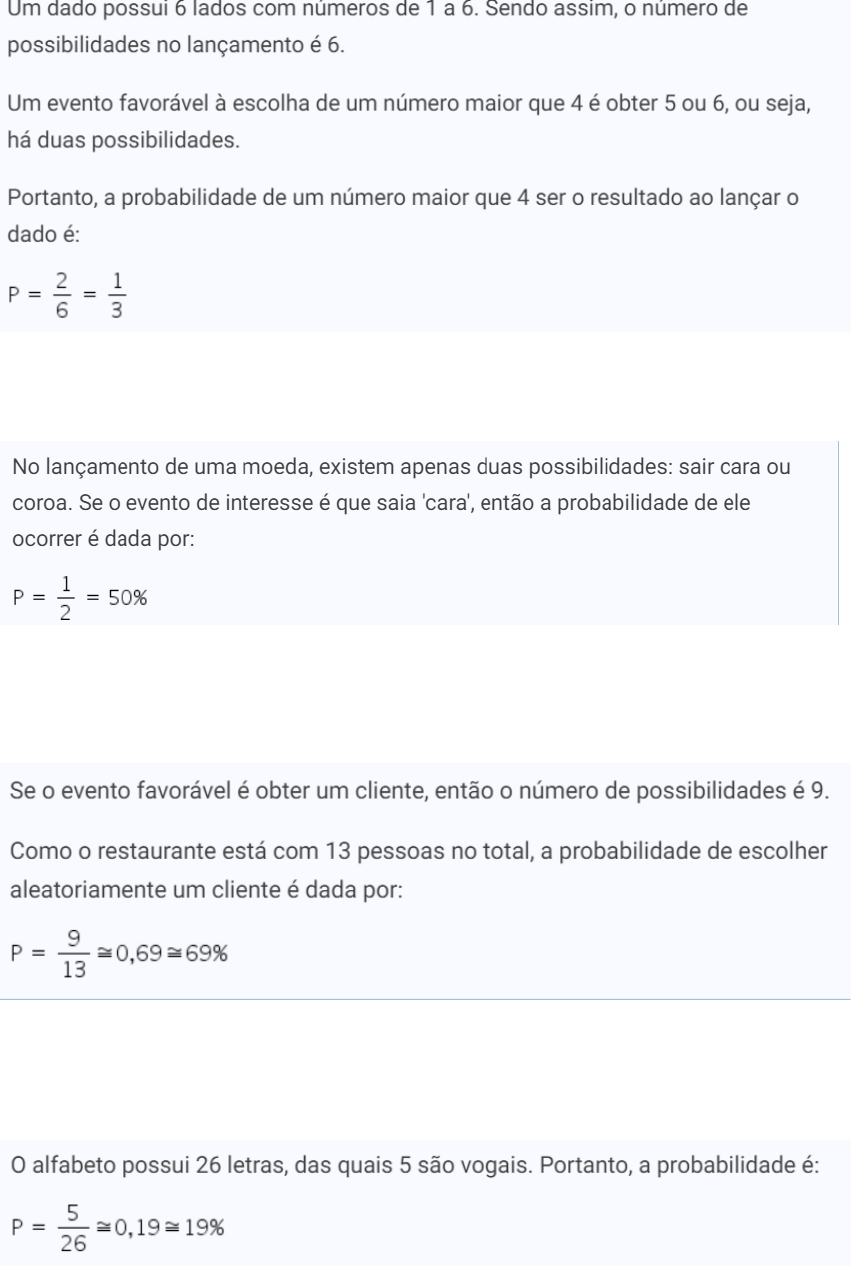 <p>1.Se lançarmos um dado, qual a probabilidade de obtermos um número maior que 4?</p><p>a) 2/3 b) ¼ c) 1/3 d) 3/2</p><p>2.Se lançarmos uma moeda, qual a probabilidade do lado “cara” ficar voltado para cima?</p><p>a)1/3 b) ½ c) ¼ d) 0</p><p>3.Um restaurante está com 13 pessoas: 9 clientes e 4 garçons. Se escolhermos uma pessoa</p><p>do local aleatoriamente, qual a probabilidade de ser um cliente?</p><p>a) 3/13 b) 9/13 c) 6/13 d) 7/13</p><p>4.Se você escolher aleatoriamente uma letra no alfabeto, qual a probabilidade de</p><p>selecionar uma vogal?</p><p>a) 5/13 b) 7/13 c) 7/26 d) 5/26</p><p>5.Se é escolhido aleatoriamente um número da sequência (2, 3, 5, 7, 11, 13, 17, 19) qual</p><p>a probabilidade de escolher um número primo?</p><p>a) 3/8 b) 1 c) 0 d) 5/8</p><p>6.Se uma turma é formada por 8 alunos do sexo feminino e 7 do sexo masculino e a</p><p>professora escolher aleatoriamente um estudante para ir ao quadro resolver um exercício,</p><p>qual a probabilidade de ser selecionada uma aluna?</p><p>a) 8/15 b) 7/15 c) 11/15 d) 13/15</p><p>7.Escolhendo aleatoriamente um dia da semana, qual a probabilidade de escolher uma</p><p>segunda ou uma sexta-feira?</p><p>a) 4/7 b) 1/7 c) 2/7 d) 3/7</p><p>8.Uma pessoa foi até a padaria para comprar pão e iogurte. Se o estabelecimento possui</p><p>30 pães, sendo que 5 são do dia anterior e os outros foram fabricados no dia, e 20 iogurtes</p><p>com data de validade inelegível, dos quais 1 já venceu, qual a probabilidade do cliente</p><p>escolher um pão do dia e um iogurte na validade?</p><p>a) 19/24 b) 17/30 c) 14/27 d) 18/29</p><p>9.João possui um pote com balas coloridas. Ele resolveu contar quantas balas de cada cor</p><p>havia no recipiente e chegou aos números:</p><p>• 6 balas vermelhas</p><p>• 3 balas verdes</p><p>• 5 balas brancas</p><p>• 7 balas amarelas</p><p>Colocando todas as balas de volta ao pote e escolhendo dois doces para comer, qual a</p><p>probabilidade de João pegar aleatoriamente uma bala vermelha e uma amarela em</p><p>sequência, sem repor a primeira retirada?</p><p>a) 4/19 b) 3/27 c) 1/23 d) 1/10</p><p>10.Qual a probabilidade de escolher uma carta no baralho e essa carta não ser um ás?</p><p>a) 17/12 b) 12/13 c) 14/13 d) 11/12</p><p>11.Em uma urna há 12 bolas vermelhas, 5 bolas azuis e 3 bolas verdes. Sorteando uma</p><p>bola ao acaso, qual a probabilidade de ser uma bola:</p><p>a) vermelha</p><p>b) azul</p><p>c) verdes</p><p>12. Ao lançar um dado não viciado, qual a probabilidade de sair um número menor que</p><p>4?</p><p>13. Em um ônibus de excursão há:</p><p>mulheres homens</p><p>casados 6 8</p><p>solteiros 9 7</p><p>Um sorteio será realizado com o grupo de turistas que estavam no passeio. Qual a</p><p>probabilidade de ser sorteada uma mulher casada?</p>
