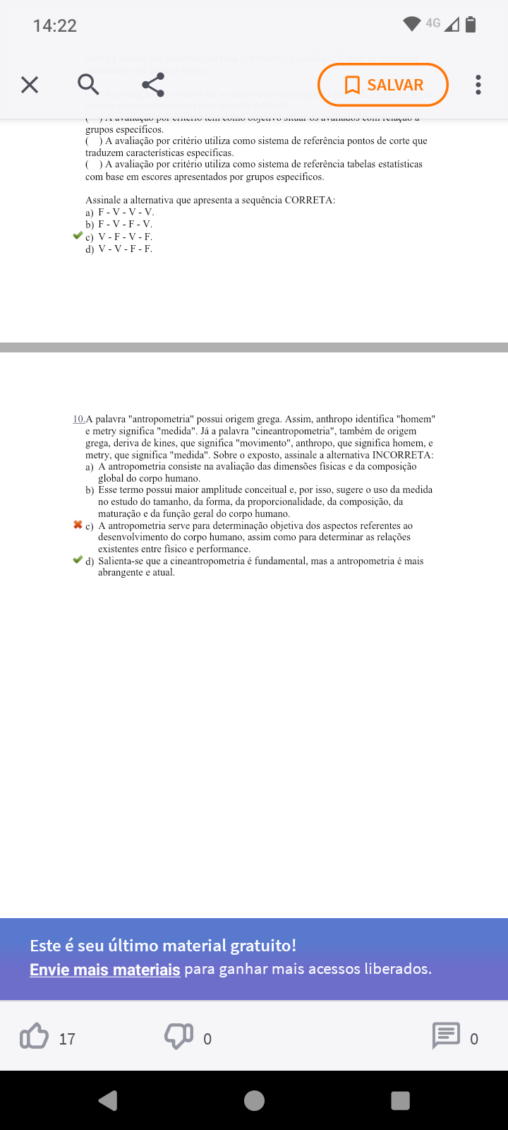 <p>14:22 4G X SALVAR , grupos ( ) A avaliação por critério utiliza como sistema de referência pontos de corte que traduzem características ( ) A avaliação por critério utiliza como sistema de referência tabelas estatísticas com base em escores apresentados por grupos específicos. Assinale a alternativa que apresenta a sequência CORRETA: a) F V V V. b) F V F V. c) V-F-V F. d) 10.A palavra "antropometria" possui origem grega. Assim, anthropo identifica "homem" e metry significa "medida" Já a palavra "cineantropometria", também de origem grega, deriva de kines, que significa anthropo, que significa homem, e metry, que significa Sobre o exposto, assinale a alternativa INCORRETA: a) A antropometria consiste na avaliação das dimensões e da composição global do corpo b) Esse termo possui maior amplitude conceitual e. por sugere o uso da medida no estudo do tamanho, da forma, da da da maturação e da função geral do corpo c) A antropometria serve para determinação objetiva dos aspectos referentes ao desenvolvimento do corpo humano, assim como para determinar as relações existentes entre fisico e d) Salienta-se que a cineantropometria é fundamental, mas a antropometria é mais abrangente e atual. Este é seu último material gratuito! Envie mais materiais para ganhar mais acessos liberados. 17 0 0</p>