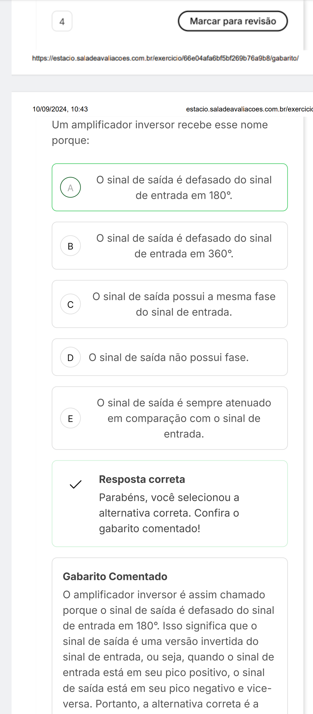 <p>4 Marcar para revisão 10/09/2024, 10:43 Um amplificador inversor recebe esse nome porque: O sinal de saída é defasado do sinal A de entrada em 180°. O sinal de saída é defasado do sinal B de entrada em 360°. O sinal de saída possui a mesma fase C do sinal de entrada. D O sinal de saída não possui fase. sinal de saída é sempre atenuado E em comparação com sinal de entrada. Resposta correta Parabéns, você selecionou a alternativa correta. Confira o gabarito comentado! Gabarito Comentado O amplificador inversor é assim chamado porque o sinal de saída é defasado do sinal de entrada em 180°. Isso significa que o sinal de saída é uma versão invertida do sinal de entrada, ou seja, quando o sinal de entrada está em seu pico positivo, o sinal de saída está em seu pico negativo e vice- versa. Portanto, a alternativa correta é a</p>