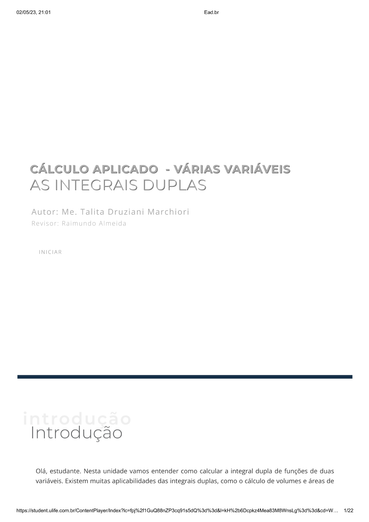 <p>02/05/23, 21:01 Ead.br CÁLCULO APLICADO - VÁRIAS VARIÁVEIS AS INTEGRAIS DUPLAS Autor: Me. Talita Druziani Marchiori Revisor: Raimundo Almeida INICIAR introdução Introdução Olá, estudante. Nesta unidade vamos entender como calcular a integral dupla de funções de duas variáveis. Existem muitas aplicabilidades das integrais duplas, como o cálculo de volumes e áreas de 1/22</p><p>02/05/23, 21:01 Ead.br superfícies, determinar massas e centroides etc. Iniciamos a unidade com integrais duplas calculadas sobre regiões retangulares e, em seguida, calcularemos essas integrais através das integrais iteradas. Após, vamos aprender a determinar integrais duplas em regiões mais gerais. Por fim, trabalharemos com um novo sistema de coordenadas bidimensional, as coordenadas polares. Sugerimos que resolva todos os exemplos e exercícios propostos, esclarecendo suas dúvidas. Além disso, realize exercícios extras. Sua dedicação será fundamental para o aprendizado! 2/22</p><p>02/05/23, 21:01 Ead.br Integral Dupla em Regiões Retangulares Caro(a) estudante(a), já sabemos que podemos calcular as derivadas parciais de funções de duas variáveis reais, considerando uma das variáveis como sendo constante e derivando em relação a outra. Por exemplo, sendo f(x,y) = 4x3y2 temos que fx(x,y) = 12x2y2. Do mesmo modo, podemos calcular uma integral indefinida de uma função de duas variáveis. Se desejarmos determinar a integral indefinida da função f(x,y) = 4x3y2 em relação à variável podemos calcular a integral indefinida considerando a variável como constante, ou seja, = 4y2 = Sabemos que a integral definida com f sendo uma função contínua e não negativa para a < < b, é definida como a área delimitada pela do eixo retas x = aex = be pelo gráfico de Agora, vamos considerar uma função f positiva, definida em um retângulo R : Denotamos por S a região que está acima de R e abaixo do gráfico de o intervalo a, b em m intervalos da forma de mesmo comprimento intervalo [c,d] em intervalos da forma de mesmo comprimento A = temos que o volume de S é dado por m i=1 onde é um ponto arbitrário de cada xA Esse tipo de limite acontece também em outras situações, mesmo se f não for uma função positiva, então definimos a integral dupla de onde f é uma função de duas variáveis x e Y, sobre o</p><p>02/05/23, 21:01 Ead.br retângulo R como AA lim m i=1 j=1 se o limite existir. Então, se este limite existir, f é dita integrável. Então, pelo que vimos, se f(x,y) > 0, o volume V do sólido que está acima do retângulo e abaixo da superfície f(x,y) é dado por V = ou seja, o cálculo de volumes é uma aplicação das integrais duplas. Por exemplo, o volume do sólido S que está abaixo de e acima de X [-2,2] é dado por Note que o gráfico de f(x,y) = z=1-x2 é maior ou igual a zero e é representado pela Figura 3.1. 3 2.5 2 1.5 -2.5 1.5 1.5 2 2 2.5 2.5 y Figura 3.1 - Gráfico de f(x,y) = Fonte: Elaborada pela autora. Como estamos restringindo o eixo nos pontos do intervalo [-2,2], temos que a integral dupla de 1 - x2 sobre é a metade do volume do cilindro de altura 4 e raio da base 1. Logo, Como a integral dupla está definida através do cálculo de um limite e, nem todas as integrais conseguimos relacionar com fórmulas já conhecidas, como no caso anterior, sua resolução não é eficiente. Porém, temos propriedades que auxiliam no cálculo das integrais. Admitindo que A A existam, é válido que: A A = A 4/22</p><p>02/05/23, 21:01 Ead.br = A A, onde C é uma constante. Sendo f(x,y) g(x,y) (x,y) E A A. Por exemplo, se A A AA=2, então AA=5 praticar Vamos Praticar Pelo que aprendemos, podemos calcular o volume de um sólido através das integrais duplas A A A. Como os pontos e são pontos arbitrários de cada Rij = considerar os pontos médios de cada técnica é conhecida como regra do ponto médio para integrais duplas e com ela temos que a integral A A é aproximadamente igual a A A, médios de cada Rij = X Utilizando essa técnica, para estimativa da integral R é: b) - 8,50. d) 0,368. 5/22</p><p>02/05/23, 21:01 Ead.br Integrais Iteradas Querido(a) aluno(a), o Teorema Fundamental do Cálculo nos fornece um método para calcular as integrais de funções de uma variável real sem precisarmos recorrer à definição. Neste tópico, veremos como determinar uma integral dupla sem necessitar utilizar a sua definição. Esse método consiste em calcular uma integral dupla calculando duas integrais ordinárias. Sendo uma função f de duas variáveis definida sobre o retângulo = estaremos considerando X como constante quando trabalharmos com f(x,y)dy. O resultado dessa integração é uma função que depende de que podemos denotar = dy, daí podemos integrar A em relação a ou seja, = Do mesmo modo, consideramos como constante quando integramos f(x,y) dx. O resultado dessa integração é uma função que depende de donde, podemos integrá-lo em relação a Y, isto é, Note ainda que podemos omitir o uso dos colchetes. Chamamos as integrais duplas dydx e dxdy de integrais iteradas. Então, a integral iterada significa que primeiro integramos em relação a no intervalo (c,d) e, depois, integramos em relação a no intervalo (a,b). Já na integral iterada f(x,y) dxdy, primeiro integramos em relação a no intervalo depois em relação a no intervalo (c, d). Por exemplo, para calcular primeiro olhamos x como constante e integramos em relação a no intervalo (1,2), isto é, = Agora, integramos esse resultado em relação a x no intervalo (0,3), assim, 27 2</p><p>02/05/23, 21:01 Ead.br Você pode se perguntar, se calcular a integral iterada teremos o resultado? Em geral, a resposta é sim! Então, vamos verificar: primeiro integrando em relação a consideramos como constante, donde = = e, integrando o resultado em relação a 2 Podemos determinar a integral dupla por esse método de forma direta, como: = = = De maneira geral, se f for contínua no = Este resultado