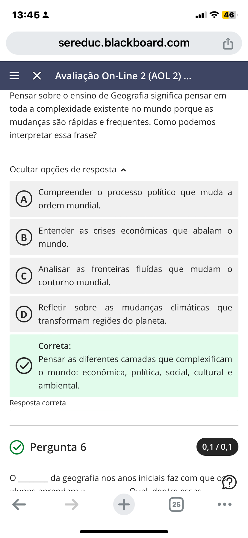 <p>13:45 : 46 sereduc.blackboard.com X Avaliação On-Line 2 (AOL 2) ... Pensar sobre o ensino de Geografia significa pensar em toda a complexidade existente no mundo porque as mudanças são rápidas e frequentes. Como podemos interpretar essa frase? Ocultar opções de resposta ^ Compreender o processo político que muda a A ordem mundial. Entender as crises econômicas que abalam o B mundo. Analisar as fronteiras fluídas que mudam o C contorno mundial. Refletir sobre as mudanças climáticas que D transformam regiões do planeta. Correta: Pensar as diferentes camadas que complexificam o mundo: econômica, política, social, cultural e ambiental. Resposta correta Pergunta 6 da geografia nos anos iniciais faz com que 08 ? + 25</p>