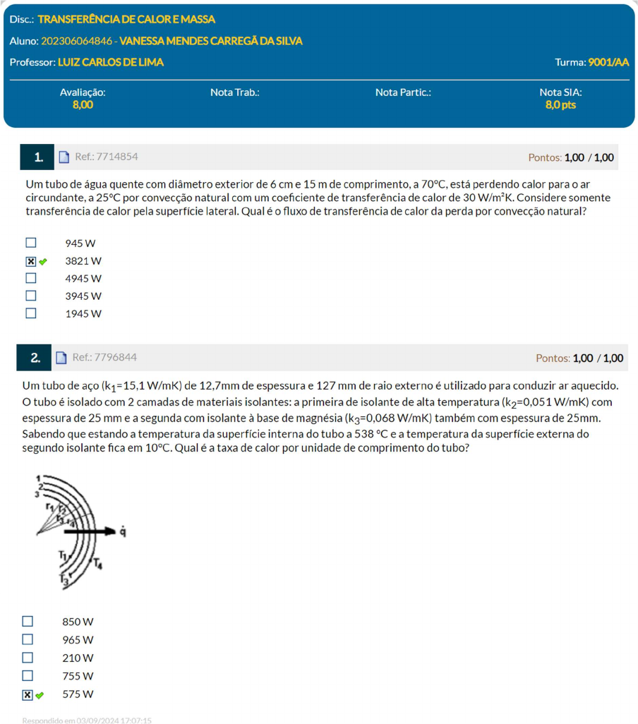 <p>Disc.: TRANSFERÊNCIA DE CALOR E MASSA Aluno: 202306064846 VANESSA MENDES DA SILVA Professor: LUIZ CARLOS DE LIMA Turma: 9001/AA Avaliação: Nota Trab.: Nota Partic.: Nota SIA: 8,00 8,0 pts 1. 7714854 Pontos: 1,00 / 1,00 Um tubo de água quente com diâmetro exterior de 6 cm e 15 m de comprimento, a está perdendo calor para o an circundante, a 25°C por convecção natural com um coeficiente de transferência de calor de 30 Considere somente transferência de calor pela superfície lateral. Qual é o fluxo de transferência de calor da perda por convecção natural? 945 W 3821 W 4945 W 3945 W 1945 W 2. Ref.: 7796844 Pontos: 1,00 / 1,00 Um tubo de aço (k1=15,1 W/mK) de 12.7mm de espessura e 127 mm de raio externo é utilizado para conduzir an aquecido. tubo é isolado com 2 camadas de materiais isolantes: a primeira de isolante de alta temperatura (k2=0,051 W/mK) com espessura de 25 mm e a segunda com isolante à base de magnésia (k3=0,068 W/mK) também com espessura de 25mm. Sabendo que estando a temperatura da superfície interna do tubo a 538 °C e a temperatura da superfície externa do segundo isolante fica em 10°C. Qual é a taxa de calor por unidade de comprimento do tubo? 1 2 3 T1 T4 850 W 965 W 210 W 755 W 575 W Respondido em 03/09/2024 17:07:15</p><p>3. Ref.: 7797177 Pontos: 1,00 / 1,00 A distribuição de temperaturas, em regime estacionário, em uma placa plana de material semitransparente, com condutividade térmica k e espessura exposto a irradiação laser. Nesta situação, absorção de radiação do material é manifestada por um termo de geração de calor distribuída, (x). Qual é a equação que representa a condução de calor? Utilize a equação geral de calor em coordenadas cartesianas. dx2 dx2 ST - k St q = ST a q = . ST + k a St .2 Respondido em 03/09/2024 17:10:18 Ref.: 7797811 Pontos: Um reservatório "recinto horizontal" de 6 m de alto e 3 m de largura consta de duas superfícies separadas por um espaço de 5 m cheio de Hélio. Se as temperaturas das superfícies a um e outro lado do espaço de Hélio são 150 K e 290K, e as emissividades delas são 0,5 e 0,80, determine a fração de calor resfriado através do recinto mediante convecção. As propriedades do fluido na temperatura média das duas paredes são: k = W/mK 220 K Pr 0,46 0,85 0,50 0,60 0,75 Respondido em 04/09/2024 13:44:39</p><p>5. Ref.: 7797799 Pontos: Óleo de motor usado quente a 147°C flui paralelamente a uma placa plana a uma velocidade de A temperatura superficial da placa plana de 1 m de comprimento é constante de As propriedades do fluido na temperatura do filme é: 380 K Pr=0,7 Qual é o coeficiente local de transferência de calor por convecção a 0,5 m do borde de ataque? 17 67 97 87 47 Respondido em 6. Ref.: 7800993 Pontos: Um problema de transferência de calor por radiação, estado estacionário, entre uma esfera (r1=0,50m) e um disco circular (r2=0,1m) os quais estão separados por uma distância de centro a centro Quando a normal ao centro do disco passa pelo centro da esfera o fator de forma para radiação é expresso por: As temperaturas superficiais da esfera e do disco são 800K e 500K respectivamente, e suas emissividades são 0,4 respectivamente. Qual é o fator de forma F21? 0,75 0,89 0,67 0,85 0,97 Respondido em 04/09/2024 12:47:18</p><p>7. Ref.: 7800990 Pontos: 1,00 / 1,00 Sabendo que F14=0,10 ,F(4+2)-+3=0,20 e Qual é o fator de forma F12 entre as superfícies retangulares da figura abaixo? Dica: Utilize a regra de superposição e posteriormente a regra de reciprocidade duas vezes para encontrar a resposta. 1 1 m m 3 m 4 1 m 2 4 m 0,15 0,26 0,10 0,30 0,20 8. Ref.: 7797292 Pontos: 0,00 / 1,00 Um trocador de calor de casco tubo, com passagem pelo casco e 2 passagens pelo tubo (U.As= 10000 W/K) onde água (Cp=4180 J/kg.K) é usado para um óleo (Cp= 4000 J/kg.K). A temperatura de entrada da água é de 20°C com uma vazão de 8 kg/s enquanto a bomba do óleo circula a 5kg/s. óleo entra a 90°C. nestas condições a efetividade do radiador é de 0,5. Qual é o valor da temperatura de saída da água? 31°C 61°C 70°C 41°C 52°C Respondido em 03/09/2024 17:29:25</p><p>9. Ref.: 7797072 Pontos: 1,00 / 1,00 Um tubo num trocador de calor tem um diâmetro interno de 0,20 m e 0,25 m de externo. A condutividade térmica do material do tubo é de 20 W/m.K enquanto que o coeficiente de transferência de calor na superfície interna é 800 e da superfície externa de 500 Qual é a relação entre o coeficiente de transferência de calor do trocador baseado na superfície interna e externa? 1 2 0,5 0,6 Respondido em 03/09/202417:31:46 10. Ref.: 7797695 Pontos: Um recipiente de borracha de 10 mm de espessura e 1 m de comprimento se utiliza para armazenar CO2 a 298 K e 1 bar de pressão. A área superficial total do recipiente é de 6 Assumindo as seguintes propriedades: { = 1,1 x 10-10 = 0,040151 = 44 Qual é o valor da densidade do CO2 na interfase com a borracha? 1,23 1,77 5,41 9,25 2,30 Respondido em 03/09/2024 17:43:54</p>