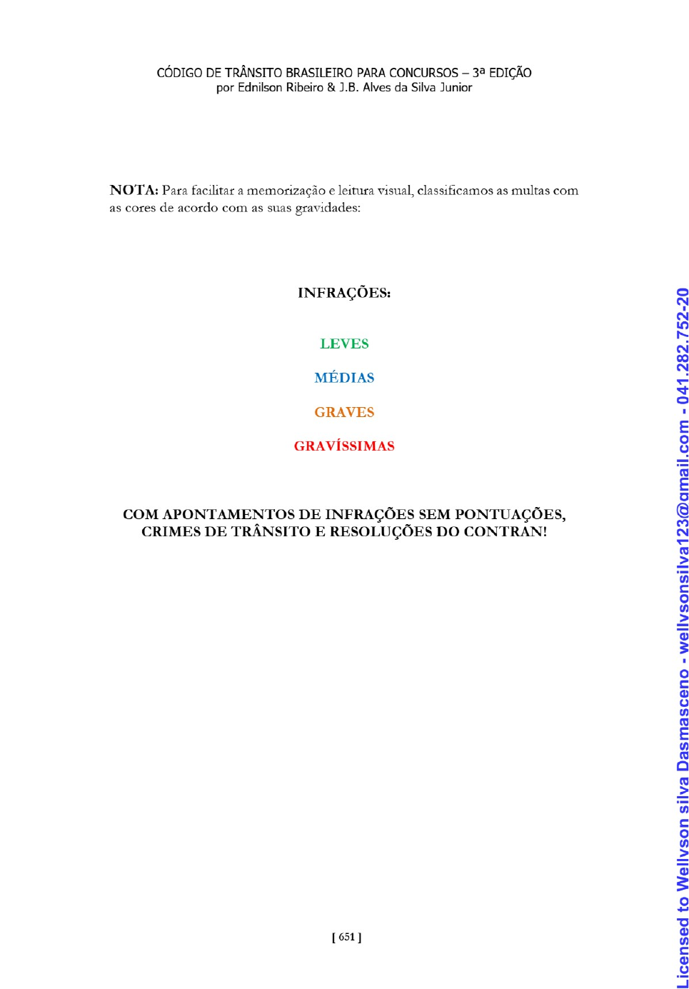 <p>CÓDIGO DE TRÂNSITO BRASILEIRO PARA CONCURSOS - EDIÇÃO por Ednilson Ribeiro & J.B. Alves da Silva Junior NOTA: Para facilitar a memorização e leitura visual, classificamos as multas com as cores de acordo com as suas gravidades: INFRAÇÕES: LEVES MÉDIAS GRAVES GRAVÍSSIMAS COM APONTAMENTOS DE INFRAÇÕES SEM PONTUAÇÕES, CRIMES DE TRÂNSITO E RESOLUÇÕES DO CONTRAN! [</p><p>CÓDIGO DE TRÂNSITO BRASILEIRO PARA CONCURSOS EDIÇÃO por Ednilson Ribeiro & J.B. Alves da Silva Junior Art. Infrações LEVES R$ 88,38 + 3 pontos P. M.A. 169 Dirigir sem atenção ou sem os cuidados indispensáveis à Multa Não segurança. Fazer ou deixar que se faça reparo em veículo na via 179-II pública, salvo nos casos de impedimento absoluto de sua Multa Não remoção e em que o veículo esteja devidamente sinalizado nas demais vias. (arterial, coletora e local) 181-II Estacionar o veículo afastado da guia da calçada (meio-fio) Multa de 50 centímetros a 1 metro. Remoção Estacionar o veículo nos acostamentos, salvo motivo de 181-VII Multa força maior. Remoção 182-II Parar o veículo afastado da guia da calçada (meio-fio) de 50 Multa Não centímetros a 1 metro. 182-IV Parar o veículo em desacordo com as posições Multa Não estabelecidas neste código. Parar o veículo no passeio ou sobre faixa destinada a 182-VI pedestres, nas ilhas, refúgios, canteiros centrais e Multa Não divisores de pista de rolamento e marcas de canalização. Transitar com veículo na faixa ou pista da direita, 184-I regulamentada como de circulação exclusiva para Multa Não determinado tipo de veículo, exceto para acesso a imóveis lindeiros ou conversões à direita. Ultrapassar veículo em movimento que integre cortejo, 205 préstito, desfile e formações militares, salvo com Multa Não autorização da autoridade de trânsito ou de seus agentes. Fazer uso do facho de luz alta dos faróis em vias providas 224 Multa Não de iluminação Usar buzina em situação que não a de simples toque 227-I breve como advertência ao pedestre ou a condutores de Multa Não outros veículos. 227-II Usar buzina prolongada e sucessivamente a qualquer Multa Não pretexto. 227-III Usar buzina entre as 22hs e as 06hs. Multa Não 227-IV Usar buzina em locais e horários proibidos pela Multa Não sinalização. 227-V Usar buzina em desacordo com os padrões e frequências Multa Não estabelecidas pelo contran. (res. 764/18) Conduzir veículo sem os documentos de porte Multa sem 232 obrigatório referidos neste código. Retenção pontuação Deixar de atualizar cadastro de registro do veículo ou de Multa sem 241 Não habilitação do condutor. pontuação proibido ao pedestre permanecer ou andar nas pistas Multa 50% 254-I Não de rolamento, exceto para cruzá-las onde for permitido. do valor É proibido ao pedestre cruzar pistas de rolamento nos Multa 50% 254-II Não viadutos, pontes, ou túneis, salvo onde exista permissão. do valor proibido ao pedestre atravessar a via dentro das áreas Multa 50% 254-III de cruzamento, salvo quando houver sinalização para esse Não do valor fim. 652</p><p>CÓDIGO DE TRÂNSITO BRASILEIRO PARA CONCURSOS - EDIÇÃO por Ednilson Ribeiro & J.B. Alves da Silva Junior E proibido ao pedestre utilizar-se da via em agrupamentos capazes de perturban trânsito, ou para a 254-IV prática de qualquer folguedo, esporte, desfiles e similares, Multa 50% Não salvo em casos especiais e com a devida licença da autoridade do valor competente. 254-V proibido ao pedestre andar fora da faixa própria, Multa 50% passarela, passagem aérea ou subterrânea. Não do valor 254-VI E proibido ao pedestre desobedecer à sinalização de Multa 50% trânsito específica. Não do valor [ 653 ]</p><p>CÓDIGO DE TRÂNSITO BRASILEIRO PARA CONCURSOS EDIÇÃO por Ednilson Ribeiro & J.B. Alves da Silva Junior ART. INFRAÇÕES R$ 130,16 + 4 PONTOS P. M. A. Usar o veículo para ARREMESSAR sobre os ou 171 Multa Não veículos², ÁGUA OU DETRITOS. ATIRAR do veículo ou abandonar na via OBJETOS OU 172 Multa Não DEIXAR CONDUTOR, envolvido em SINISTRO SEM VÍTIMA, de adotar providências para REMOVER 178 Multa Não VEÍCULO DO LOCAL, quando necessária tal medida para a segurança e a fluidez do Ter seu veículo imobilizado na via por FALTA DE 180 Multa Remoção ESTACIONAR nas esquinas e a MENOS DE 5 METROS 181-I Multa do bordo do alinhamento da via transversal. Remoção ESTACIONAR em DESACORDO COM AS 181-IV Multa POSIÇÕES estabelecidas no CTB. Remoção ESTACIONAR junto ou sobre HIDRANTES DE INCÊNDIO, REGISTRO DE ÁGUA OU TAMPAS DE 181-VI POÇOS de visita de galerias subterrâneas, desde que Multa Remoção devidamente identificados, conforme especificação do CONTRAN. (RES. 31/98) ESTACIONAR onde houver guia de CALÇADA (MEIO- 181-IX FIO) REBAIXADA destinada à entrada ou saída de Multa Remoção veículos. 181-X ESTACIONAR IMPEDINDO A MOVIMENTAÇÃO Multa de outro veículo. Remoção ESTACIONAR onde houver sinalização horizontal delimitadora de ponto de EMBARQUE OU 181- DESEMBARQUE DE PASSAGEIROS DE Multa XIII TRANSPORTE COLETIVO ou, na inexistência desta Remoção sinalização, no intervalo compreendido entre 10 METROS ANTES E DEPOIS do marco do ponto. 181-XV ESTACIONAR na CONTRAMÃO de direção. Multa Não 181- ESTACIONAR em locais e horários proibidos especificamente pela sinalização (PLACA PROIBIDO Multa XVIII Remoção ESTACIONAR). PARAR nas esquinas e a MENOS DE 5 METROS do 182-I Multa Não bordo do alinhamento da via transversal. 182-III PARAR afastado da guia da CALÇADA (MEIO-FIO) A Multa Não MAIS DE 1 METRO. PARAR na ÁREA DE CRUZAMENTO DE VIAS, 182-VII Multa Não PREJUDICANDO a circulação de veículos e pedestres. 182- PARAR nos VIADUTOS, PONTES E TÚNEIS. Multa Não VIII 182-IX PARAR na CONTRAMÃO de direção. Multa Não 182-X PARAR em local e horário proibidos especificamente pela Multa Não sinalização (PLACA PROIBIDO PARAR). PARAR veículo sobre a FAIXA DE PEDESTRES na 183 Multa Não mu