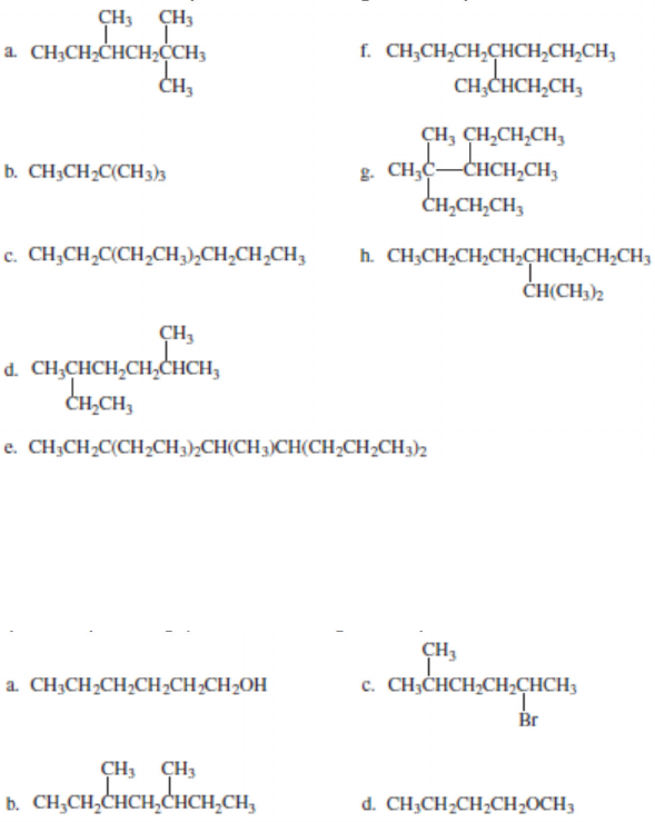 <p>QUÍMICA ORGÂNICA I</p><p>EXERCÍCIOS – CAPÍTULO 2</p><p>1. Desenhe as estruturas e nomeie os quatro isômeros constitucionais com a fórmula molecular C4H9Br.</p><p>2. Qual das alternativas a seguir pode ser usada para verificar se o carbono é tetraédrico?</p><p>a. O brometo de metila não possui isômeros constitucionais.</p><p>b. O tetraclorometano não possui um momento dipolar.</p><p>c. O dibromometano não possui isômeros constitucionais.</p><p>3. Escreva uma estrutura para cada um dos seguintes compostos:</p><p>a. álcool isopropílico d. cloreto de neopentila</p><p>b. fluoreto de isopentila e. terc-butilamina</p><p>c. iodeto de sec-butilo f. brometo de n-octila</p><p>4. Desenhe a estrutura de cada um dos seguintes compostos:</p><p>a. 2,3-dimetilexano d. 2,2-dimetil-4-propiloctano</p><p>b. 4-isopropil-2,4,5-trimetileptano e. 4-isobutil-2,5-dimetiloctano</p><p>c. 4,4-dietildecano f. 4-(1,1-dimetiletil)octano</p><p>5.</p><p>a. Desenhe os 18 octanos isoméricos.</p><p>b. Dê a cada isômero seu nome sistemático.</p><p>c. Quantos isômeros têm nomes comuns?</p><p>d. Quais isômeros contêm um grupo isopropil?</p><p>e. Quais isômeros contêm um grupo sec-butil?</p><p>f. Quais isômeros contêm um grupo terc-butil?</p><p>6. Dê o nome sistemático para cada um dos seguintes compostos:</p><p>7. Desenhe a estrutura e dê o nome sistemático de um composto com a fórmula molecular C5H12 que possui</p><p>a. apenas hidrogênios primários e secundários c. um hidrogênio terciário</p><p>b. somente hidrogênio primário d. dois hidrogênios secundários</p><p>8. Converta as seguintes estruturas condensadas em estruturas esqueléticas (lembre-se de que as estruturas condensadas mostram átomos,</p><p>mas possuem poucas ligações, se houver alguma, enquanto as estruturas esqueléticas mostram ligações, mas poucas, se houver, átomos):</p><p>9. Dê o nome sistemático para cada um dos seguintes compostos:</p><p>10. Dê dois nomes para cada um dos seguintes compostos e diga se cada halogeneto de alquila é primário, secundário ou terciário:</p><p>11. Desenhe as estruturas e forneça nomes sistemáticos para a–c substituindo um cloro por um hidrogênio de metilciclohexano:</p><p>a. um halogeneto de alquila primário</p><p>b. um halogeneto de alquilo terciário</p><p>c. três halogenetos de alquila secundários</p><p>12.</p><p>a. Dê o nome sistemático (IUPAC) para cada um dos seguintes éteres:</p><p>b. Todos esses éteres têm nomes comuns?</p><p>c. Quais são os nomes comuns deles?</p><p>13. Desenhe as estruturas de uma série homóloga de álcoois que possuam de um a seis carbonos e, em seguida, dê a cada um deles um</p><p>nome comum e um nome sistemático.</p><p>14. Dê a cada um dos seguintes compostos um nome sistemático e indique se cada um é um álcool primário, secundário ou terciário:</p><p>15. Escreva as estruturas de todos os álcoois terciários com a fórmula molecular C6H14O e dê a cada um o nome sistemático.</p><p>16. Dê nomes comuns e sistemáticos para cada um dos seguintes compostos:</p><p>17. Desenhe a estrutura de cada um dos seguintes compostos:</p><p>a. 2-metil-N-propilpropan-1-amina d. metildipropilamina</p><p>b. N-etiletanamina e. N,N-dimetilpentan-3-amina</p><p>c. 5-metilexan-1-amina f. cicloexiletilmetilamina</p><p>18. Para cada um dos seguintes compostos, forneça o nome sistemático e o nome comum (para aqueles que têm nomes comuns) e indique</p><p>se as aminas são primárias, secundárias ou terciárias:</p><p>19. Preveja o tamanho aproximado dos seguintes ângulos. (Dica: consulte as seções 1.11 e 1.12.)</p><p>a. o ângulo de ligação C–O–C em um éter</p><p>b. o ângulo de ligação C–N–C em uma amina secundária</p><p>c. o ângulo da ligação C–O–H em um álcool</p><p>d. o ângulo de ligação C–N–C em um sal de amônio quaternário</p><p>20.</p><p>a. Qual dos seguintes compostos formará ligações de hidrogênio entre suas moléculas?</p><p>b. Qual dos compostos anteriores forma ligações de hidrogênio com um solvente como o etanol?</p><p>22. Liste os seguintes compostos em ordem decrescente do ponto de ebulição:</p><p>23. Liste os seguintes compostos em ordem decrescente do ponto de ebulição:</p><p>24. Classifique os seguintes grupos de compostos em ordem decrescente de solubilidade em água:</p><p>25. Em qual dos seguintes solventes o cicloexano teria a menor solubilidade: pentanol, éter dietílico, etanol ou hexano?</p><p>26.</p><p>a. Desenhe todos os conformes escalonados e eclipsados que resultam da rotação em torno da ligação C-2–C-3 do pentano.</p><p>b. Desenhe um diagrama de energia potencial para rotação da ligação C-2–C-3 do pentano em 360 °, começando com o confôrmero</p><p>menos estável.</p><p>27. Usando as projeções de Newman, desenhe o confôrmero mais estável para o seguinte:</p><p>a. 3-metilpentano, considerando a rotação em torno da ligação C-2–C-3</p><p>b. 3-metilexano, considerando a rotação em torno da ligação C-3–C-4</p><p>c. 3,3-dimetilexano, considerando a rotação em torno da ligação C-3–C-4</p><p>29. A eficácia de um barbitúrico como sedativo está relacionada à sua capacidade de penetrar na membrana não polar de uma célula. Qual</p><p>dos seguintes barbitúricos você esperaria ser o sedativo mais eficaz?</p><p>30. Desenhe 1,2,3,4,5,6-hexametilcicloexano com</p><p>a. todos os grupos metil em posições axiais</p><p>b. todos os grupos metil em posições equatoriais</p><p>35. Qual terá uma porcentagem mais alta do confôrmero substituído com diequatorial, em comparação com o confôrmero substituído com</p><p>diaxial: trans-1,4-dimetilcicloexano ou cis-1-terc-butil-3-metilcicloexano?</p><p>36. Determine se cada um dos seguintes compostos é um isômero cis ou um isômero trans:</p><p>37.</p><p>a. Desenhe o conformador de cadeira mais estável de cis-1-etil-2-metilcicloexano.</p><p>b. Desenhe o conformador mais estável do trans-1-etil