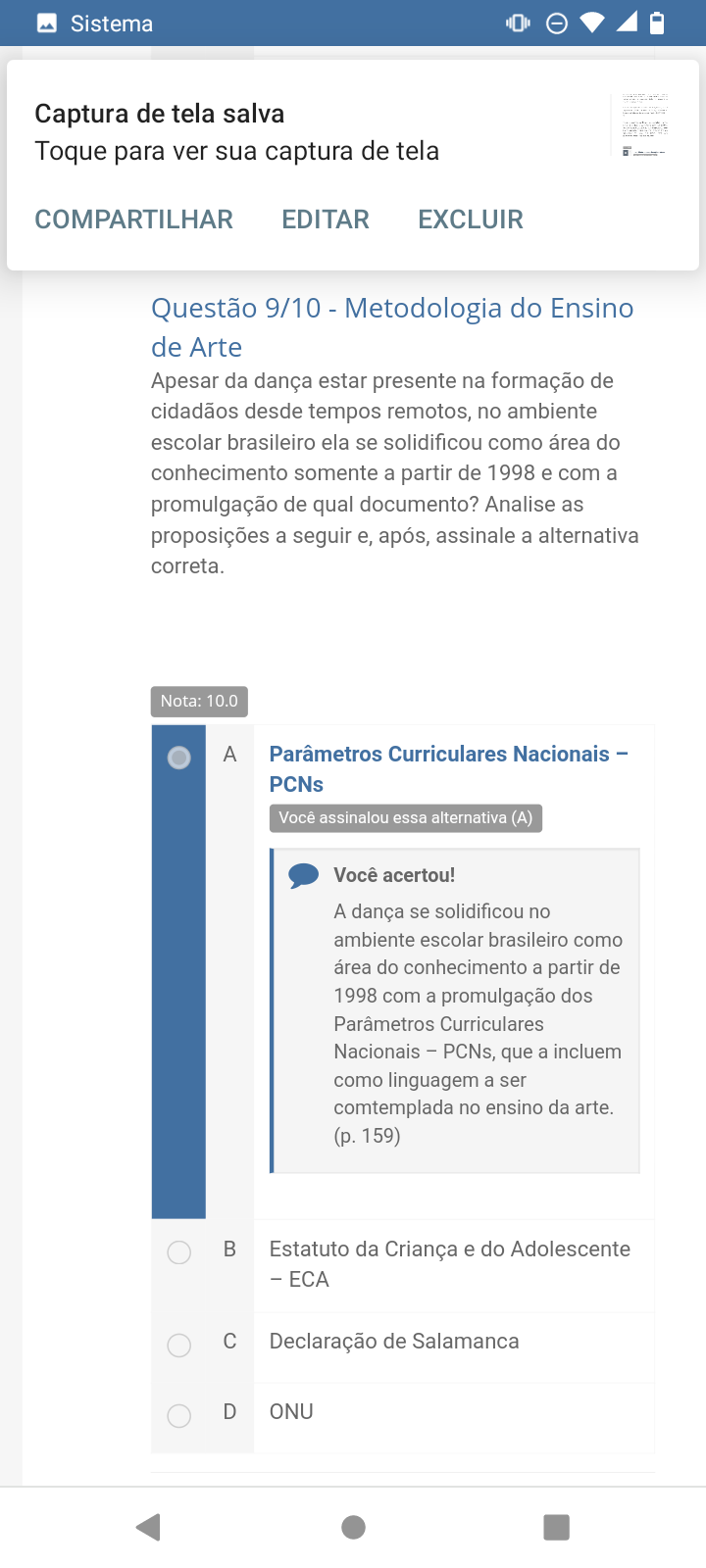<p>Sistema Captura de tela salva Toque para ver sua captura de tela COMPARTILHAR EDITAR EXCLUIR Questão 9/10 - Metodologia do Ensino de Arte Apesar da dança estar presente na formação de cidadãos desde tempos remotos, no ambiente escolar brasileiro ela se solidificou como área do conhecimento somente a partir de 1998 e com a promulgação de qual documento? Analise as proposições a seguir e, após, assinale a alternativa correta. Nota: 10.0 A Parâmetros Curriculares Nacionais - PCNs Você assinalou essa alternativa (A) Você acertou! A dança se solidificou no ambiente escolar brasileiro como área do conhecimento a partir de 1998 com a promulgação dos Parâmetros Curriculares Nacionais - PCNs, que a incluem como linguagem a ser comtemplada no ensino da arte. (p. 159) B Estatuto da Criança e do Adolescente - ECA C Declaração de Salamanca D ONU</p>