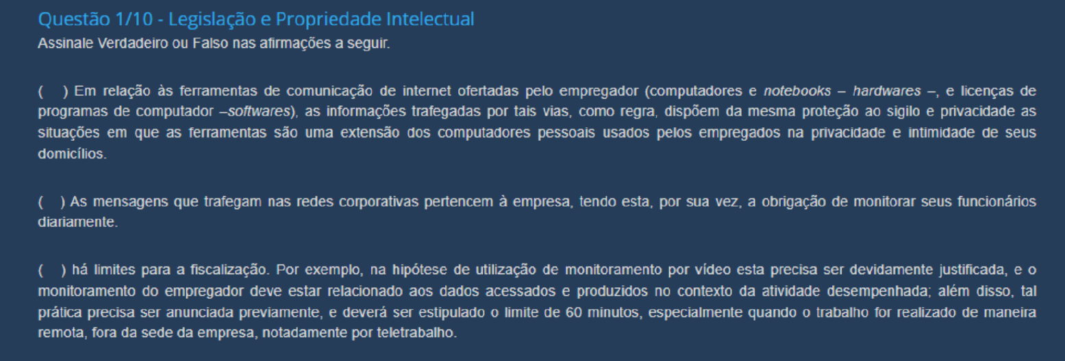 <p>Questão 1/10 - Legislação e Propriedade Intelectual</p><p>Assinale Verdadeiro ou Falso nas afirmacdes a seguir.</p><p>( )Em relação as ferramentas de comunicação de internet ofertadas pelo empregador (computadores e notebooks — hardwares —, e licenças de</p><p>programas de computador —softwares), as informações trafegadas por tais vias, como regra, dispõem da mesma proteção ao sigilo e privacidade as</p><p>situações em que as ferramentas são uma extensão dos computadores pessoais usados pelos empregados na privacidade e intimidade de seus</p><p>domicilios.</p><p>( ) As mensagens que trafegam nas redes corporativas pertencem a empresa, tendo esta, por sua vez, a obrigacdo de monitorar seus funcionarios</p><p>diariamente.</p><p>( ) ha limites para a fiscalizacdo. Por exemplo, na hipétese de utilizacdo de monitoramento por video esta precisa ser devidamente justificada, e o</p><p>monitoramento do empregador deve estar relacionado aos dados acessados e produzidos no contexto da atividade desempenhada; além disso, tal</p><p>pratica precisa ser anunciada previamente, e devera ser estipulado o limite de 60 minutos, especialmente quando o trabalho for realizado de maneira</p><p>remota, fora da sede da empresa, notadamente por teletrabalho.</p><p>FF,V</p><p>VV F</p><p>FVF</p><p>F,F,F</p><p>Você assinalou essa alternativa (D)</p><p>s, conforme ensi</p><p>VVV</p><p>Questão 2/10 - Legislação e Propriedade Intelectual</p><p>A empresa XAparelhosEletrônicos.ltda estava divulgando, erroneamente, a venda de um notebook última geração por R$200,00 (duzentos reais). Sobre</p><p>esse fato, é possível concluir que:</p><p>Nota: 10.0</p><p>O A O disposto na fase pós-contratual deverá ser cumprido, exceto quando se tratar de um erro grosseiro na divulgação do valor ou na</p><p>descrição do produto, algo que não possa ser exigido por uma pessoa sensata e de boa-fé.</p><p>O B Umavezque a oferta foi no valor de R$200,00 a empresa é obrigada a vender por esse valor, porque não se trata de erro grosseiro.</p><p>C Caso o anunciante atue com ma-fé e anuncie outros produtos em valores descaradamente menores à realidade comercial, com</p><p>propostas que nio pretende cumprir, o consumidor tem o direito de exigir do fornecedor que oferta seja cumprida, nos termos do</p><p>art. 35 do CDC.</p><p>Vocé assinalou essa alternativa (C)</p><p>@ Vocé acertou!</p><p>Gabarito: Alterativa C, conforme ensina a apostila 5, pag. 16.</p><p>Incorreta — pré-contratual</p><p>Incorreta — é erro grosseiro, pois não existe notebook nesse valor</p><p>correta</p><p>Incorreta — Dever exclusivo do fornecedor</p><p>Ativar o Windows</p><p>® D É dever do fonecedor, juntamente com o consumidor, arcar com os prejuizos diante de ocomréncias 8& fraudescoti Htaqaes virtirars o Windows</p><p>Questão 3/10 - Legislação e Propriedade Intelectual</p><p>Assinale V para as alternativas verdadeiras e F para as falsas no tocante ao estudo do Direito objetivo e subjetivo.</p><p>( ) No Direito objetivo estuda-se a norma de comportamento à qual a pessoa deve se submeter, sob pena de, ndo o fazendo, ser submetido à aplicacdo</p><p>de uma sanção institucionalizada pelo Estado.</p><p>( ) No Direito subjetivo estuda-se a possibilidade ou faculdade individual de agir de acordo com o direito. Nela estdo envolvidas as prerrogativas das</p><p>quais um individuo é titular, obtendo certos efeitos juridicos em virtude da norma estabelecida.</p><p>() Por exemplo, o direito objetivo de propriedade de um imével assegura ao seu proprietario as prerrogativas de usar, vender, locar, dar em garantia,</p><p>dentre outros direitos previstos na legislação civil.</p><p>( ) Um exemplo de Direito subjetivo é respeitar as normas de transito imposto ao individuo.</p><p>Nota: 10.0</p><p>VFVF</p><p>VVFV</p><p>FV FRF</p><p>VV FRF</p><p>Você assinalou essa alternativa (D)</p><p>VFFF</p><p>Questão 4/10 - Legislação e Propriedade Intelectual</p><p>Paralelo as facilidades propiciadas pelas TICs, surgiram novas maneiras de criminalidade, amparadas pela nova realidade das relações virtuais, no</p><p>âmbito da internet. Sobre essa temática é possivel afirmar que:</p><p>Nota: 10.0</p><p>® A</p><p>B</p><p>® C</p><p>® D</p><p>ATIC aproxima as pessoas, reduz barreiras e promove facilidades para o dia a dia, ela também promove reflexos sociais positivos uma vez</p><p>que auxilia no combate a criminalidade, favorecendo a seguranca do cidaddo.</p><p>As empresas que adotam macigamente praticas comerciais envolvendo pagamentos, contratos e comércio eletrénicos, tém sido</p><p>vitimas de quadrilhas especializadas em roubo de informagées de clientes (senhas, cartdes de crédito e dados pessoais) e</p><p>clonagem de paginas (phishing, que induz clientes e consumidores ao erro recebendo pagamentos em nome da empresa</p><p>clonada), furto de bases de dados de clientes, fornecedores e colaboradores e sequestro de dados via criptografia (ransomware),</p><p>por meio, inclusive, do uso de técnicas de engenharia social.</p><p>Vocé assinalou essa alternativa (B)</p><p>@ Vocé acertou!</p><p>Gabarito: Alternativa B, apostila 6, pags. 3,4 e 6.</p><p>Quadrilhas estão se especializando em crimes que envolvem o uso de carteiras digitais, inclusive com a presenca da vitima, como € o caso</p><p>de sequestros-reldmpagos para coagir a vitima a realizar pagamentos via TED.</p><p>Diante desses novos fatos sociais e do aprimoramento dos meios utilizados pela criminalidade, Auaàia&mmamm proteção</p><p>do direito civil, que, por sua vez, necessita ser repensado e atualizado para atender adequadaméiite3°sbCiedade” por MElA AA proteção ds</p><p>cidadão, evitando que seus bens jurídicos mais relevantes, quais sejam, sua vida, sua liberdade, sua dignidade, sua privacidade e seu</p><p>Questão 5/10 - Legislação e Propriedade Intelectual</p><p>O artigo 3° da Lei de Introdução às Normas do Direito Brasileiro preceitua que: “Ni