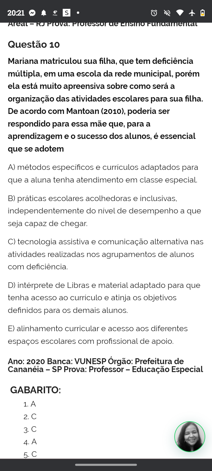 <p>20:21 S - RJ Questão 10 Mariana matriculou sua filha, que tem deficiência múltipla, em uma escola da rede municipal, porém ela está muito apreensiva sobre como será a organização das atividades escolares para sua filha. De acordo com Mantoan (2010), poderia ser respondido para essa mãe que, para a aprendizagem e o sucesso dos alunos, é essencial que se adotem A) métodos específicos e adaptados para que a aluna tenha atendimento em classe especial. B) práticas escolares acolhedoras e inclusivas, independentemente do nível de desempenho a que seja capaz de chegar. C) tecnologia assistiva e comunicação alternativa nas atividades realizadas nos agrupamentos de alunos com deficiência. D) intérprete de Libras e material adaptado para que tenha acesso ao e atinja os objetivos definidos para os demais E) alinhamento curricular e acesso aos diferentes espaços escolares com profissional de apoio. Ano: 2020 Banca: VUNESP Órgão: Prefeitura de Cananéia - SP Prova: Professor - Educação Especial GABARITO: 2. C 3. C 4. A 5. C</p>