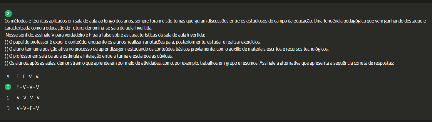 <p>3 Os métodos e técnicas aplicados em sala de aula ao longo dos anos, sempre foram e são temas que geram discussões entre os estudiosos do campo da educação. Uma tendência pedagógica que vem ganhando destaque e caracterizada como a educação do futuro, denomina-se sala de aula invertida. Nesse sentido, assinale V para verdadeiro e F para falso sobre as características da sala de aula invertida: () papel do professor é expor conteúdo, enquanto os alunos realizam anotações para, posteriormente, estudar e realizar exercícios. () aluno tem uma posição ativa no processo de aprendizagem, estudando conteúdos básicos previamente, com auxílio de materiais escritos e recursos tecnológicos. () professor em sala de aula estimula a interação entre a turma e esclarece as dúvidas. () Os alunos, após as aulas, demonstram que aprenderam por meio de atividades, como, por exemplo, trabalhos em grupo e resumos. Assinale a alternativa que apresenta a correta de respostas: A F-F-V-V B D</p>