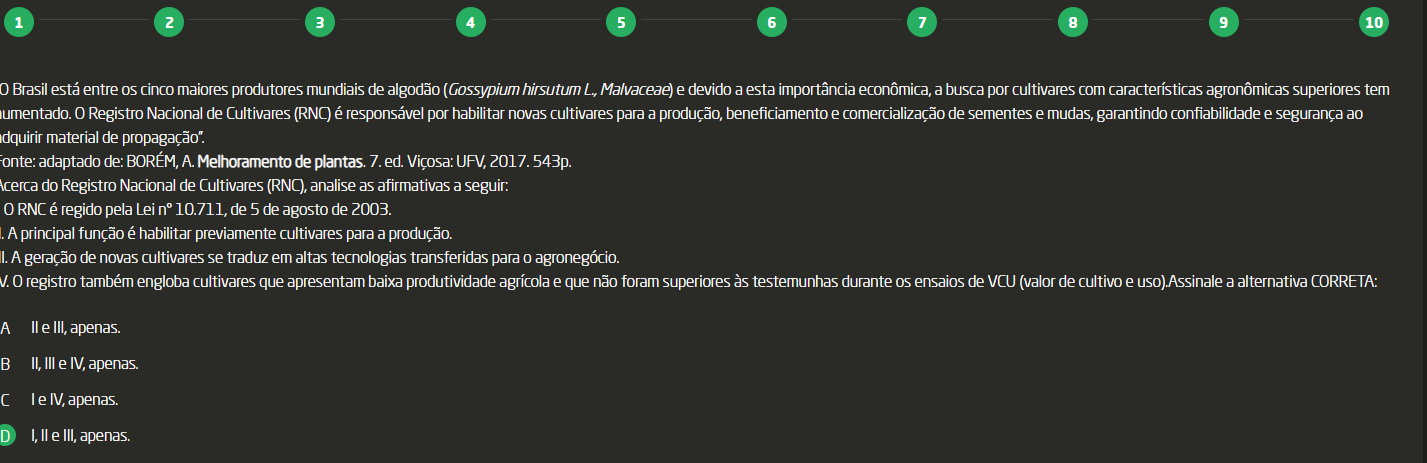 <p>1 3 4 5 6 7 8 9 10 0 Brasil está entre cinco maiores produtores mundiais de algodão (Gossypium hirsutum Malvaceae) e devido a esta importância econômica, a busca por cultivares com características agronômicas superiores tem Registro Nacional de Cultivares (RNC) é responsável por habilitar novas cultivares para a beneficiamento e comercialização de sementes e mudas, garantindo confiabilidade e segurança ao material de fonte: adaptado de: BORÉM, A. Melhoramento de plantas. 7. ed. UFV, 2017.5 543p. Acerca do Registro Nacional de Cultivares (RNC), analise as afirmativas a RNC é regido pela Lei 10.711, de 5 de agosto de 2003. A principal função é habilitar previamente cultivares para a produção A geração de novas cultivares se traduz em altas tecnologias transferidas para agronegócio. V. 0 registro também engloba cultivares que apresentam baixa produtividade agrícola e que não foram superiores às testemunhas durante ensaios de VCU (valor de cultivo e uso).Assinale a alternativa CORRETA: A e III, apenas. B II, III e IV, apenas. C I e IV, apenas. D I, II e III, apenas.</p>