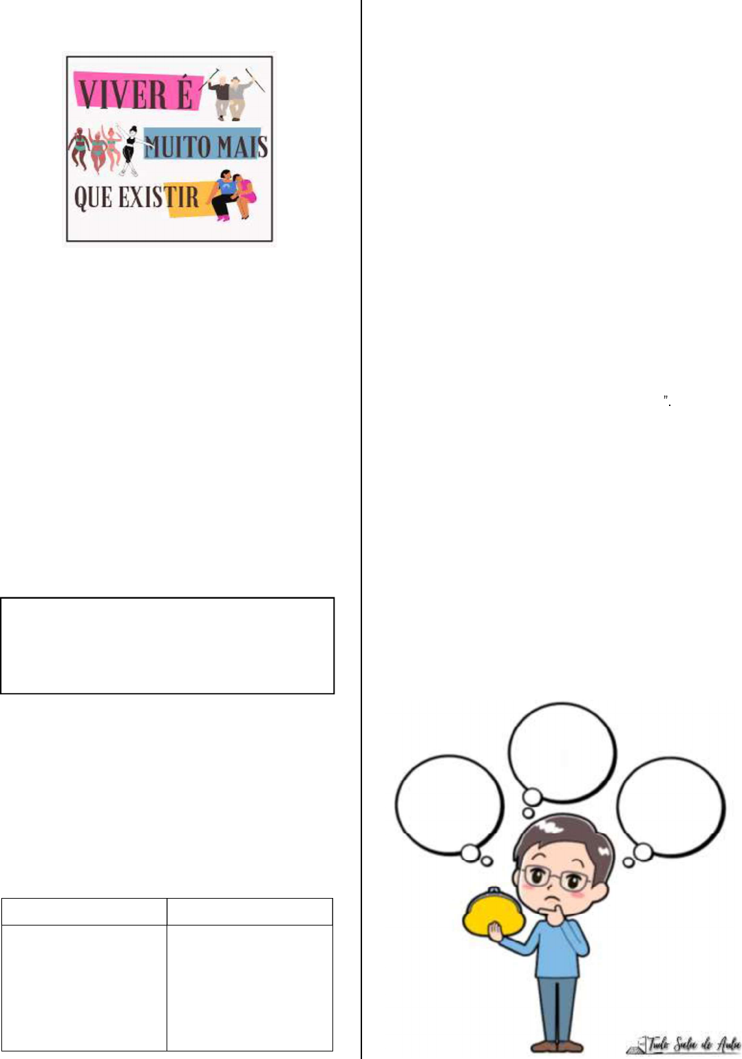 <p>2. Observe os elementos verbais e não verbais da</p><p>imagem.</p><p>Em sua opinião, qual mensagem a imagem busca</p><p>transmitir?</p><p>___________________________________________</p><p>___________________________________________</p><p>___________________________________________</p><p>3. A metáfora do livro em branco, mencionada no texto,</p><p>compara a vida a um livro onde a "existência" é</p><p>equiparada a um elemento específico. De acordo com</p><p>a metáfora do livro em branco, a "existência" é</p><p>comparada a qual componente do livro?</p><p>a) A tinta que preenche as páginas.</p><p>b) Apenas as atividades diárias.</p><p>c) A busca por propósito.</p><p>d) A ausência de escolhas.</p><p>4. E você, sabe para onde deseja ir? O que espera do</p><p>futuro? Quais caminhos pretende percorrer para chegar</p><p>ao seu objetivo. Escreva no quadro abaixo.</p><p>5. No contexto da discussão sobre "ser" e "existir", qual</p><p>é a implicação fundamental ao contrapor esses dois</p><p>conceitos em relação a um projeto de vida significativo?</p><p>a) Apenas realizar tarefas rotineiras.</p><p>b) Encontrar propósito e autenticidade.</p><p>c) Limitar-se à existência vazia.</p><p>d) Desconsiderar paixões pessoais.</p><p>6. No quadro abaixo aponte as diferenças entre ser e</p><p>existir.</p><p>SER EXISTIR</p><p>7. Como a ideia de "ser" e "existir" se relaciona com a</p><p>criação de um projeto de vida significativo? Explique</p><p>como equilibrar esses dois conceitos pode influenciar a</p><p>maneira como vivemos nossas vidas.</p><p>___________________________________________</p><p>___________________________________________</p><p>___________________________________________</p><p>8. No texto, é mencionado que a existência por si só</p><p>pode parecer vazia sem atribuirmos um propósito mais</p><p>profundo a ela. Como isso se relaciona com a noção de</p><p>"ser"? Dê exemplos de como encontrar um propósito</p><p>pode transformar nossa existência em algo mais</p><p>significativo.</p><p>___________________________________________</p><p>___________________________________________</p><p>___________________________________________</p><p>9. O texto compara a vida a um livro em branco, onde a</p><p>existência é a tinta e o "ser" é o enredo. Como essa</p><p>metáfora ajuda a entender a importância de ter um</p><p>projeto de vida? Explique como a metáfora ilustra a</p><p>ideia de transformar momentos simples em</p><p>experiências valiosas por meio do ato de "ser</p><p>___________________________________________</p><p>___________________________________________</p><p>___________________________________________</p><p>10. Marque a alternativa que considera o conceito</p><p>discutido no texto sobre a relação entre "ser" e "existir"</p><p>em um projeto de vida significativo.</p><p>a) Encontrar apenas um propósito profundo.</p><p>b) Focar apenas nas atividades diárias.</p><p>c) Equilibrar propósito e atividades cotidianas.</p><p>d) Ignorar completamente a existência.</p><p>11. Agora que você já sabe a diferença entre ser e</p><p>existir, no contexto de sua vida, o que você tem feito</p><p>para ser e não apenas existir.? Escreva nos balões de</p><p>fala abaixo.</p>