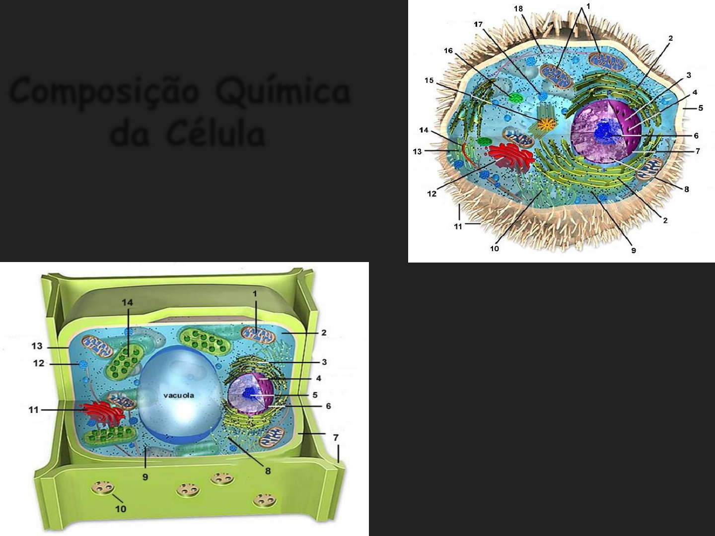 <p>Composição Química</p><p>da Célula</p><p>PROF. Msc. JULIANO RIBAS IGNEZ</p><p>Composição Química da Célula</p><p>Inorgânicos</p><p> Água</p><p> Sais Minerais</p><p>Orgânicos</p><p> Proteínas</p><p> Lipídios</p><p> Carboidratos</p><p> Àcidos Nucléicos</p><p>Composição Química da Célula</p><p> Carboidratos</p><p>Fonte de energia; função estrutural</p><p> Proteínas</p><p>Inúmeras funções biológicas (todo o trabalho celular)</p><p> Ácidos Nucléicos</p><p>Armazenas as informações genéticas</p><p>Polímeros Biológicos</p><p>CONSTITUIÇÃO CELULAR</p><p>POLARIDADE</p><p>• A molécula de água é formada por dois átomos de Hidrogênio e um de</p><p>Oxigênio (H2O).</p><p>Oxigênio</p><p>Hidrogênio</p><p>ENCONTRA-SE NA CÉLULA</p><p>✓ Na forma livre</p><p>Representa 95% da água total, é a parte usada principalmente</p><p>como solvente para os solutos e como meio dispersante</p><p>ÁGUA</p><p>✓ A água é um solvente universal.</p><p>✓ A água é um regulador de temperatura.</p><p>✓ A água é um lubrificante ideal,</p><p>✓ A água participa de reações</p><p>químicas</p><p>✓ A água atua como mecanismo de</p><p>proteção</p><p>PROTEÍNAS</p><p>• São constituintes básicos da vida;</p><p>• São macromoléculas complexas;</p><p>• Constituem cerca de 50 a 80% do peso seco da célula eucariótica;</p><p>• Tem como base de sua estrutura os polipeptídios formados de</p><p>ligações peptídicas entre os grupos amino (-NH2) de um aminoácido e</p><p>carboxílico (-COOH) de outro, ambos ligados ao carbono alfa de cada</p><p>um dos aminoácidos;</p><p>AMINOÁCIDOS</p><p>AMINOÁCIDOS</p><p>• Um peptídio é formado quando alguns aminoácidos se unem</p><p>através de ligações peptídicas.</p><p>• A formação de um polipetídio ocorre quando diversos aminoácidos</p><p>se unem.</p><p>• As proteínas são polipeptídios muito grandes, sendo que a</p><p>maioria das proteínas é composta por mais de uma cadeia de</p><p>polipeptídeos.</p><p>PROTEÍNAS</p><p>Tipo Função</p><p>Proteínas estruturais</p><p>Componentes das membranas</p><p>celulares</p><p>Desempenham diversas funções: determinam o</p><p>diâmetro dos poros; auxiliam os hormônios no</p><p>“reconhecimento” celular</p><p>Colágeno Componente estrutural dos músculos e</p><p>tendões</p><p>Queratina Parte da pele e do pêlo</p><p>Hormônios peptídicos (p. ex., insulina,</p><p>hormônio do crescimento)</p><p>Muitos hormônios são proteínas e exercem</p><p>efeitos sobre diversos sistemas orgânicos</p><p>Hemoglobina Transporte de oxigênio</p><p>Anticorpos Protegem o corpo contra organismos</p><p>causadores de doenças</p><p>Proteínas plasmáticas Coágulo sangüíneo; equilíbrio de líquidos</p><p>Proteínas musculares Tornam o músculo capaz de contrair</p><p>Enzimas Regulam os padrões das reações químicas</p><p>CLASSIFICAÇÃO DAS PROTEÍNAS</p><p>Quanto à composição:</p><p>✓ Proteínas simples</p><p>Ex. albuminas, globulinas</p><p>✓ Proteínas conjugadas</p><p>Ex. hemeproteínas, lipoproteínas, glicoproteínas</p><p>CLASSIFICAÇÃO DAS PROTEÍNAS</p><p>Quanto à forma:</p><p>✓ Proteínas fibrosas: são insolúveis em água, compridas e filamentosas.</p><p>A maioria tem função estrutural ou protetiva. Ex. colágeno</p><p>✓ Proteínas globulares: geralmente solúveis em água, formam estruturas</p><p>compactas fortemente enroladas em forma globular ou esférica.</p><p>✓ Função relacionada com manutenção e regularização de processos</p><p>vitais: enzimática, transporte, defesa e hormonal.</p><p>Ex.hemoglobina.</p><p>CARBOIDRATOS</p><p>• Os carboidratos são também conhecidos como glicídios ou açúcares,</p><p>sendo as moléculas biológicas mais abundantes na natureza.</p><p>• São compostos por carbono, hidrogênio e oxigênio.</p><p>• Representam a principal fonte de energia para a célula.</p><p>• Abrangem um dos maiores grupos de compostos orgânicos</p><p>encontrados na natureza.</p><p>• Junto com as proteínas formam os principais constituintes dos</p><p>organismos vivos.</p><p>CLASSIFICAÇÃO DOS CARBOIDRATOS</p><p>MONOSSACARÍDEOS</p><p>• São compostos com uma fórmula geral Cn(H2O), que não</p><p>podem ser hidrolisados a compostos mais simples.</p><p>• Contêm de três a seis átomos de carbono.</p><p>• Exemplos: Glicose, Frutose e Galactose</p><p>• Glicose é o mais importante dos três e é utilizada pelas</p><p>células como fonte imediata de energia.</p><p>CLASSIFICAÇÃO DOS CARBOIDRATOS</p><p>MONOSSACARÍDEOS</p><p>Ribose Desoxirribose</p><p>CLASSIFICAÇÃO DOS CARBOIDRATOS</p><p>MONOSSACARÍDEOS</p><p>UTILIZAÇÃO DA GLICOSE</p><p>• A glicose é utilizada de três maneiras:</p><p>✓ pode ser queimada imediatamente como combustível.</p><p>✓ pode ser armazenada como glicogênio para queima</p><p>posterior.</p><p>✓ pode ser armazenada sob a forma de gordura.</p><p>CLASSIFICAÇÃO DOS CARBOIDRATOS</p><p>DISSACARÍDEOS OU OLIGOSSACARÍDEOS</p><p>• São açúcares duplos, contendo duas moléculas de</p><p>monossacarídeos.</p><p>• Na grande maioria são compostos cristalinos, solúveis em</p><p>água e de sabor doce.</p><p>• Exemplos: Sacarose, Lactose e Maltose.</p><p>CLASSIFICAÇÃO DOS CARBOIDRATOS</p><p>DISSACARÍDEOS OU OLIGOSSACARÍDEOS</p><p>CLASSIFICAÇÃO DOS CARBOIDRATOS</p><p>POLISSACARÍDEOS</p><p>• São formadas por três ou mais moléculas de</p><p>açúcares.</p><p>• Podem ser chamadas de glicanas.</p><p>• Os três polissacarídeos de interesse para nós são o</p><p>amido, o glicogênio e a celulose.</p><p>CLASSIFICAÇÃO DOS CARBOIDRATOS</p><p>POLISSACARÍDEOS</p><p>• O amido é um depósito de polissacarídeo encontrado nas plantas e é</p><p>constituído por uma série de moléculas de glicose ligadas entre si de</p><p>forma ramificada.</p><p>• O glicogênio, também conhecido como “amido animal”, é um</p><p>polissacarídeo altamente ramificado, similar ao am